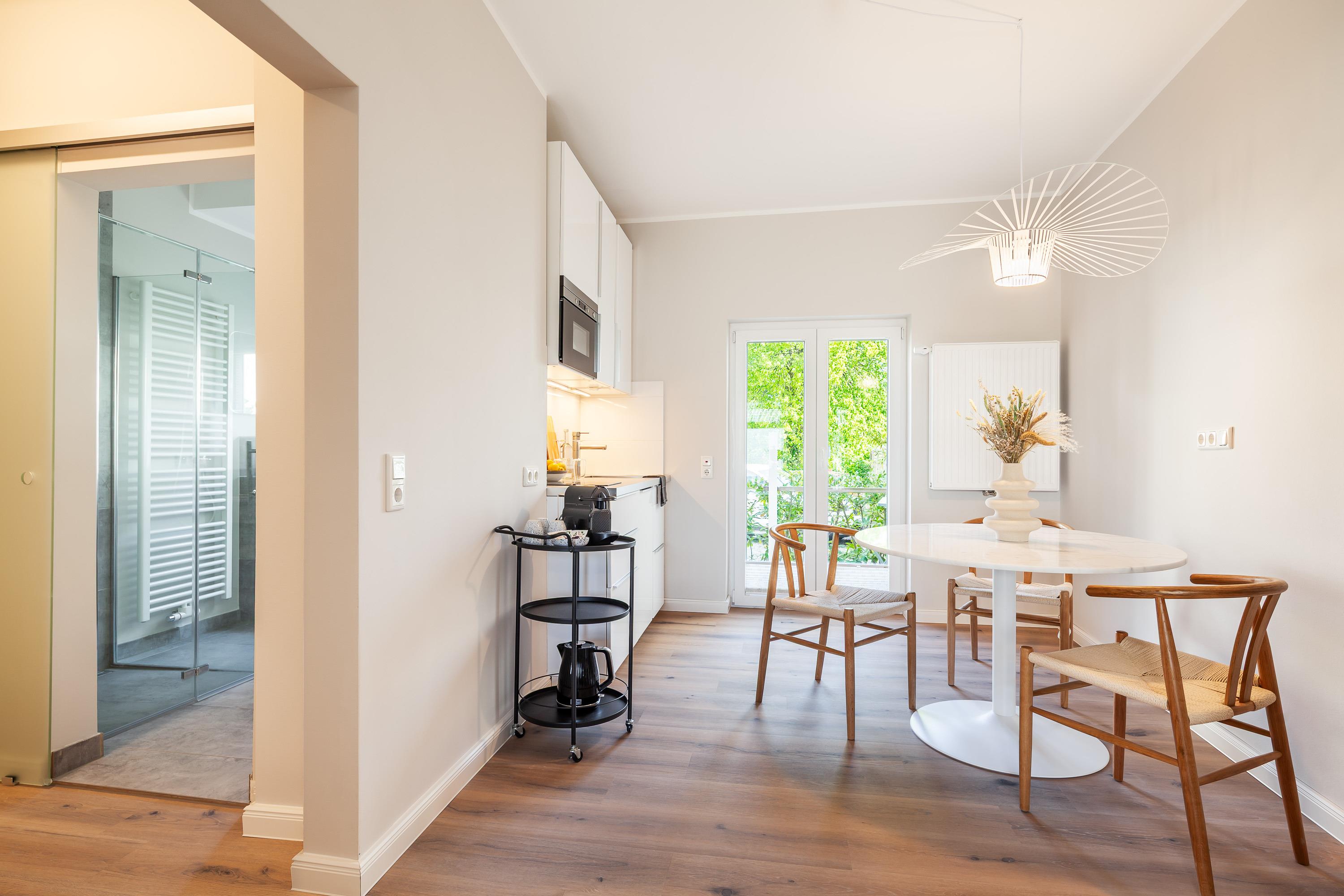 Der einladende Wohnraum verfügt über eine moderne Küchenzeile, die mit einer Mikrowelle, einer Induktionsherdplatte mit 2 Kochfeldern, einem Kühlschrank mit Gefrierfach, einem Toaster, einer Nespresso-Kaffeemaschine und einem Wasserkocher ausgestattet ist. Ein gemütlicher Essbereich lädt zu gemeinsamen Mahlzeiten ein. Für Unterhaltung sorgt ein moderner Smart-TV sowie kostenfreies W-LAN.
