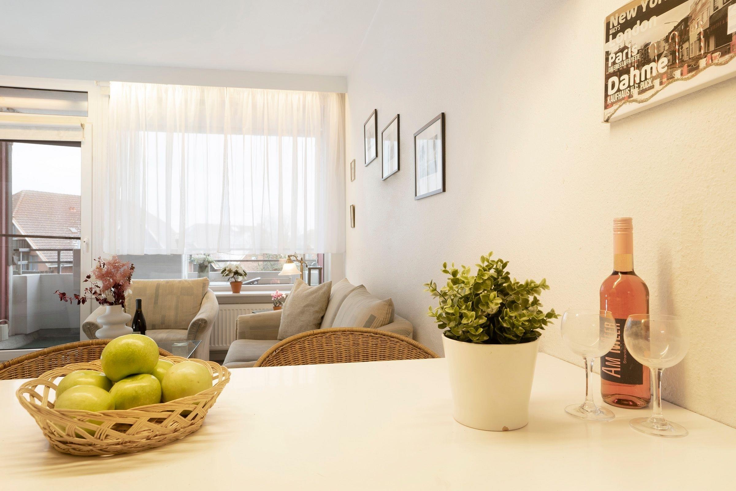 Gemütliche Ferienwohnung mit Balkon, Pool und Strandnähe in Dahme, ideal für 2 Erwachsene und 1 Kind.