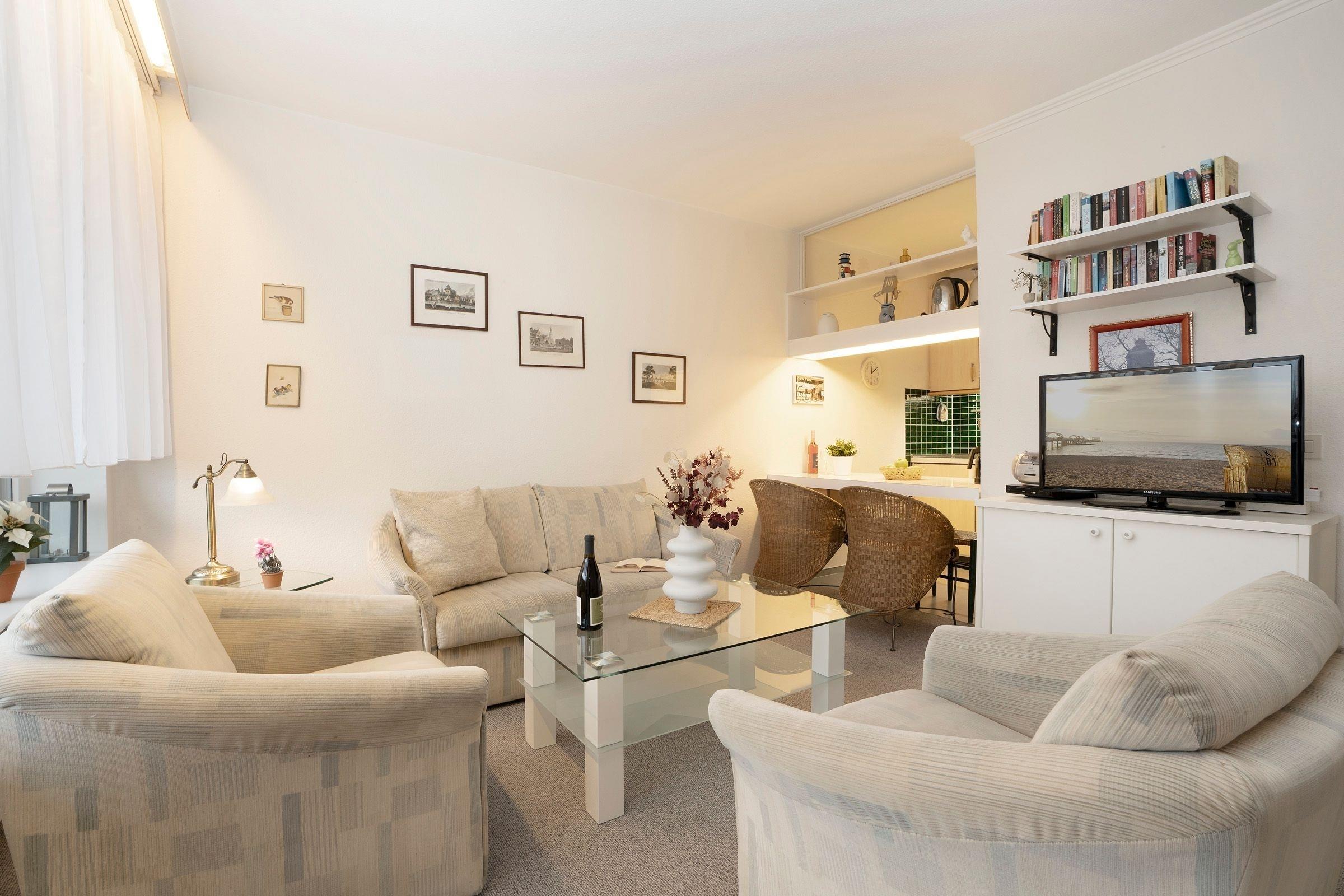 Hell und gemütlich eingerichtet erwartet Sie ein kombinierter Wohn- und Schlafraum. Das komfortable Schrankbett (2x 80x 200 cm) und ein bequemer Schlafsessel (80x200 cm) dienen als Schlafmöglichkeiten im Wohnbereich. Die gut ausgestattete Küche z. B. mit Mikrowelle mit Back- und Grillfunktion ist geschlossen, aber durch einen Küchentresen mit Sitzmöglichkeit mit dem Wohnbereich verbunden. Das innenliegende Badezimmer verfügt über eine Badewanne. Auf dem überdachten und möblierten Balkon können Sie die Morgensonne beim Frühstück genießen.