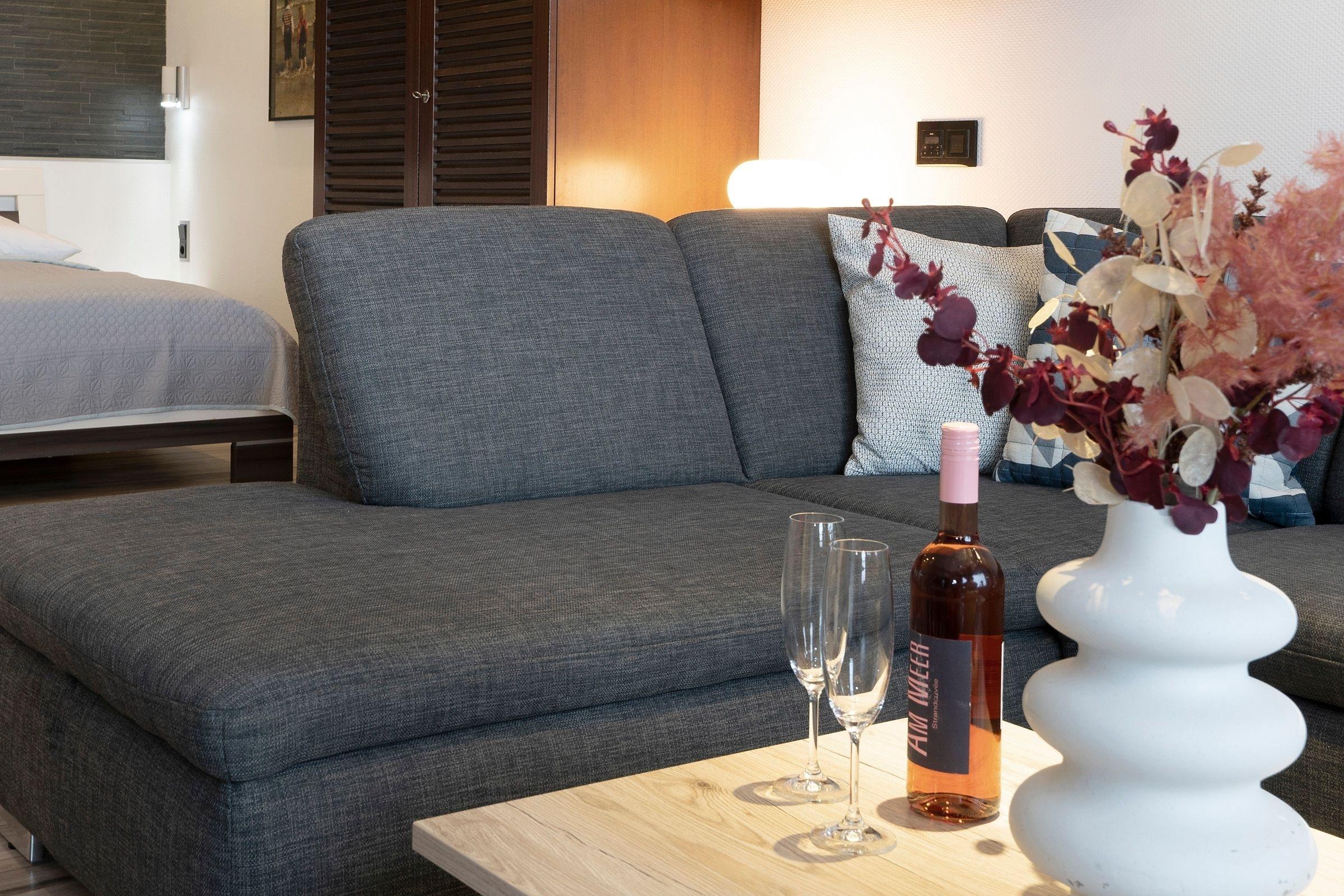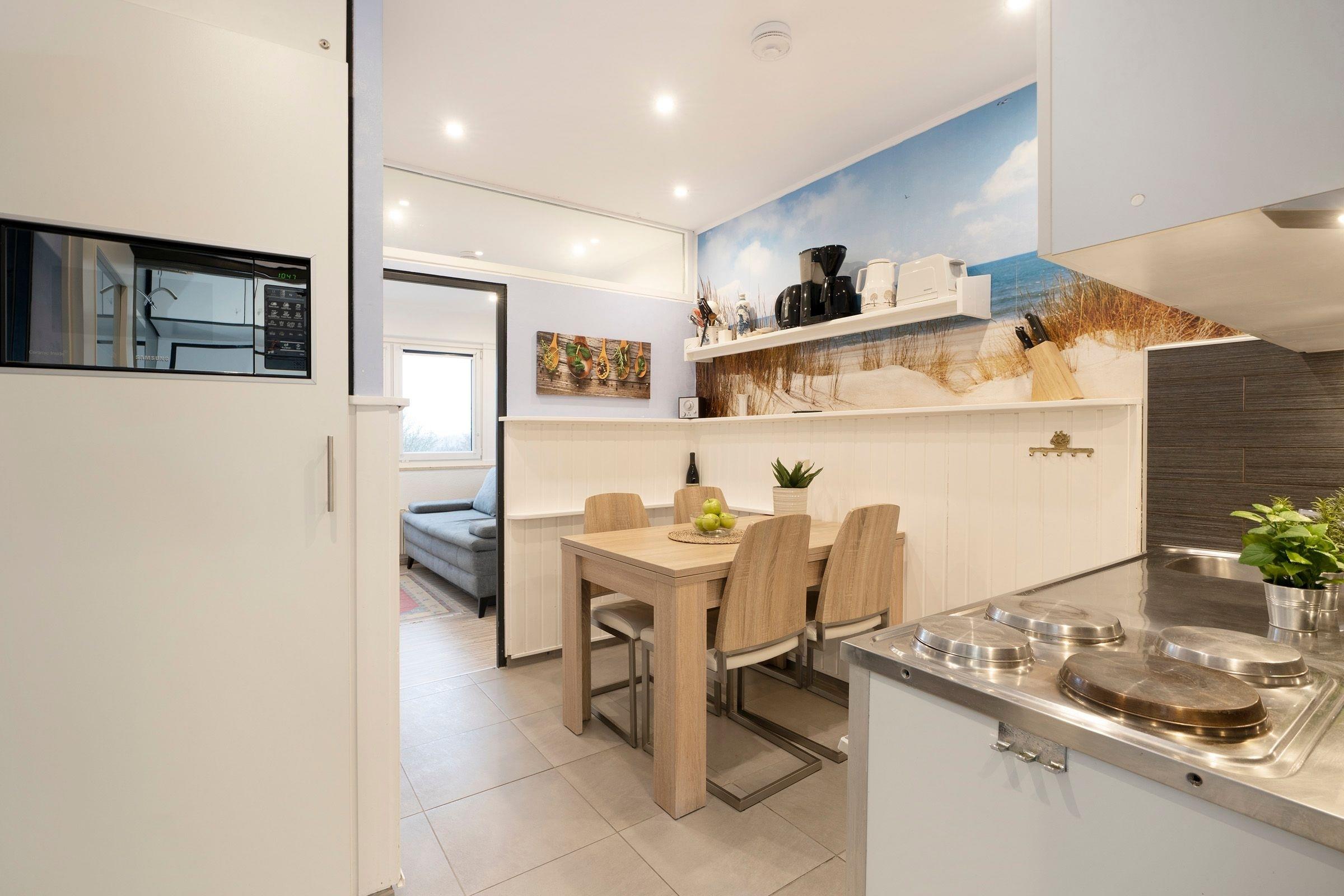 Die Wohnung verfügt über einen kombinierten Wohn- und Schlafbereich mit Doppelbett (2x 90x200 cm), einen Kleiderschrank, ein Ecksofa und einen Fernseher sowie über ein separates Schlafzimmer mit zwei gemütlichen, ausklappbaren Schlafsesseln (140x200 cm) und einem weiteren Kleiderschrank. Die gut ausgestattete Küche mit Esstisch, eine kleiner Flur mit Garderobe sowie das moderne Badezimmer mit Dusche runden diese Wohnung geschmackvoll ab. Ein Highlight sind das einzigartige Design-Lichtkonzept sowie der große Flachbildfernseher im Wohnbereich. Vom überdachten, möblierten Balkon aus können Sie den Tag entspannt ausklingen lassen. Natürlich verfügt die Wohnung über einen kostenlosen WLAN-Anschluss.