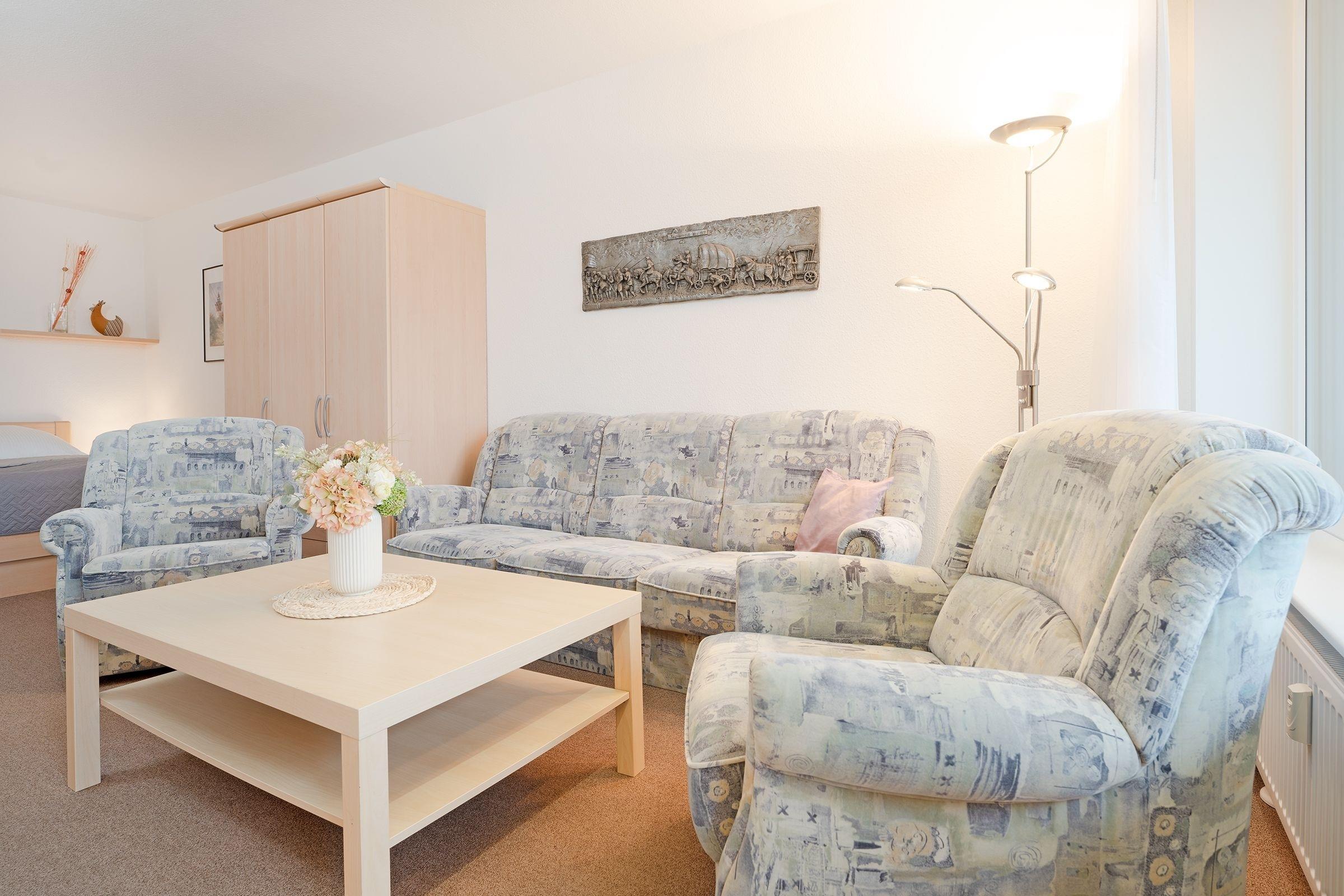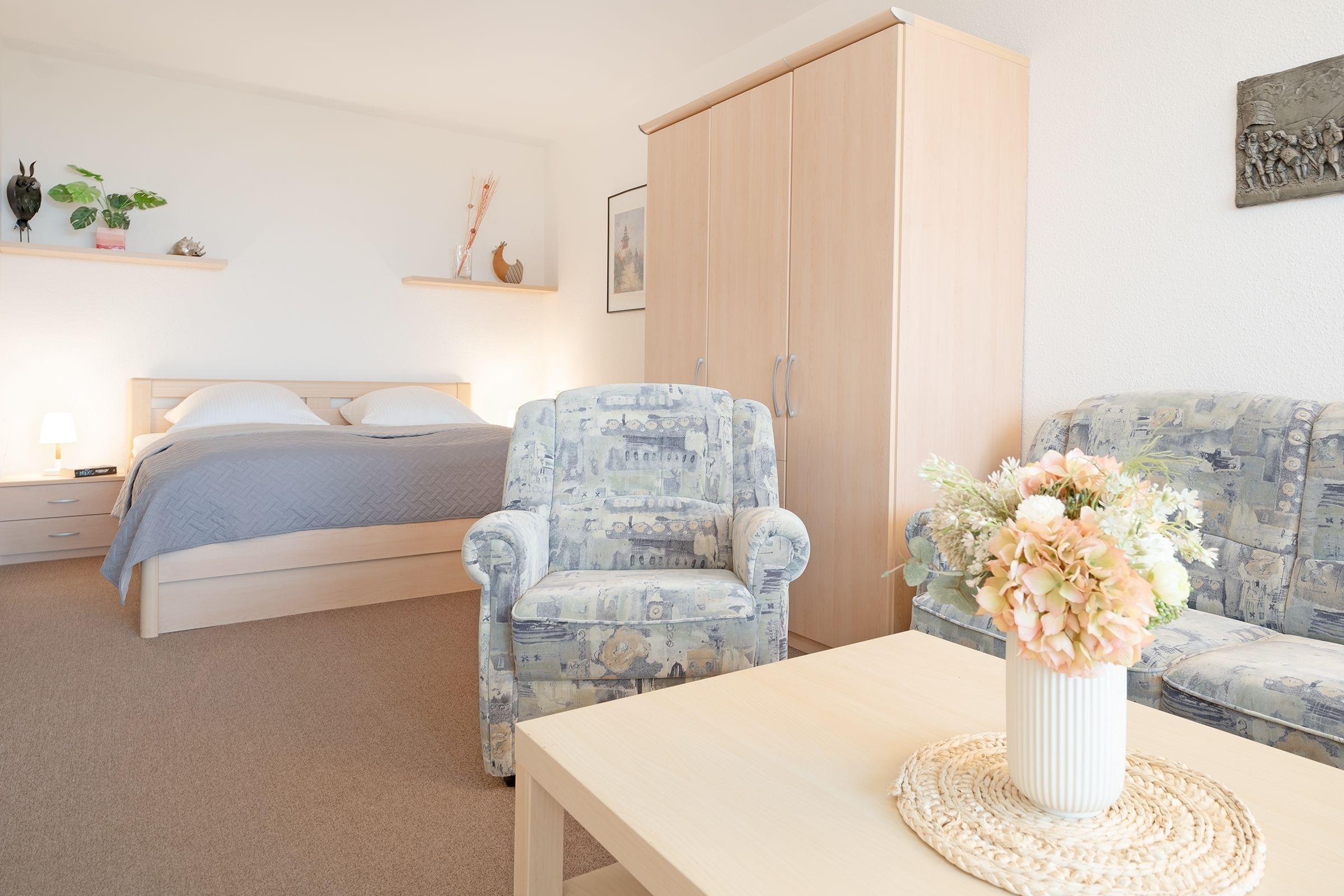 Ein gemütlich eingerichteter, kombinierter Wohn- und Schlafraum mit einem Schlafsofa, zwei Sesseln sowie Zugang zum überdachten, möblierten Balkon erwarten Sie. Als Schlafmöglichkeit dienen das Doppelbett (ca. 2x 90x200 cm) sowie ein Kojenbett (2x 80x200 cm) im separaten Schlafzimmer. Für Ihre Kleidung sind ein großer Kleiderschrank im Wohnzimmer und eine Kommode im separaten Schlafzimmer vorhanden. Die separate Küche mit Esstisch ist gut ausgestattet und verfügt sogar über einen Backofen in komfortabler Arbeitshöhe. Im innenliegenden Badezimmer sorgt eine Badewanne für Erholung nach einem langen Tag am Strand. Genießen Sie den Blick vom Balkon auf die holsteinische Schweiz und den wunderschönen Sonnenuntergang in den Abendstunden. Der WLAN-Anschluss ist inklusive. Für die kleinen Gäste steht ein Kinderreisebett sowie ein Hochstuhl bereit.