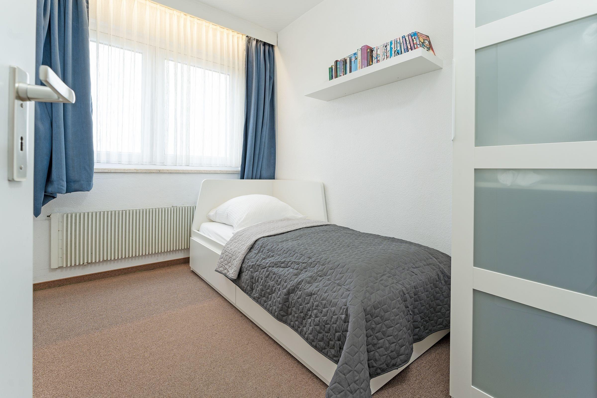 Schlafzimmer: 1 Kojenbett (2x 80x200 cm), Kommode, Platz für Babybett vorhanden (wenn Kojenbett nicht ausgezogen)