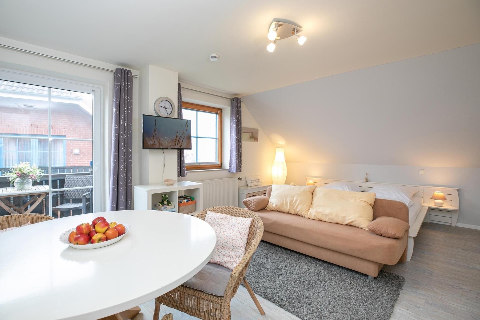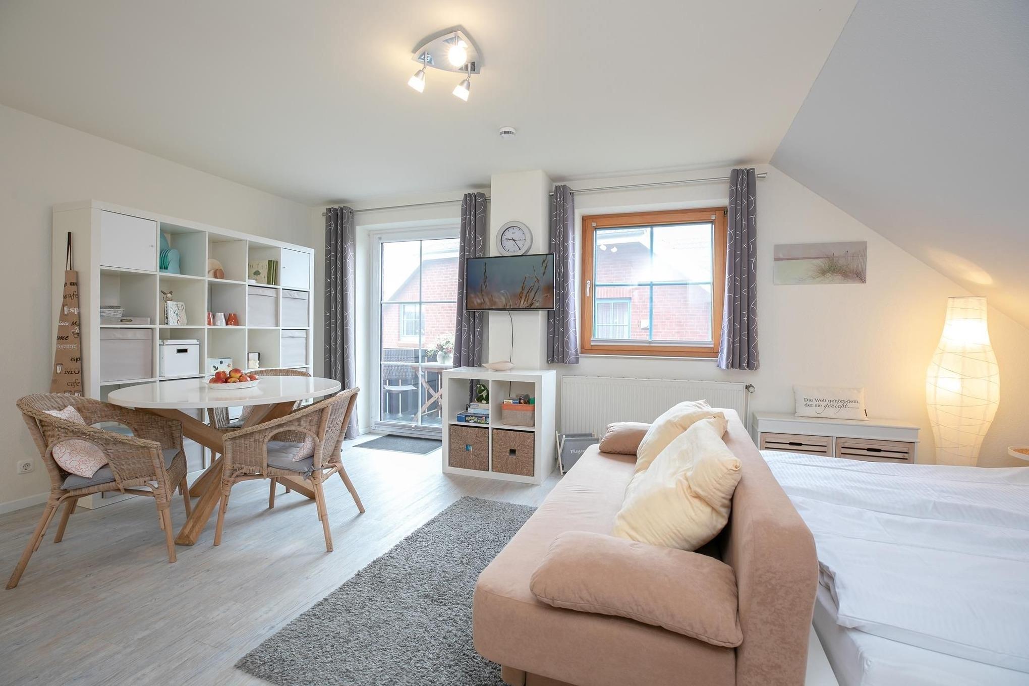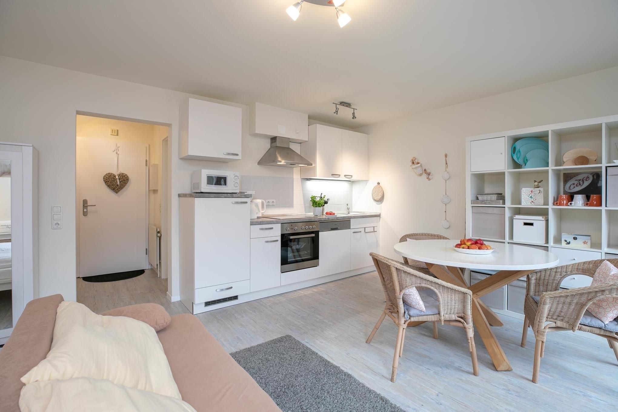 Bis zu 2 Personen und 1 Baby finden hier auf kleinem Raum alles, was es für einen erholsamen Urlaub braucht. Ein Sofa für gemütliche Stunden vor dem Flachbildfernseher bildet das Zentrum dieses Domizils und trennt optisch den Schlaf- vom Wohn- und Kochbereich ab. Über den kostenlosen WLAN-Anschluss streamen Sie Ihre Lieblingsmusik. Das große Doppelbett (2x 90x200 cm) wird Ihnen behagliche Nächte bereiten und ein Kleiderschrank bietet Platz für Ihre Urlaubsgarderobe. Auch in der offenen, voll ausgestatteten Küchenzeile wird es Ihnen an nichts fehlen, sogar eine Spülmaschine kümmert sich um Ihren Abwasch. Zu romantischen Abenden bei einem Glas Wein oder einem Frühstück lädt Sie der möblierte Balkon zum Verweilen ein. Starten Sie im hellgefliesten Bad nach einer erfrischenden Dusche schwungvoll in einen neuen Urlaubstag und erkunden Sie unsere wunderschöne Ostsee.