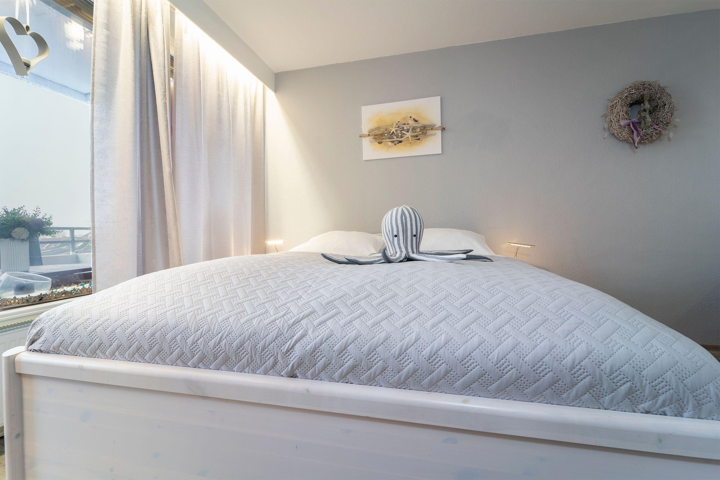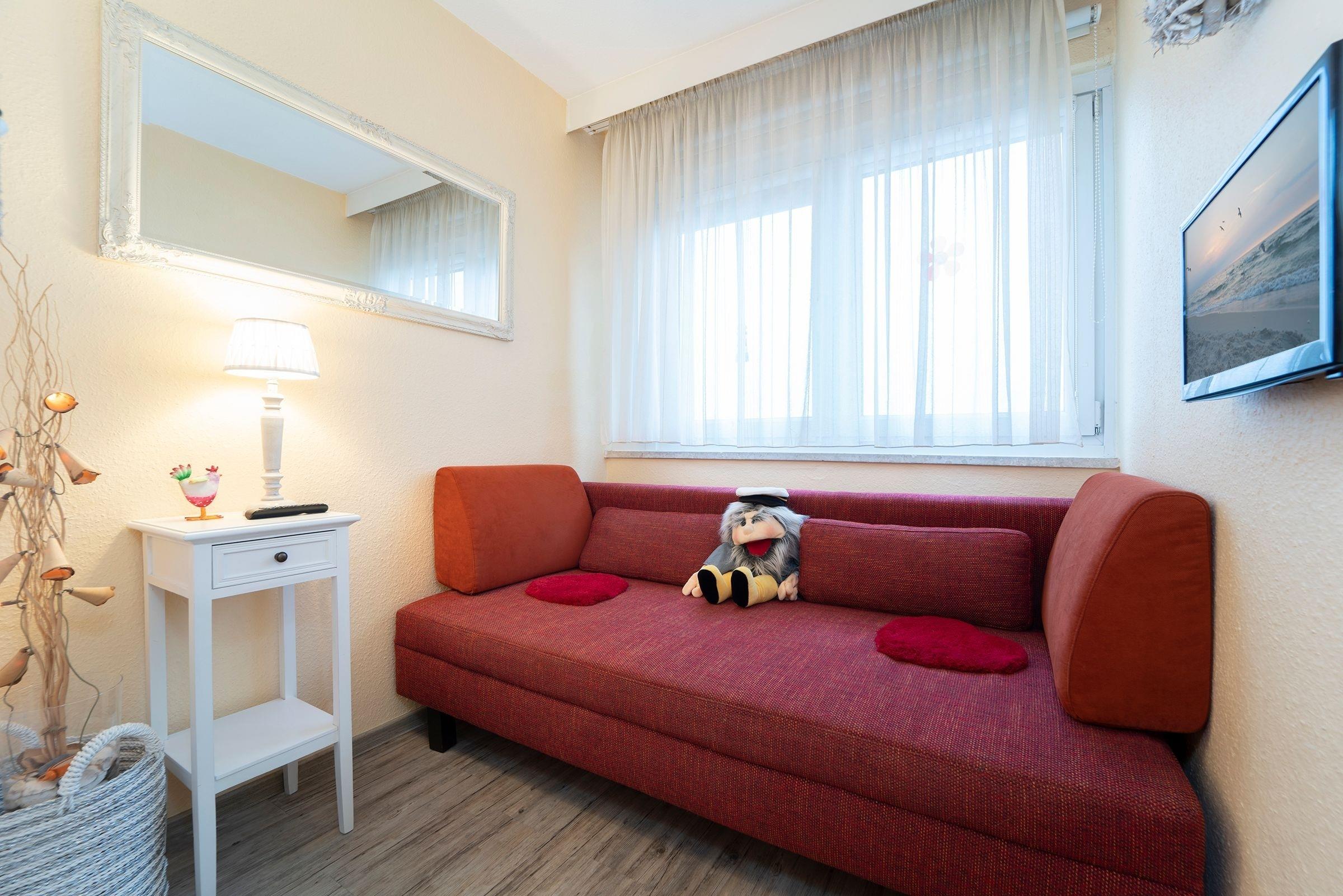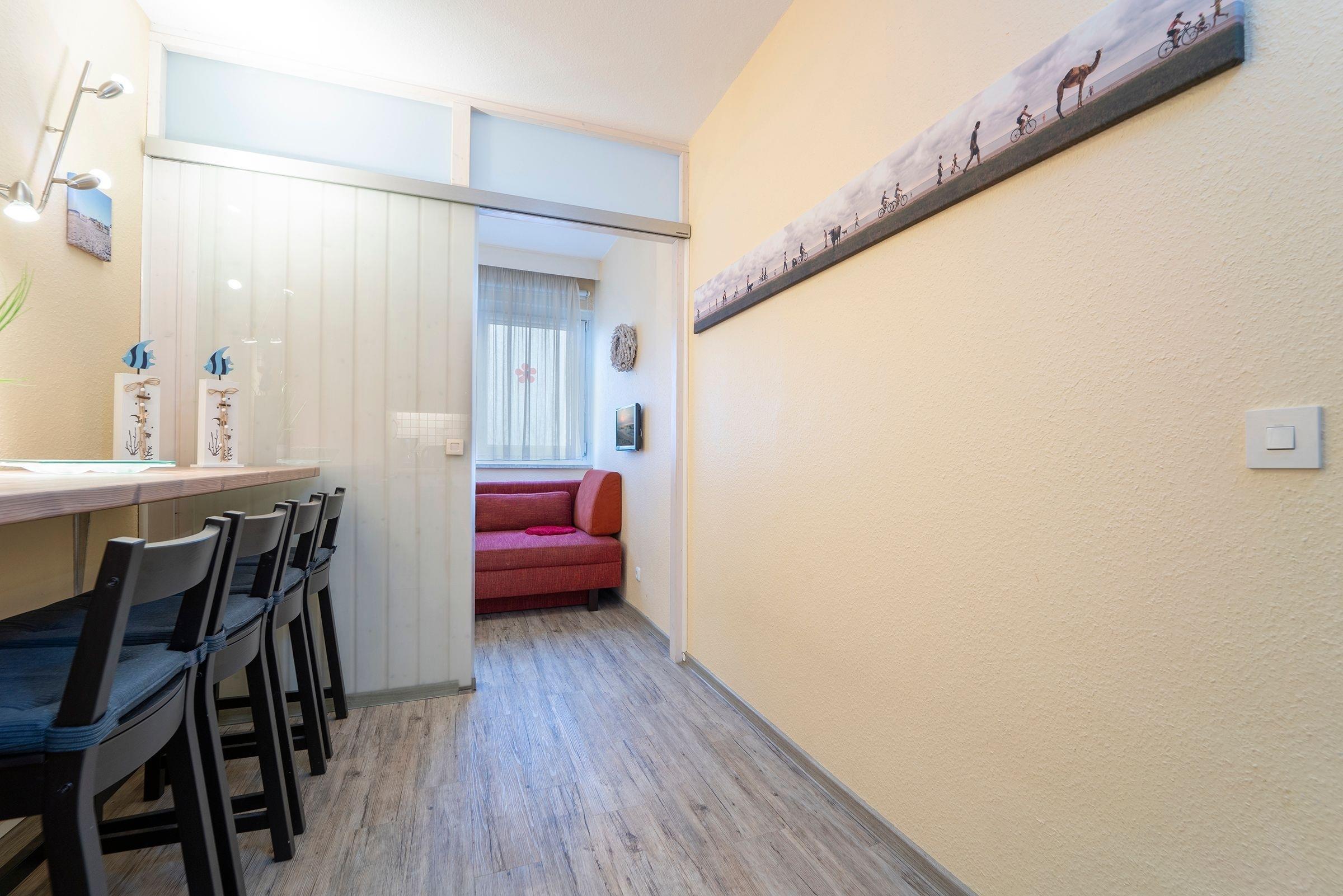 Ein geräumiger Garderobenraum bietet Ihnen viel Stauraum für Ihre Urlaubsgarderobe. Im kombinierten Wohn- und Schlafbereich erwartet Sie ein komfortables Doppelbett (2x 90x200 cm), ein Esstisch mit Platz für 4 Personen sowie ein Flachbildfernseher mit Full-HD-Empfang. Für weitere Unterhaltung im Urlaub sorgen die Stereo-Anlage mit integrierter Docking-Station für iPod/iPhone inklusive Ladestation bzw. MP3/USB-Anschluss und integriertem CD-Spieler sowie eine Wii. Vom Wohnbereich aus gelangen Sie auf den überdachten, möblierten Balkon. Die separate Küche ist z. B. mit einem Geschirrspüler, einem 4-Plattenkochfeld sowie weiteren 4 Sitzmöglichkeiten gut ausgestattet. Durch die Küche gelangen Sie in ein weiteres, kleines Schlafzimmer mit Fenster und ausziehbarer Couch (140x200 cm). Das innenliegende Badezimmer verfügt über eine Badewanne. Der WLAN- und Telefon-Anschluss sind selbstverständlich inklusive.