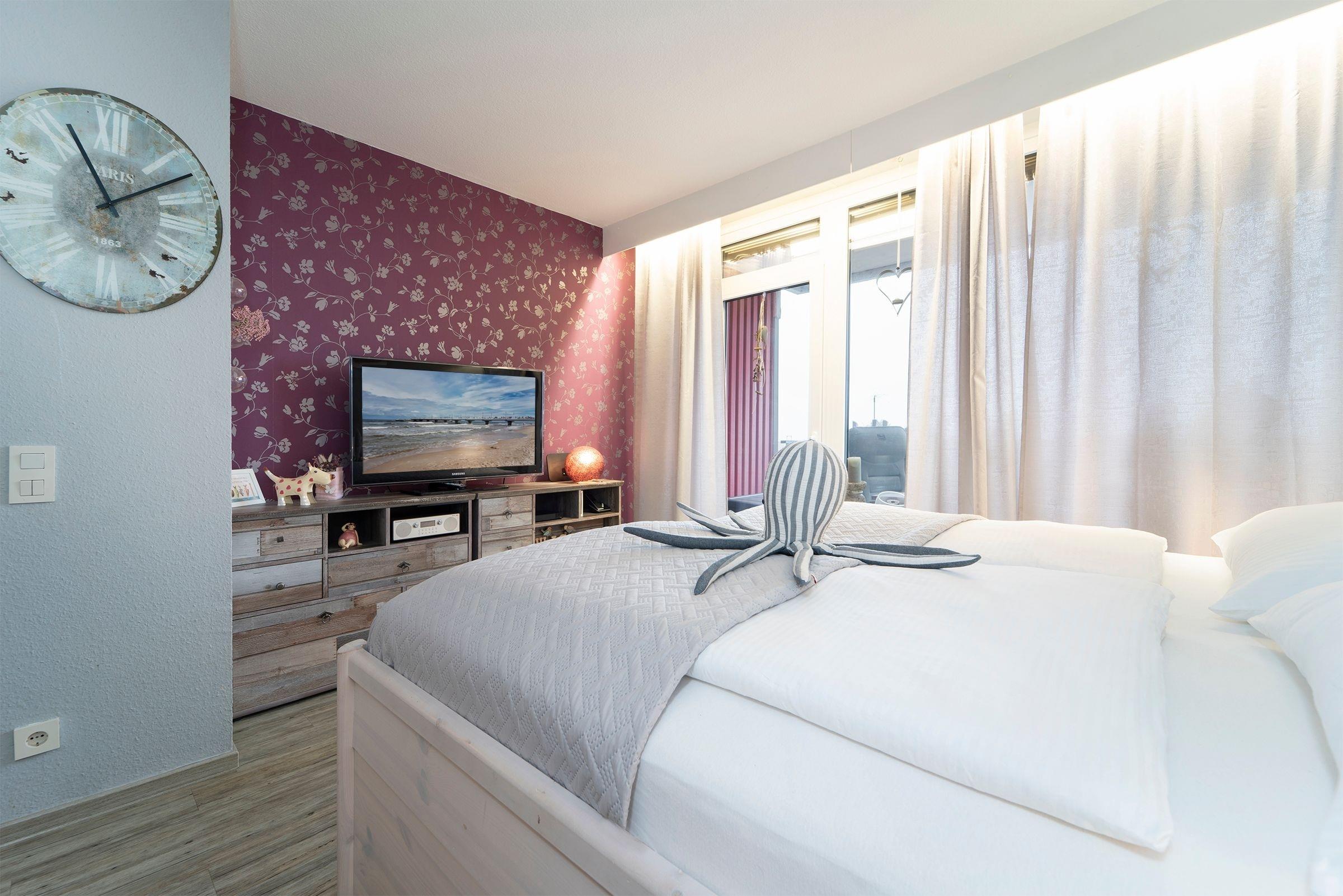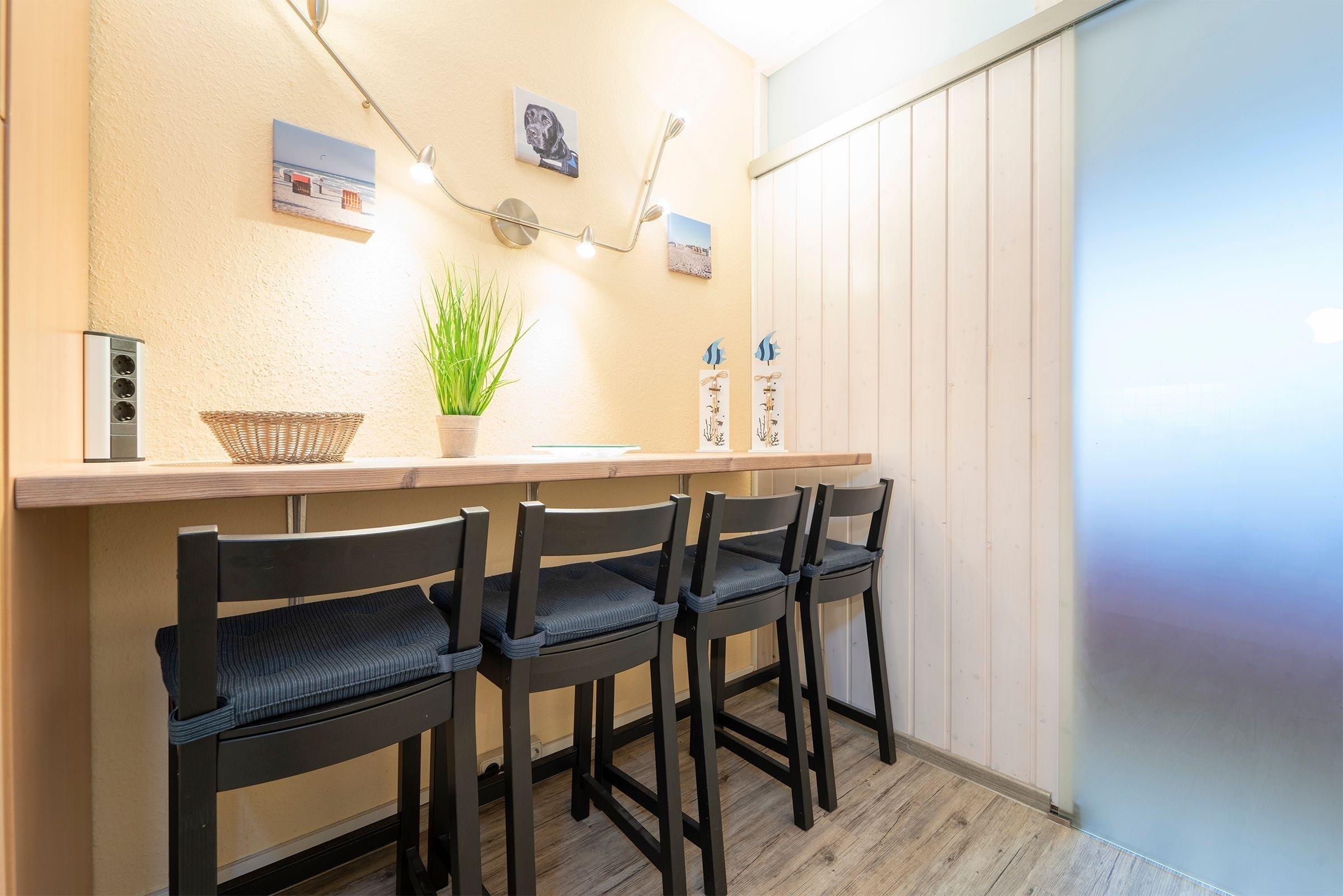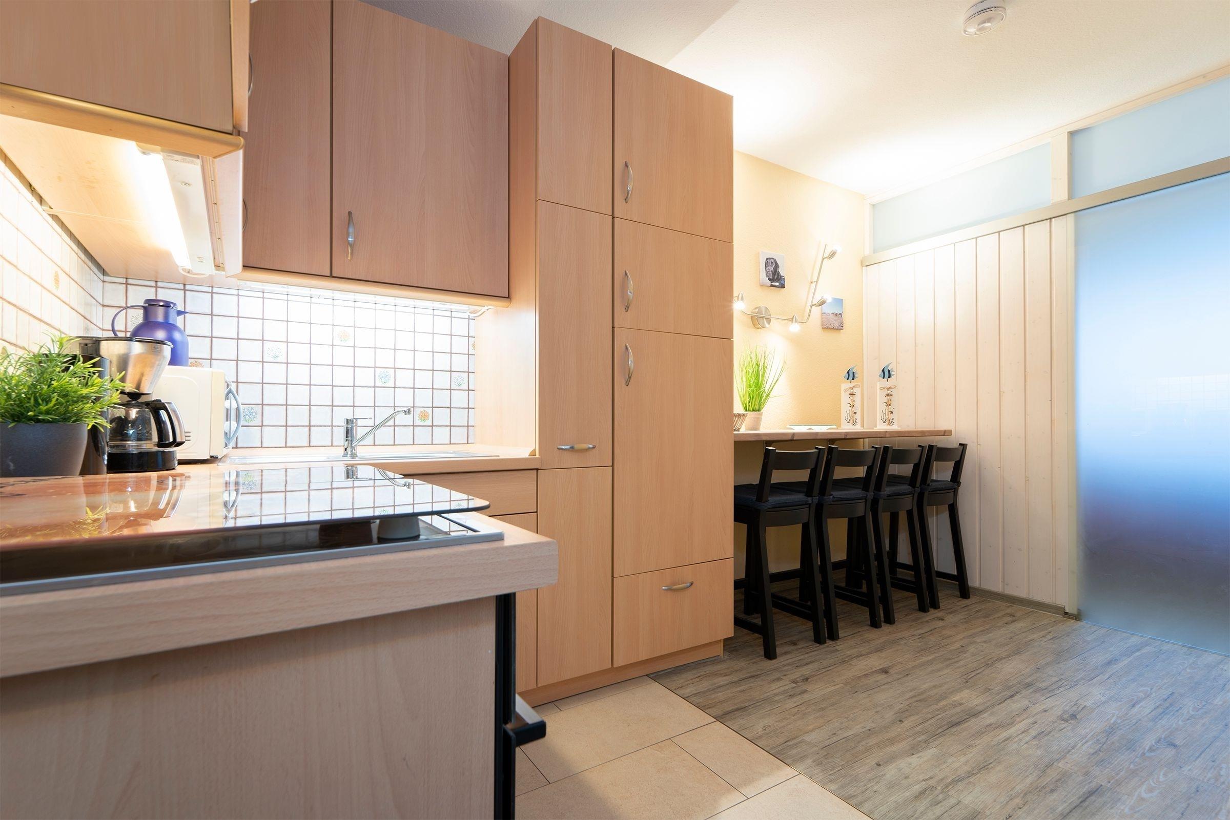 Ein geräumiger Garderobenraum bietet Ihnen viel Stauraum für Ihre Urlaubsgarderobe. Im kombinierten Wohn- und Schlafbereich erwartet Sie ein komfortables Doppelbett (2x 90x200 cm), ein Esstisch mit Platz für 4 Personen sowie ein Flachbildfernseher mit Full-HD-Empfang. Für weitere Unterhaltung im Urlaub sorgen die Stereo-Anlage mit integrierter Docking-Station für iPod/iPhone inklusive Ladestation bzw. MP3/USB-Anschluss und integriertem CD-Spieler sowie eine Wii. Vom Wohnbereich aus gelangen Sie auf den überdachten, möblierten Balkon. Die separate Küche ist z. B. mit einem Geschirrspüler, einem 4-Plattenkochfeld sowie weiteren 4 Sitzmöglichkeiten gut ausgestattet. Durch die Küche gelangen Sie in ein weiteres, kleines Schlafzimmer mit Fenster und ausziehbarer Couch (140x200 cm). Das innenliegende Badezimmer verfügt über eine Badewanne. Der WLAN- und Telefon-Anschluss sind selbstverständlich inklusive.