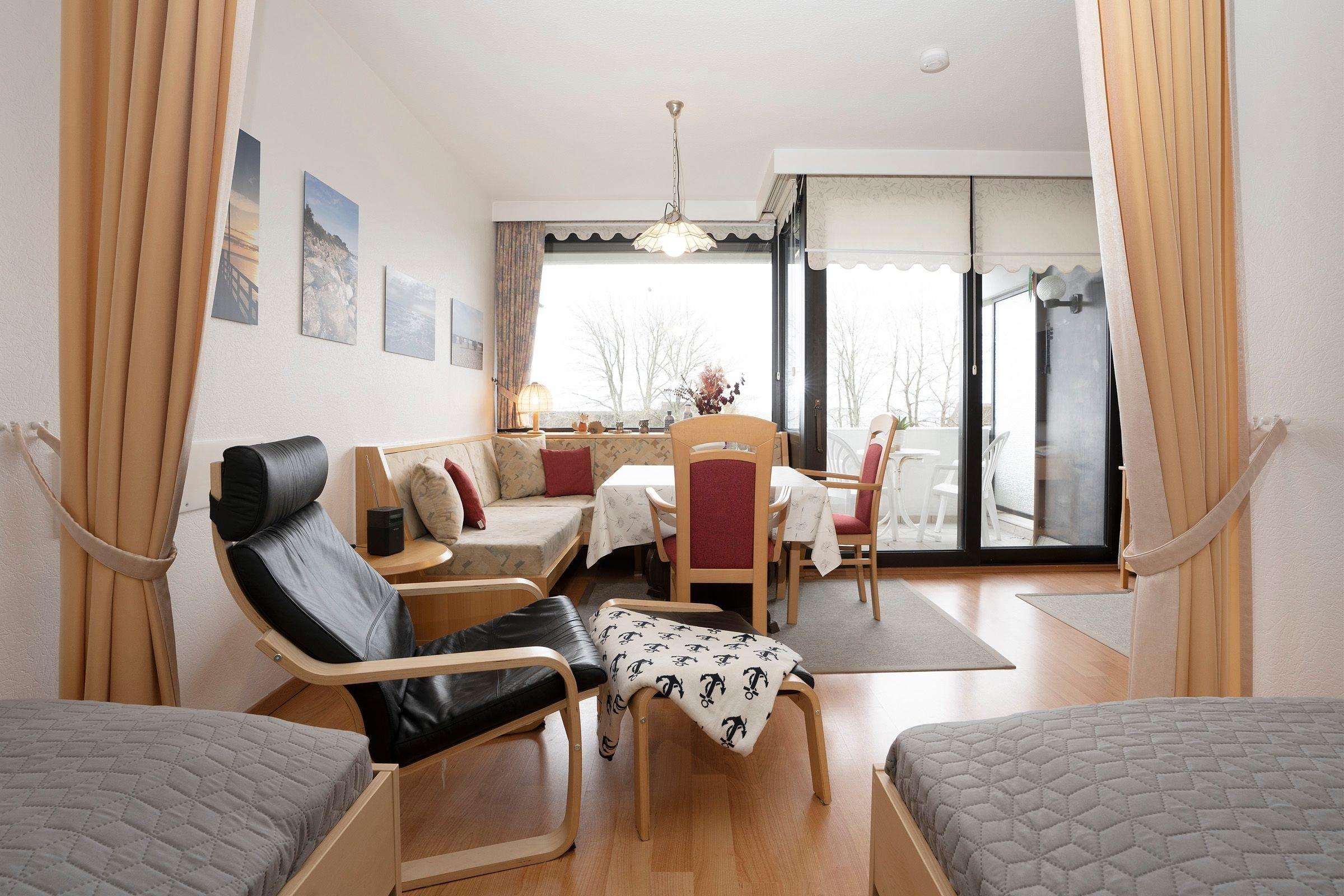 Mehr Ostsee geht kaum: Die Wohnung liegt nur rund 50 Meter vom Strand entfernt - und vom Balkon aus können Sie den Blick auf das zauberhafte Meer sowie die schöne Promenade genießen. Auch die durchdachte Aufteilung des Wohn/Schlafbereichs wird Sie begeistern: Am Fenster vorn befindet sich ein gemütlicher Essplatz, im hinteren Bereich stehen zwei Einzelbetten (je 90x190 cm). Alles ist hell und freundlich eingerichtet. Die offene Küche ist gut ausgestattet und ermöglicht eine angenehme Selbstverpflegung. Das Kinderzimmer ist ebenfalls mit zwei Einzelbetten (je 90x200 cm) ausgestattet. Das moderne Duschbad ist hell gefliest.