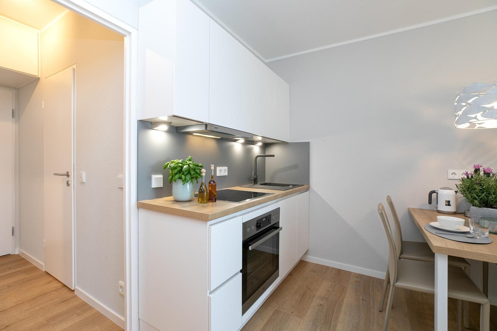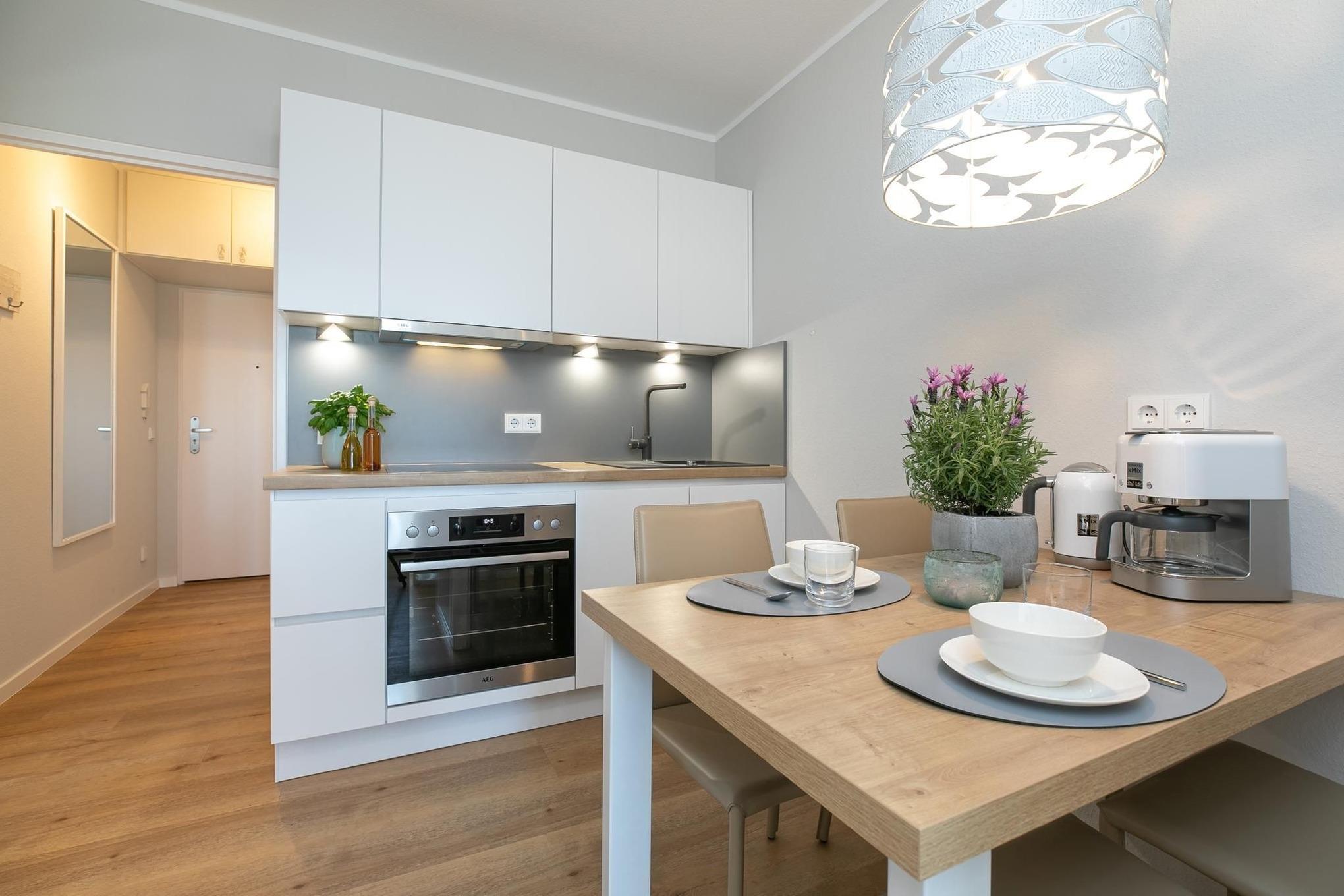 Eine schöne Wohnung. In der Küche könnte ein Regal für Wasserkocher, Toaster usw. vorhanden sein. Ein Eierkocher fehlt.