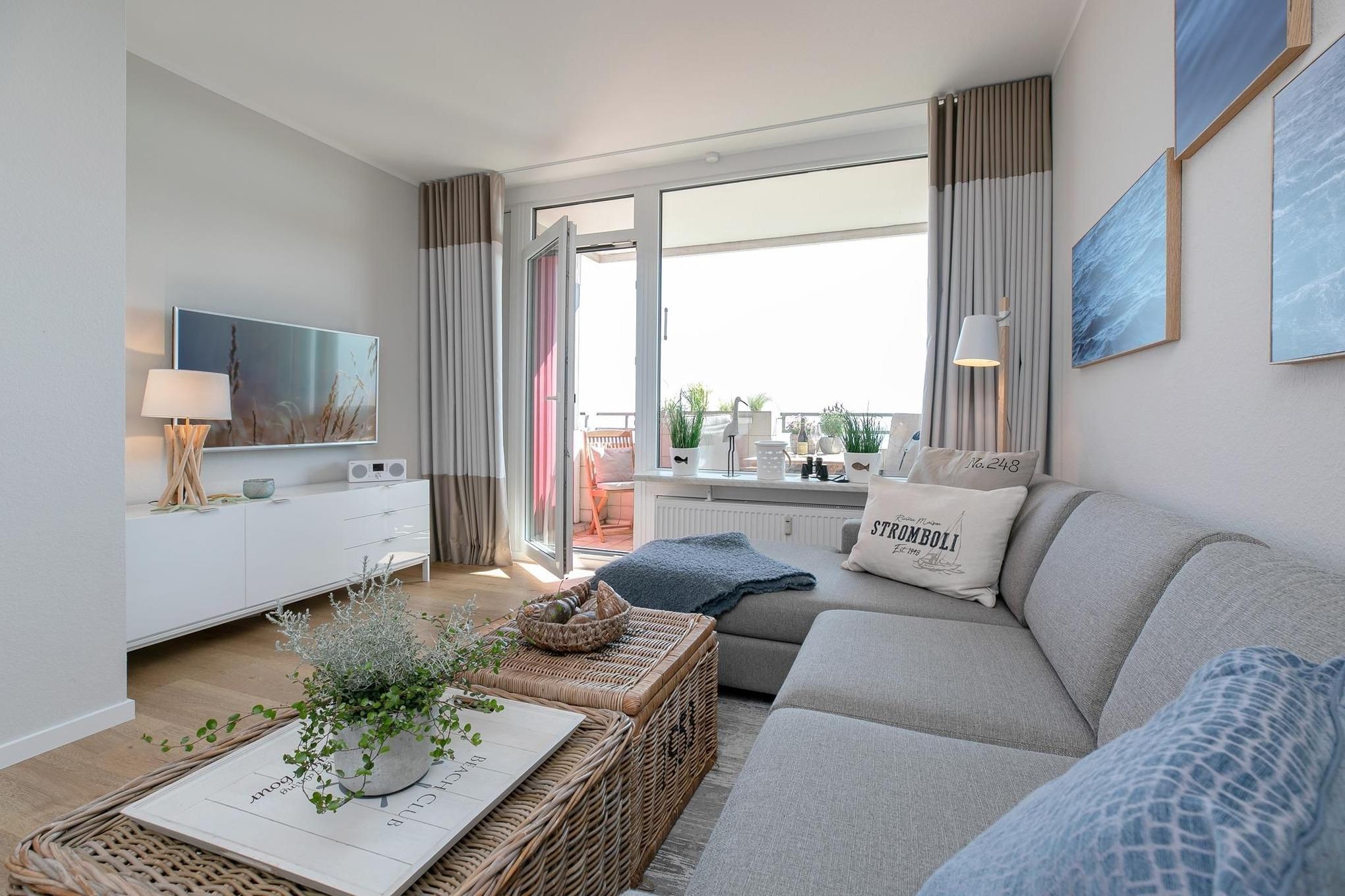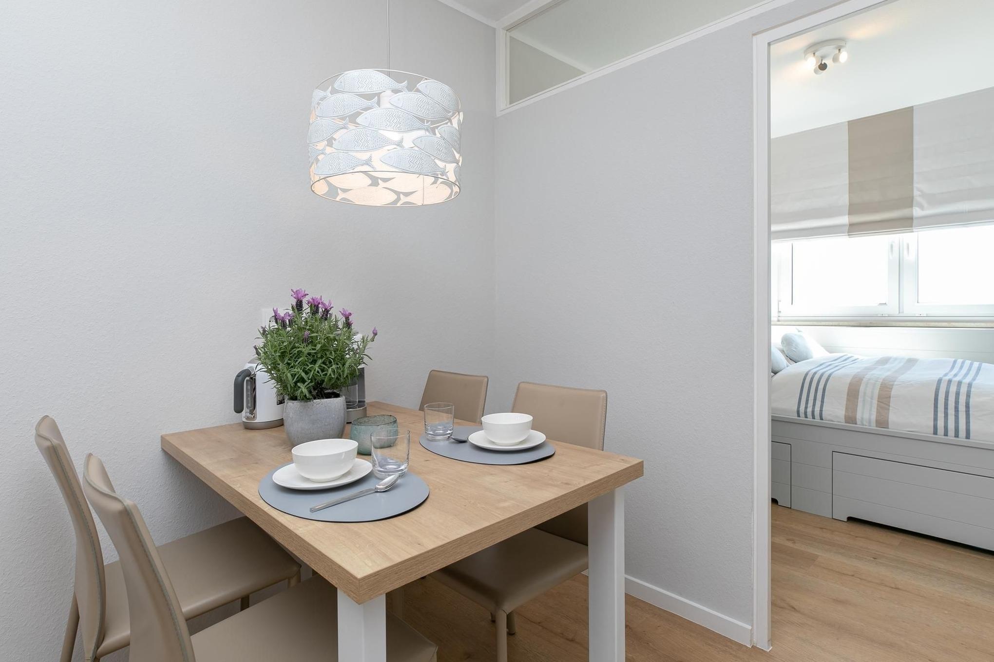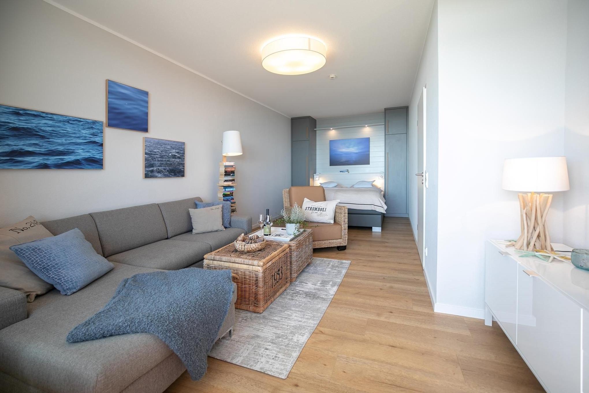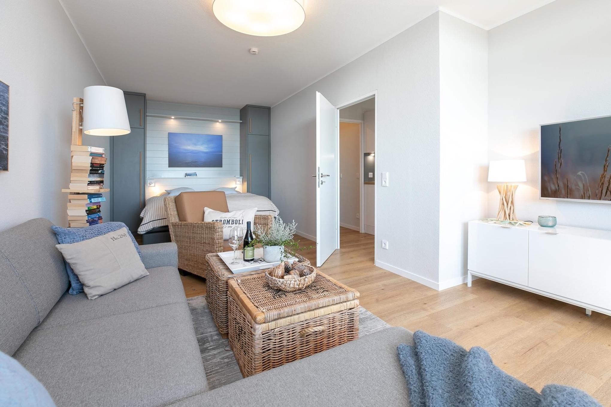 Es erwarten Sie ein kombinierter Wohn- und Schlafraum mit einem komfortablen Ecksofa, einem Flachbildfernseher, einem Boxspring-Doppelbett (180x200 cm) sowie eine voll ausgestattete Küche. Das separate Schlafzimmer verfügt über ein französisches Doppelbett (140x200 cm) und einen Kleiderschrank. Das moderne Badezimmer ist mit einer Dusche ausgestattet. Verbringen Sie viele Sonnenstunden auf dem überdachten, möblierten Balkon mit Fernblick auf die Ostsee.