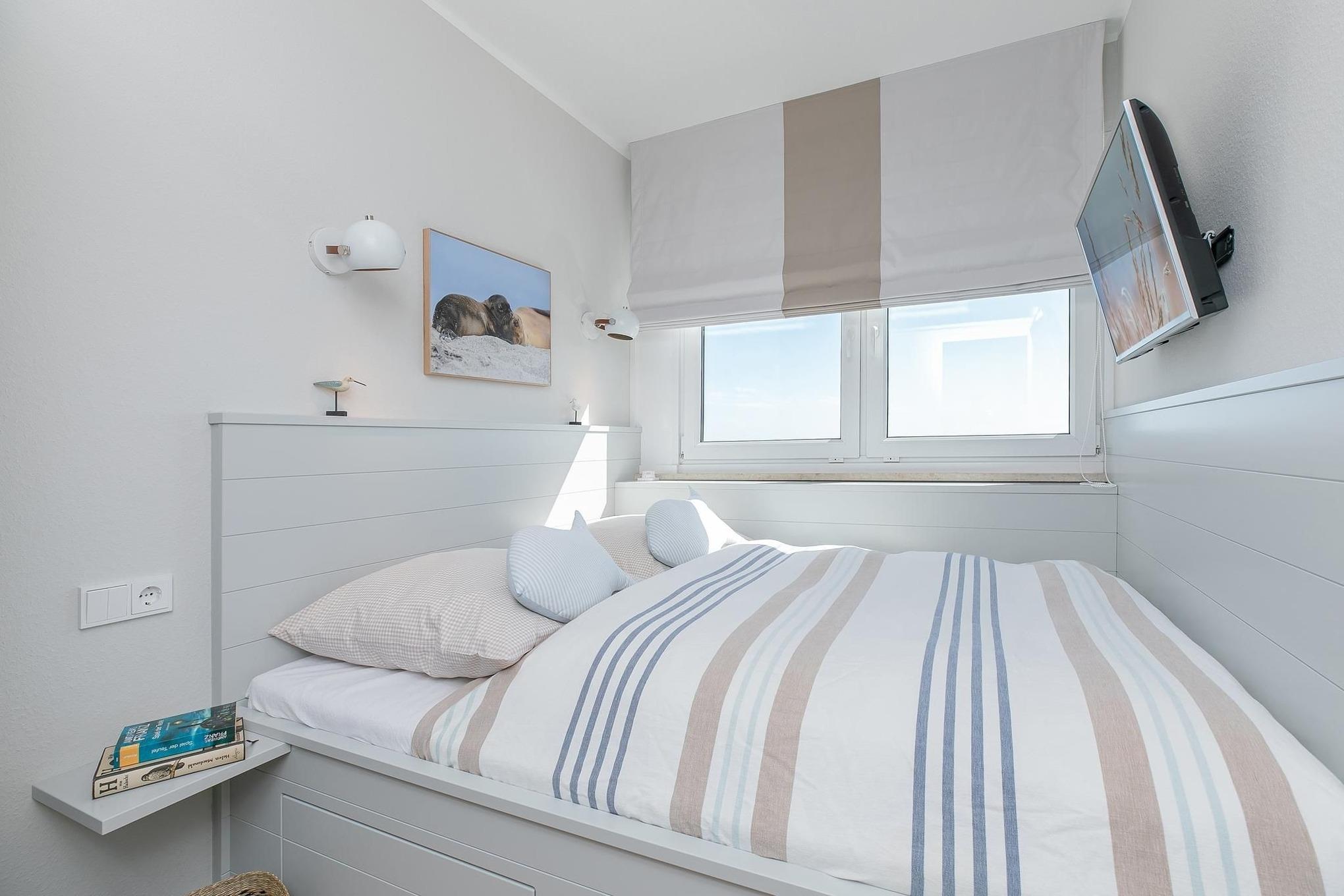 Schlafzimmer: 1 Doppelbett (140x200 cm), TV, Kleiderschrank, Verdunkelungsrollo