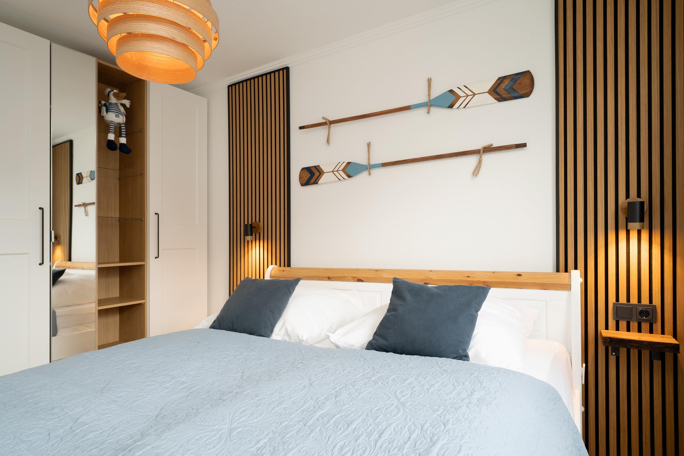 Schlafzimmer: 1 Doppelbett (180x200 cm), TV, Kleiderschrank, Verdunkelung (elektrische Außenrollläden)