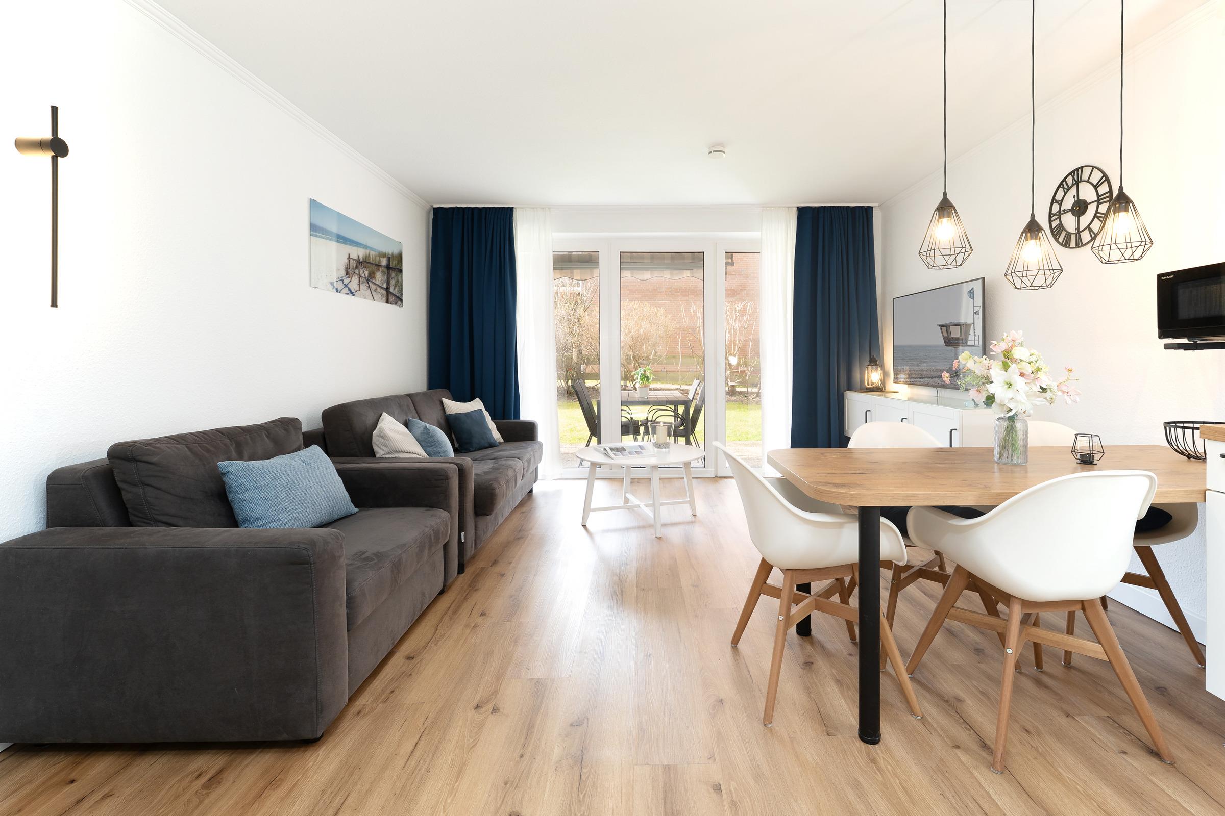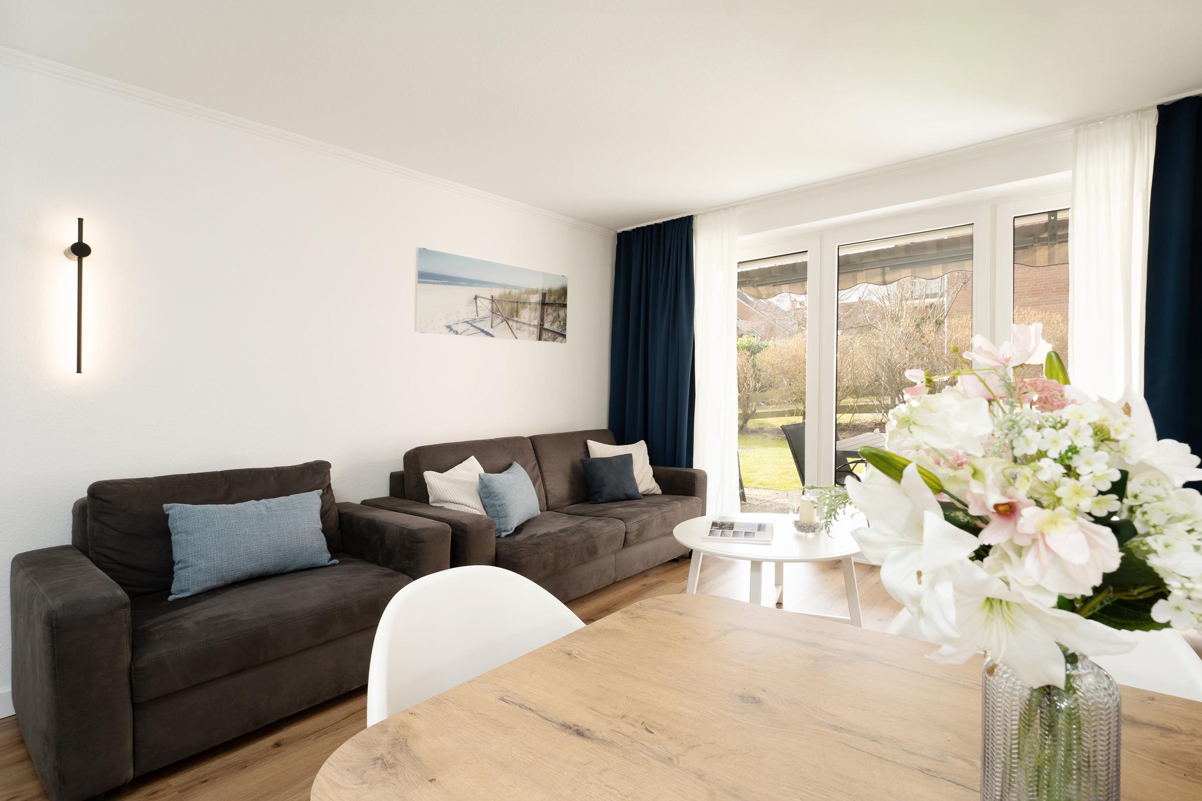 Herzstück der Wohnung ist der helle und offene Wohnbereich mit integriertem Essplatz für vier und angrenzender Küche. Alltagshelfer wie Induktionsherd, Backofen in angenehmer Arbeitshöhe, Mikrowelle und Spülmaschine sorgen für gute Laune, mit Blick ins Grüne kann man hier leckere Ferienmahlzeiten zaubern. Entspannen Sie im Wohnbereich auf bequemem Sofa und Sessel, ein Flatscreen-TV bietet elektronische Unterhaltung in HD-Qualität. Natürlich steht den Gästen auch ein kostenfreier WLAN-Anschluss zur Verfügung. Das hochwertige Schlafsofa offeriert einen weiteren gemütlichen Schlafplatz für zwei (Liegefläche 160x200 cm). Das Wohnzimmer führt direkt auf die möblierte Terrasse mit angrenzendem Gartenstück, hier lässt es sich wunderbar in der Morgensonne frühstücken oder abends entspannt den Tag ausklingen. Für gesellige BBQ Abende ist ein Elektrogrill vorhanden.