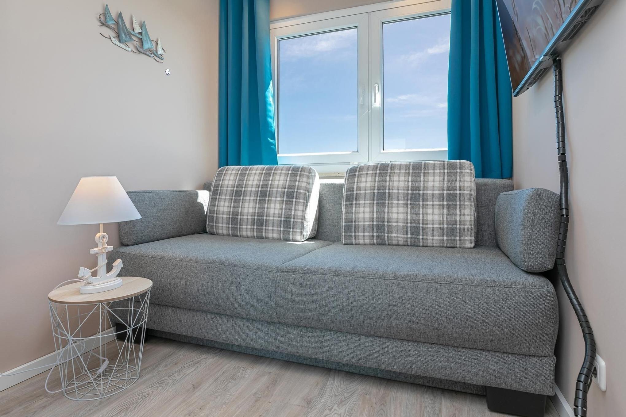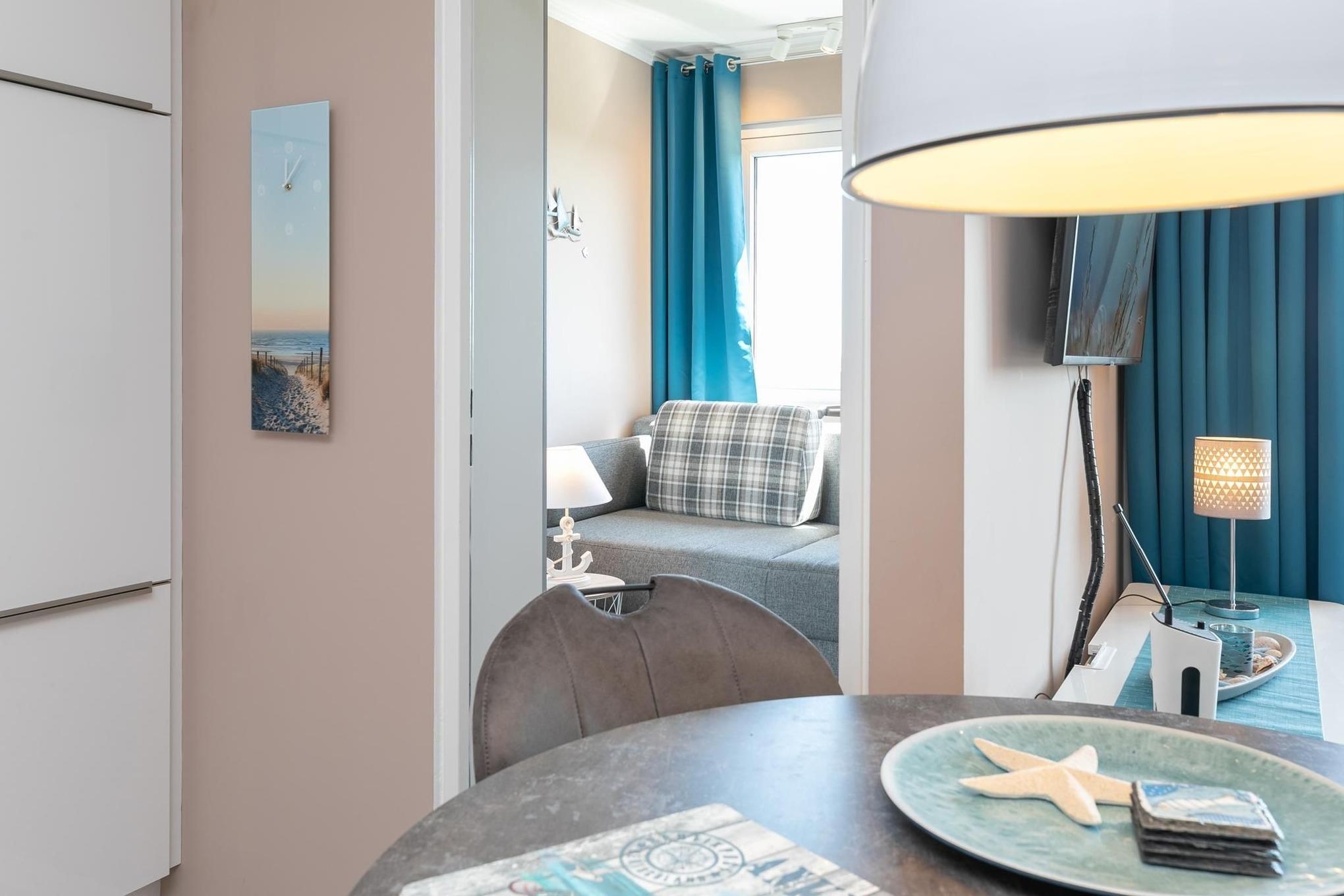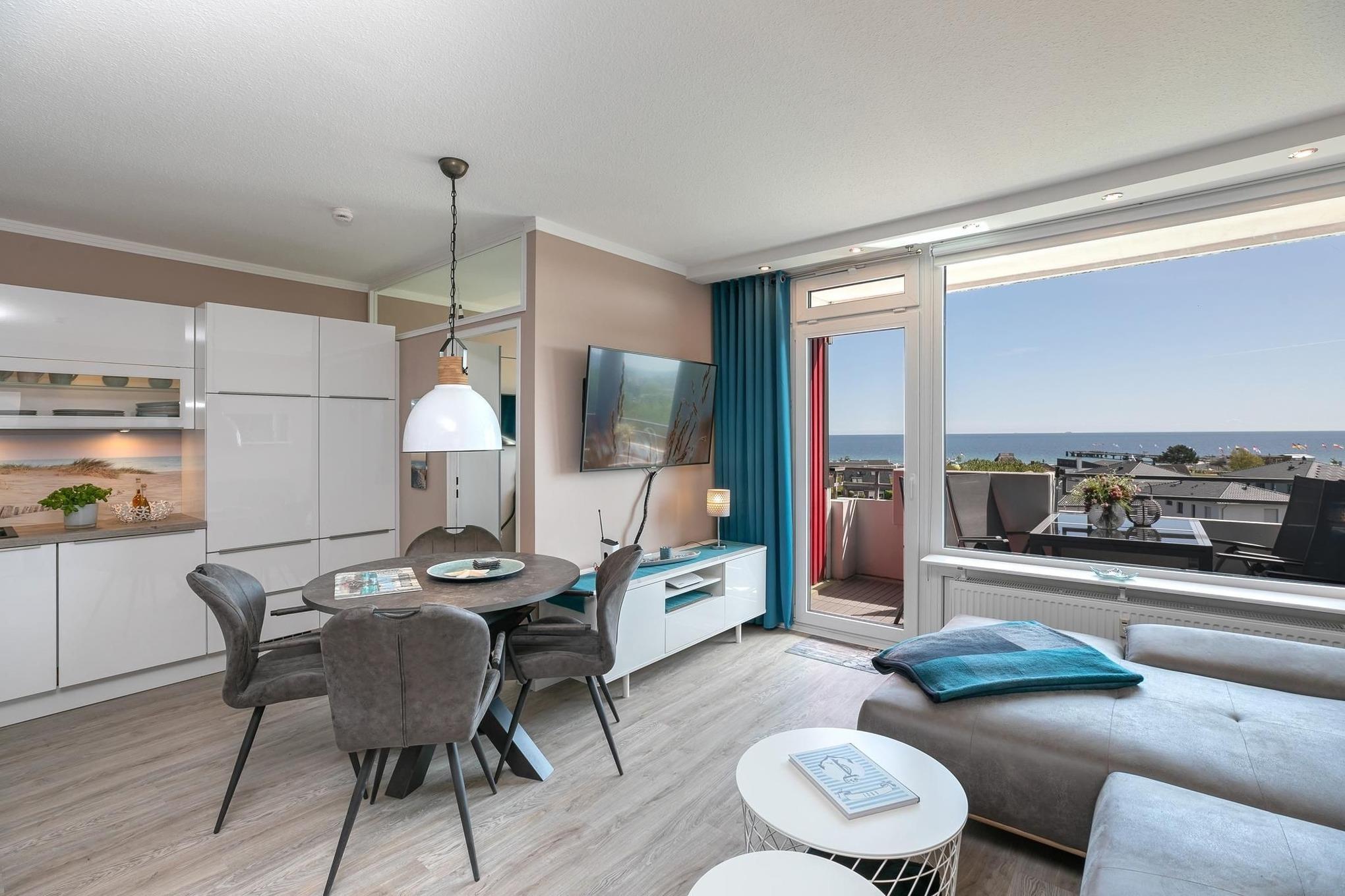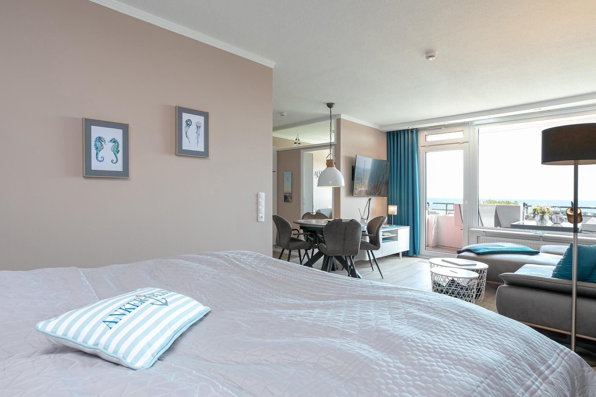 Das Herzstück dieser Wohnung ist der lichtdurchflutete, offene Wohn- und Schlafbereich mit einer großzügigen Sofalandschaft, einem Flachbildfernseher und direktem Zugang auf den möblierten Balkon mit Meerblick. Das Doppelbett in Komforthöhe (2 x 90x200 cm, 65 cm hoch) bietet eine gemütliche Schlafmöglichkeit für 2 Personen. Die offene Küche ist z. B. mit einem 4-Platten-Cerankochfeld, einem Backofen und einem Geschirrspülmaschine voll ausgestattet. Der runde Esstisch lädt zu einem geselligen Essen mit der Familie ein. Im separaten Schlafzimmer erwartet Sie ein hochwertiges Schlafsofa (70/80x200 cm, Dauerschläfer inkl. Lattenrost und Federkernmatratzen) sowie ein Kleiderschrank und ein weiterer Flachbildfernseher. Alle Schlafräume lassen sich angenehm verdunkeln. Der moderne Stil zieht sich bis ins Badezimmer fort - Hier erwarten Sie Annehmlichkeiten wie z. B. ein beheizbarer Handtuchhalter und eine bodentiefe Dusche. Der WLAN-Anschluss ist selbstverständlich inklusive.