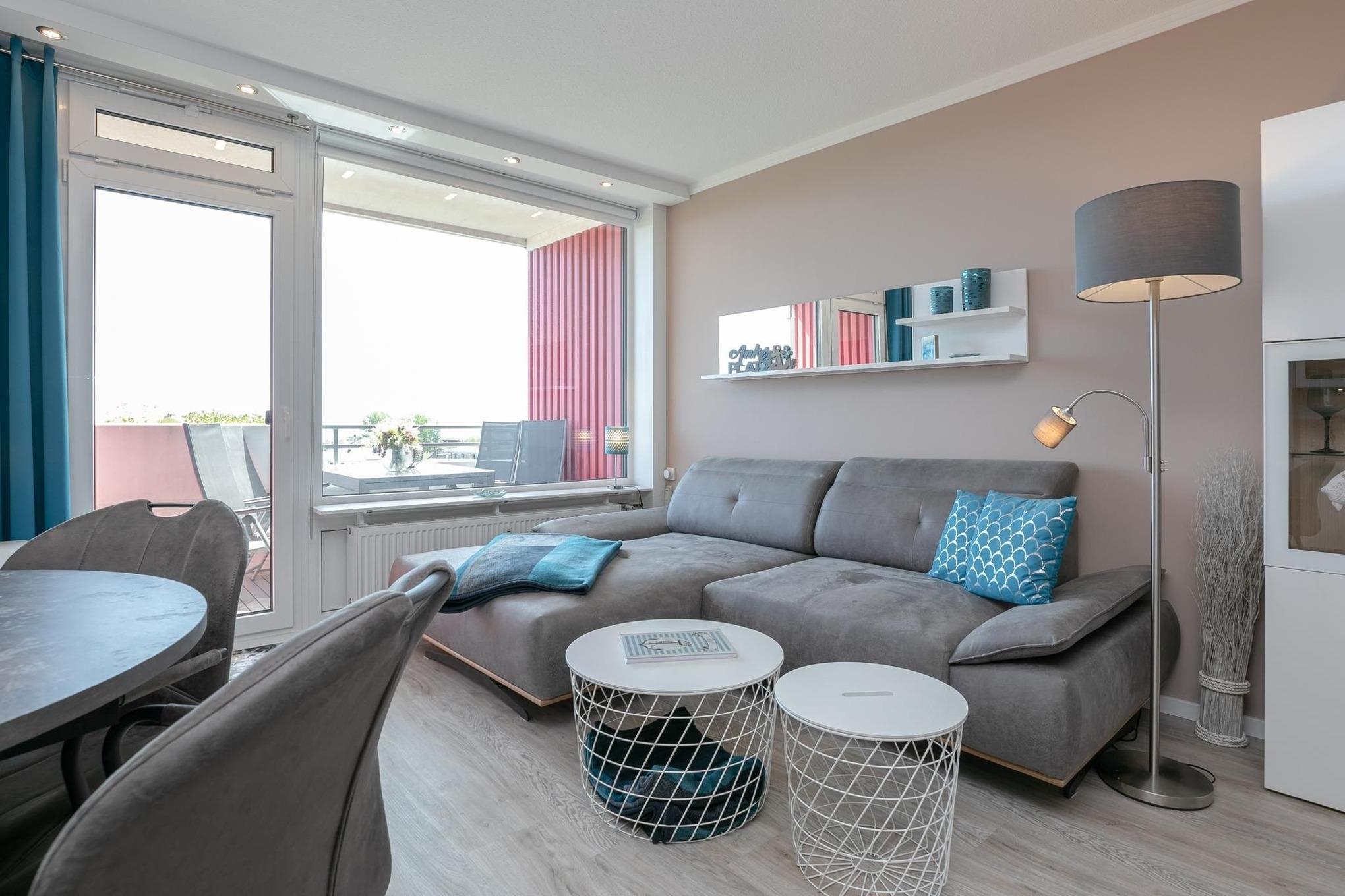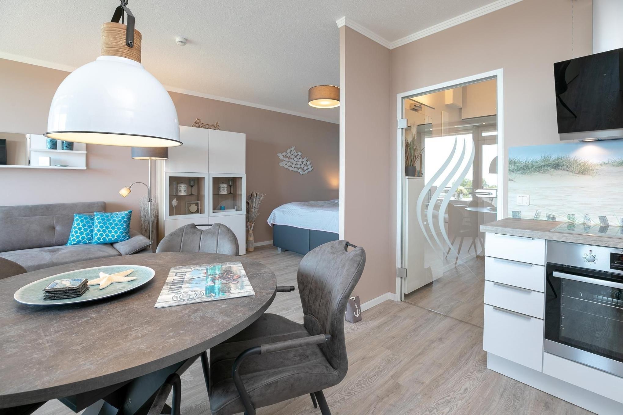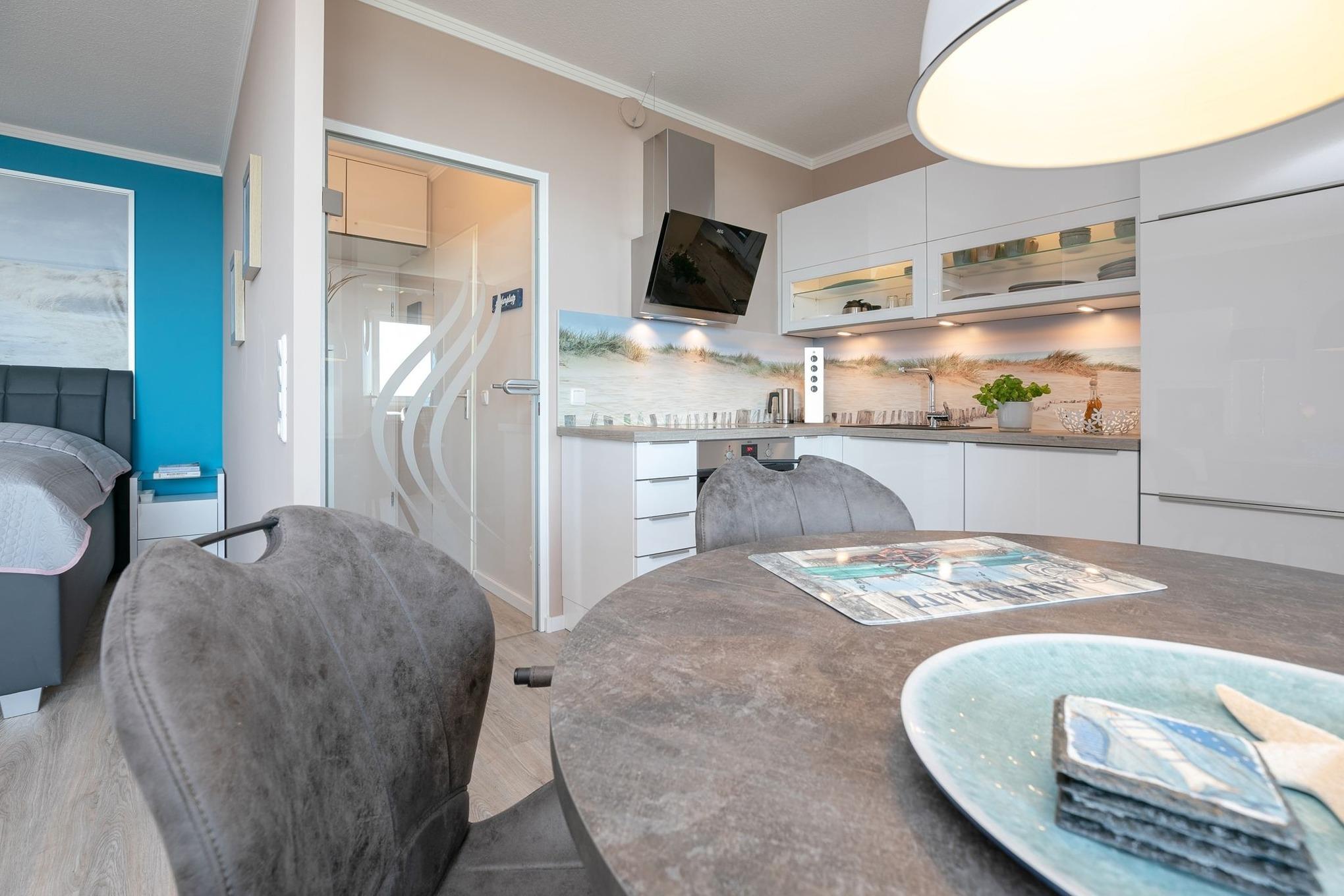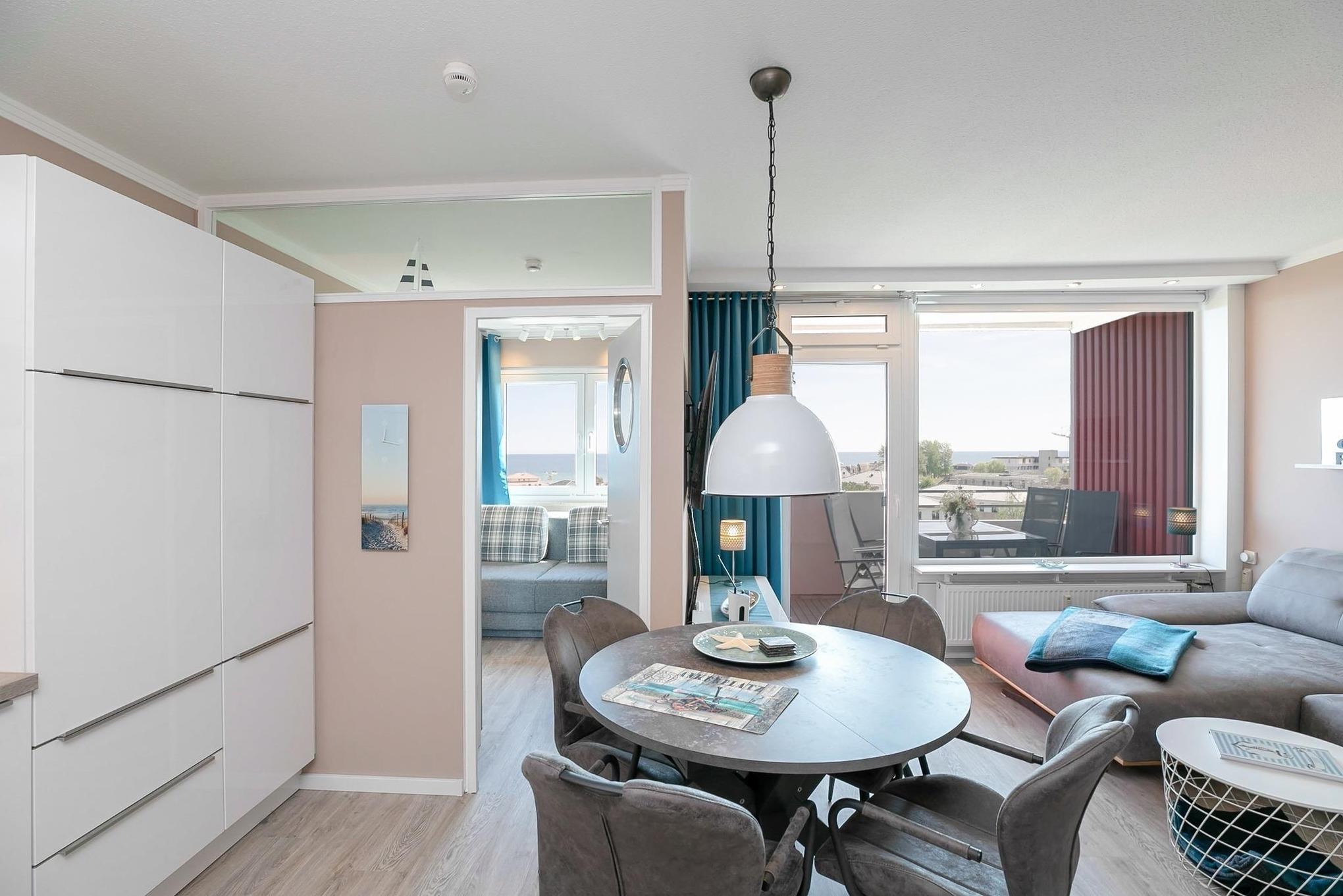 Das Herzstück dieser Wohnung ist der lichtdurchflutete, offene Wohn- und Schlafbereich mit einer großzügigen Sofalandschaft, einem Flachbildfernseher und direktem Zugang auf den möblierten Balkon mit Meerblick. Das Doppelbett in Komforthöhe (2 x 90x200 cm, 65 cm hoch) bietet eine gemütliche Schlafmöglichkeit für 2 Personen. Die offene Küche ist z. B. mit einem 4-Platten-Cerankochfeld, einem Backofen und einem Geschirrspülmaschine voll ausgestattet. Der runde Esstisch lädt zu einem geselligen Essen mit der Familie ein. Im separaten Schlafzimmer erwartet Sie ein hochwertiges Schlafsofa (70/80x200 cm, Dauerschläfer inkl. Lattenrost und Federkernmatratzen) sowie ein Kleiderschrank und ein weiterer Flachbildfernseher. Alle Schlafräume lassen sich angenehm verdunkeln. Der moderne Stil zieht sich bis ins Badezimmer fort - Hier erwarten Sie Annehmlichkeiten wie z. B. ein beheizbarer Handtuchhalter und eine bodentiefe Dusche. Der WLAN-Anschluss ist selbstverständlich inklusive.