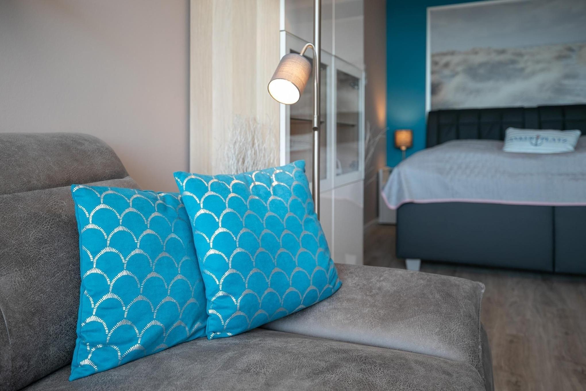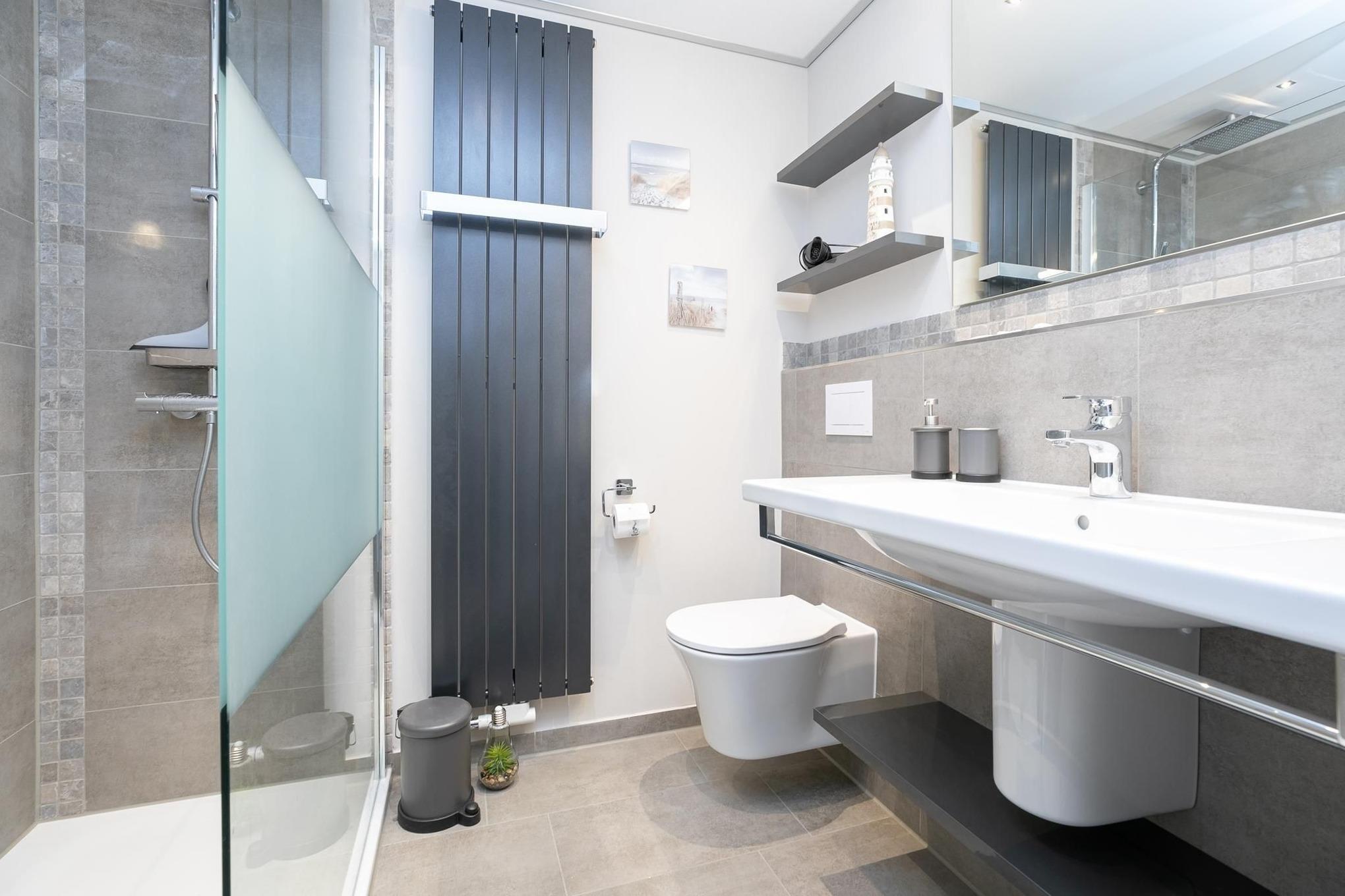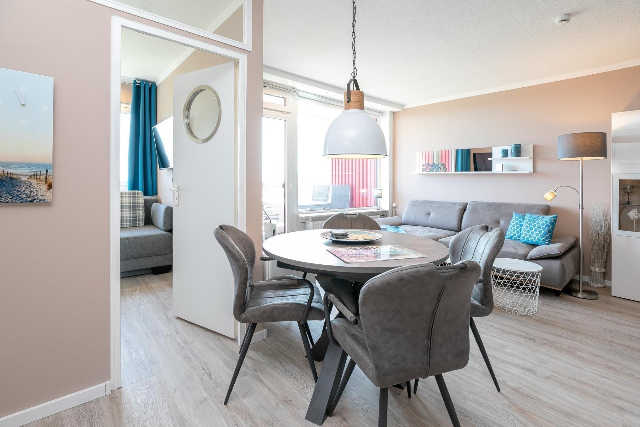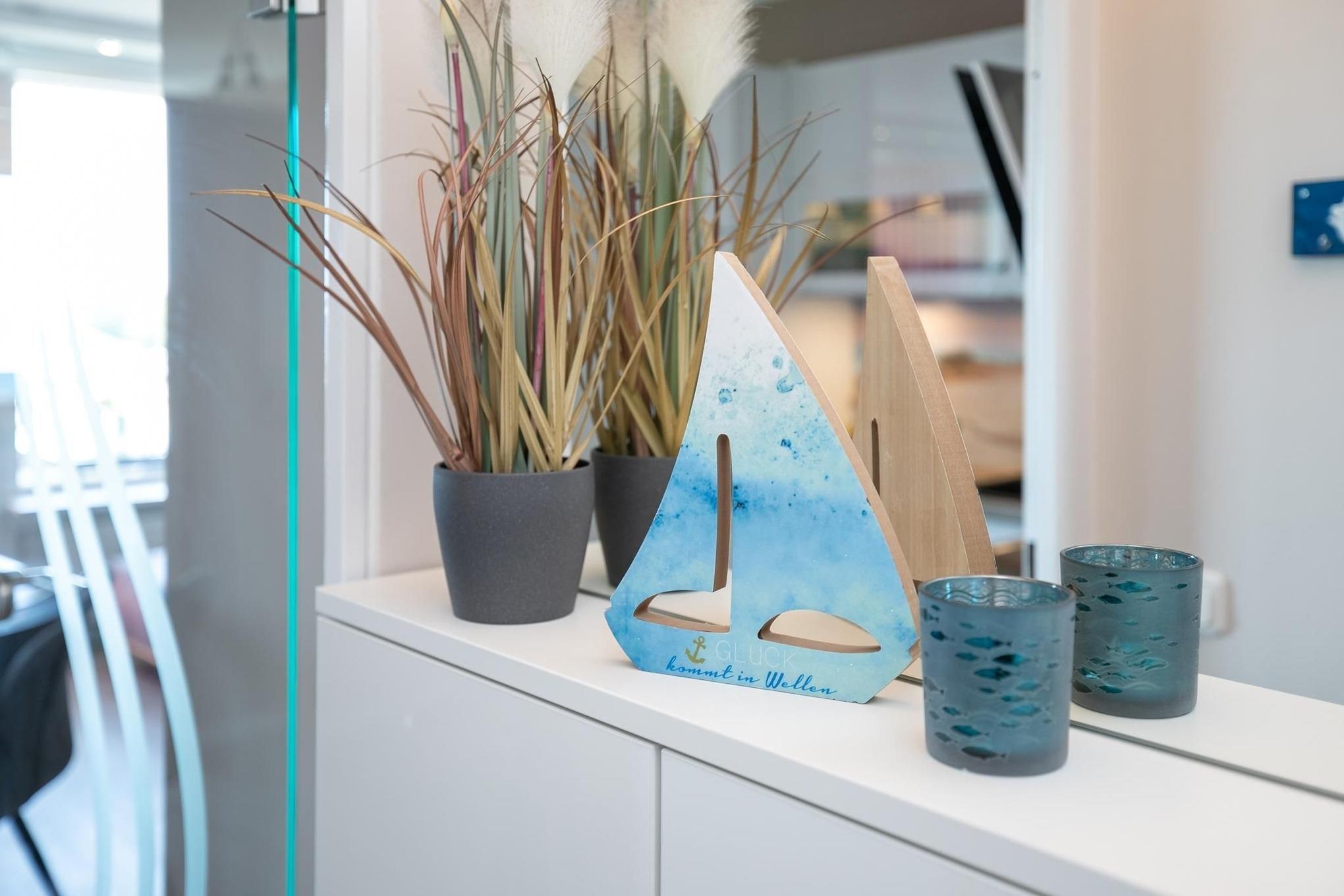 Das Herzstück dieser Wohnung ist der lichtdurchflutete, offene Wohn- und Schlafbereich mit einer großzügigen Sofalandschaft, einem Flachbildfernseher und direktem Zugang auf den möblierten Balkon mit Meerblick. Das Doppelbett in Komforthöhe (2 x 90x200 cm, 65 cm hoch) bietet eine gemütliche Schlafmöglichkeit für 2 Personen. Die offene Küche ist z. B. mit einem 4-Platten-Cerankochfeld, einem Backofen und einem Geschirrspülmaschine voll ausgestattet. Der runde Esstisch lädt zu einem geselligen Essen mit der Familie ein. Im separaten Schlafzimmer erwartet Sie ein hochwertiges Schlafsofa (70/80x200 cm, Dauerschläfer inkl. Lattenrost und Federkernmatratzen) sowie ein Kleiderschrank und ein weiterer Flachbildfernseher. Alle Schlafräume lassen sich angenehm verdunkeln. Der moderne Stil zieht sich bis ins Badezimmer fort - Hier erwarten Sie Annehmlichkeiten wie z. B. ein beheizbarer Handtuchhalter und eine bodentiefe Dusche. Der WLAN-Anschluss ist selbstverständlich inklusive.