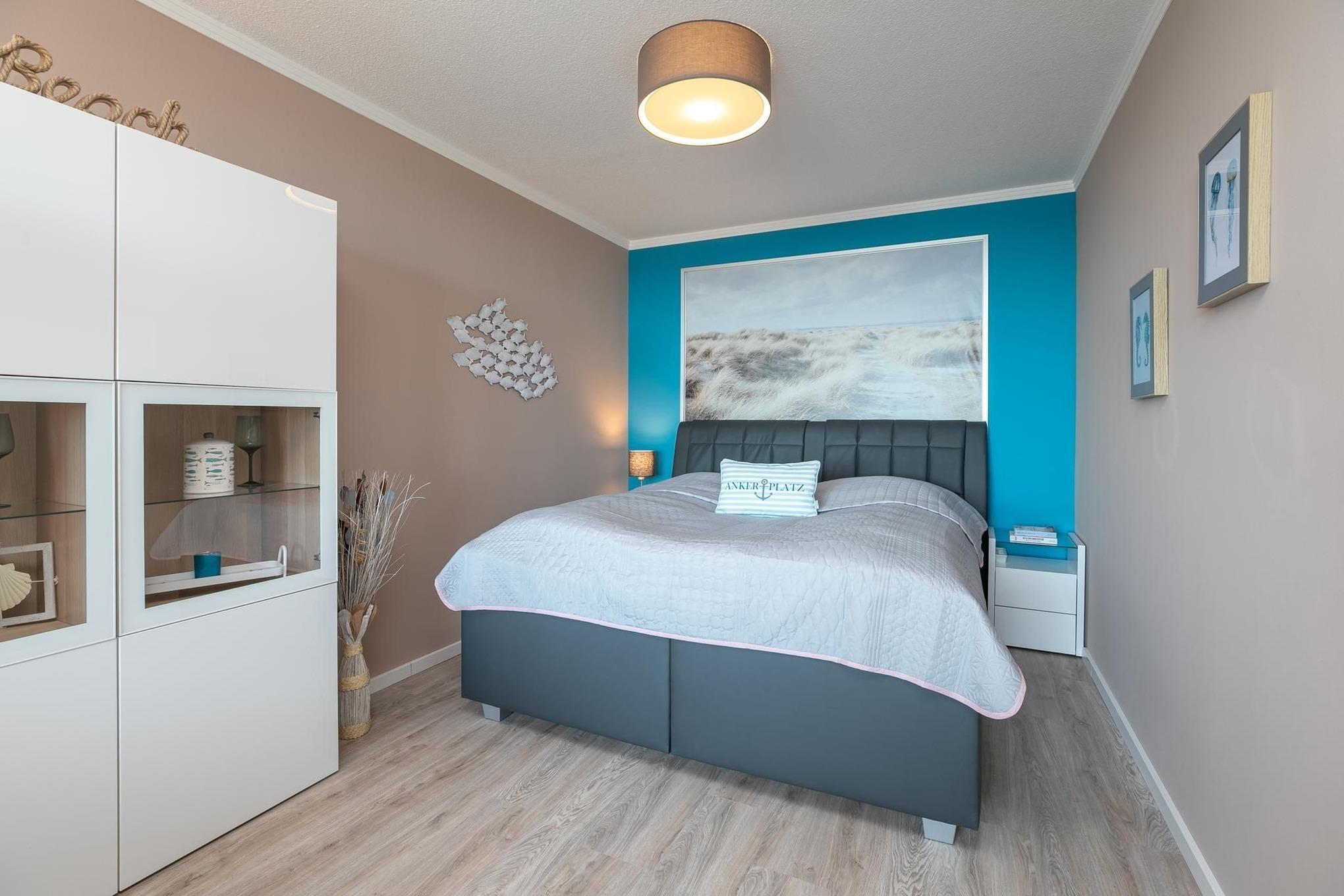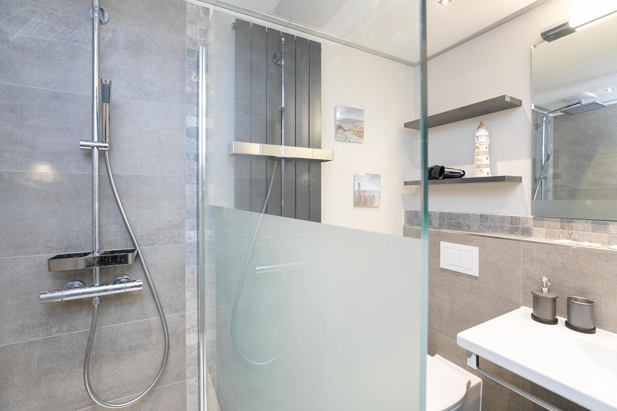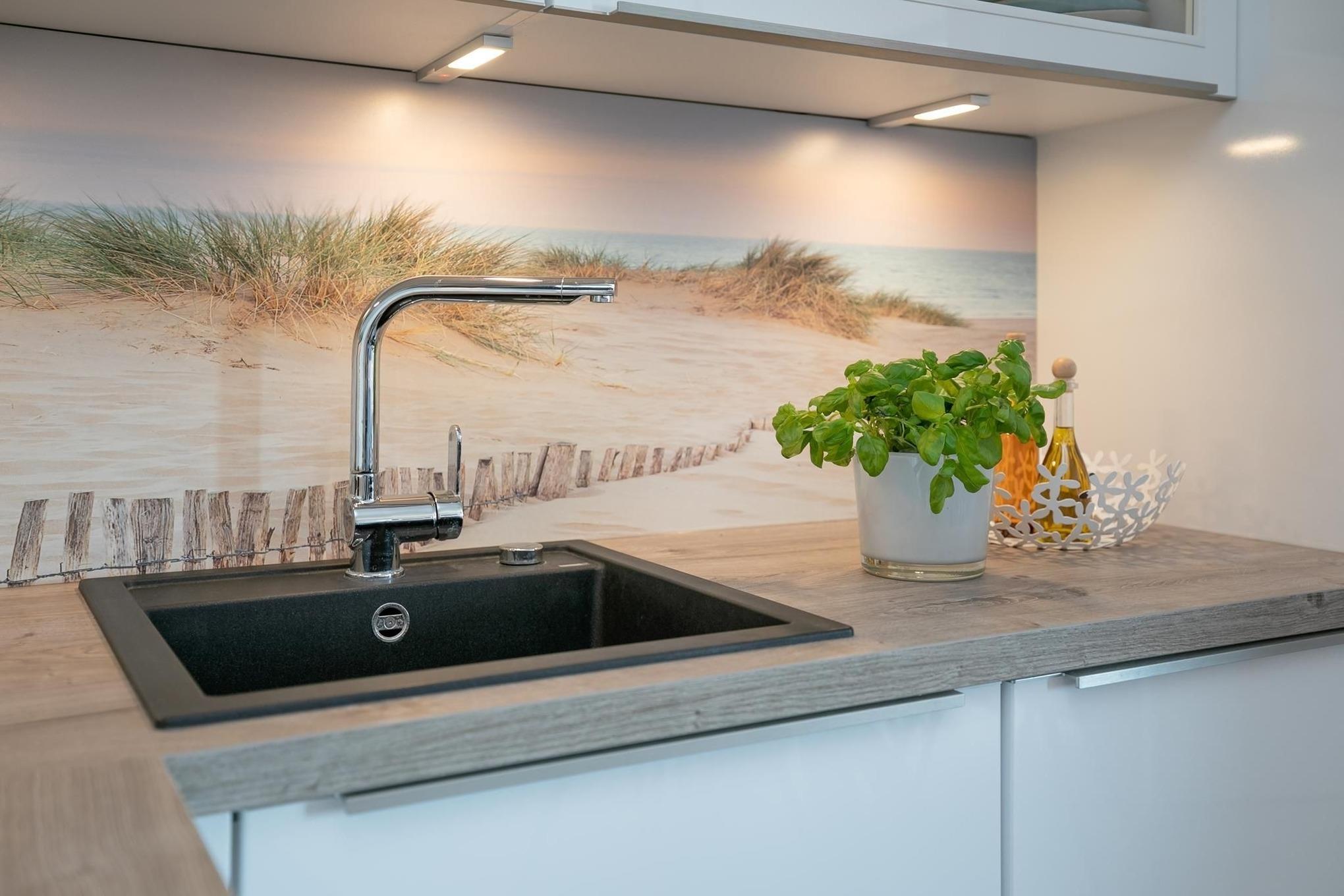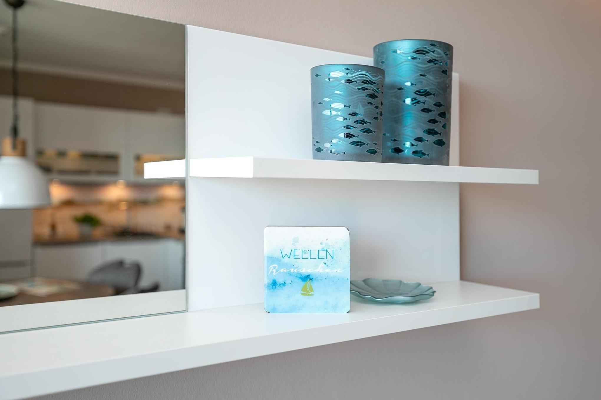 Das Herzstück dieser Wohnung ist der lichtdurchflutete, offene Wohn- und Schlafbereich mit einer großzügigen Sofalandschaft, einem Flachbildfernseher und direktem Zugang auf den möblierten Balkon mit Meerblick. Das Doppelbett in Komforthöhe (2 x 90x200 cm, 65 cm hoch) bietet eine gemütliche Schlafmöglichkeit für 2 Personen. Die offene Küche ist z. B. mit einem 4-Platten-Cerankochfeld, einem Backofen und einem Geschirrspülmaschine voll ausgestattet. Der runde Esstisch lädt zu einem geselligen Essen mit der Familie ein. Im separaten Schlafzimmer erwartet Sie ein hochwertiges Schlafsofa (70/80x200 cm, Dauerschläfer inkl. Lattenrost und Federkernmatratzen) sowie ein Kleiderschrank und ein weiterer Flachbildfernseher. Alle Schlafräume lassen sich angenehm verdunkeln. Der moderne Stil zieht sich bis ins Badezimmer fort - Hier erwarten Sie Annehmlichkeiten wie z. B. ein beheizbarer Handtuchhalter und eine bodentiefe Dusche. Der WLAN-Anschluss ist selbstverständlich inklusive.