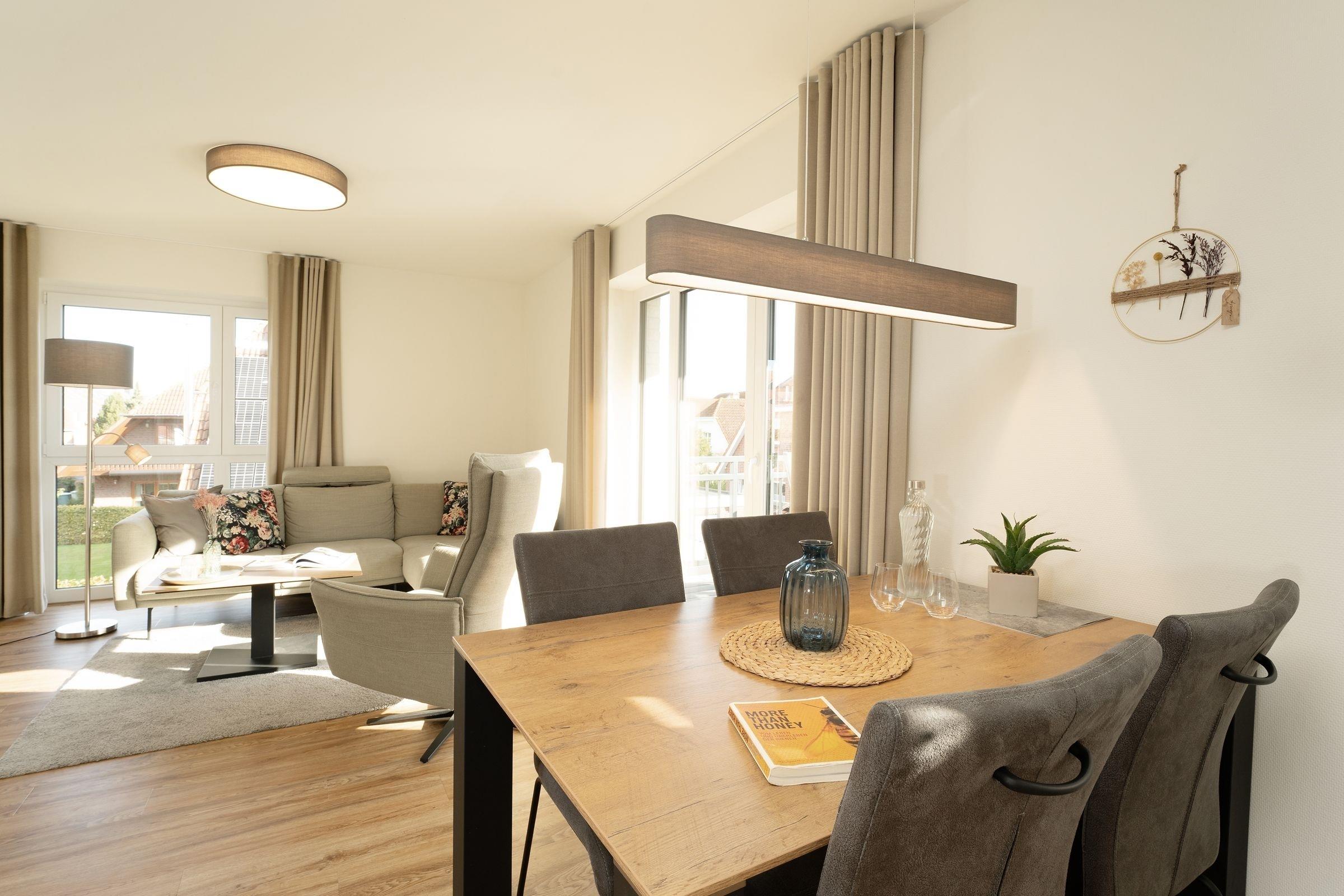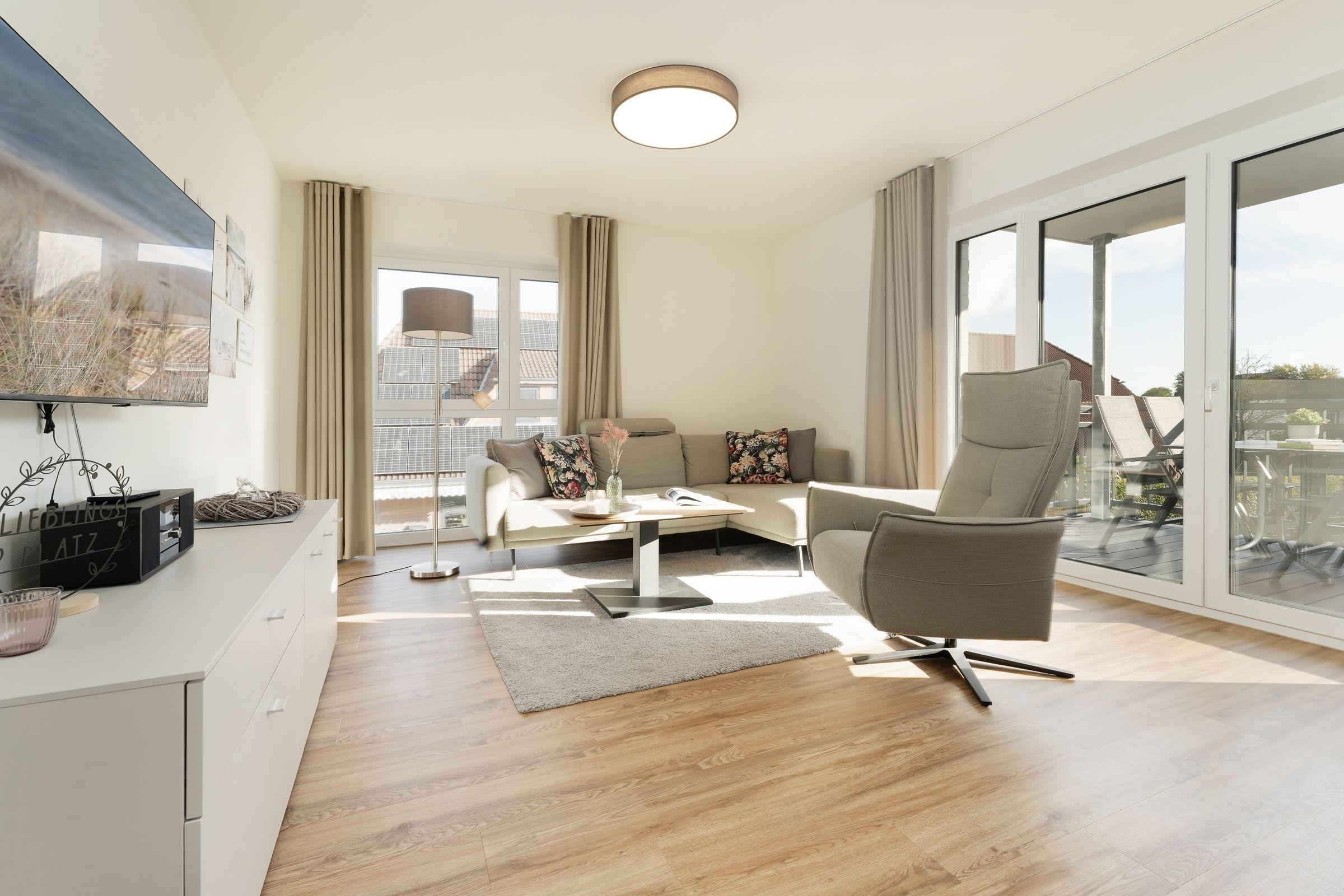 Diese stilvoll eingerichtete 3-Zimmer-Ferienwohnung mit eigener Sauna, Balkon und einer Wohnfläche von ca. 85² erwartet bis zu 4 Personen in der Ferienwohnanlage Dahmer Dünen.