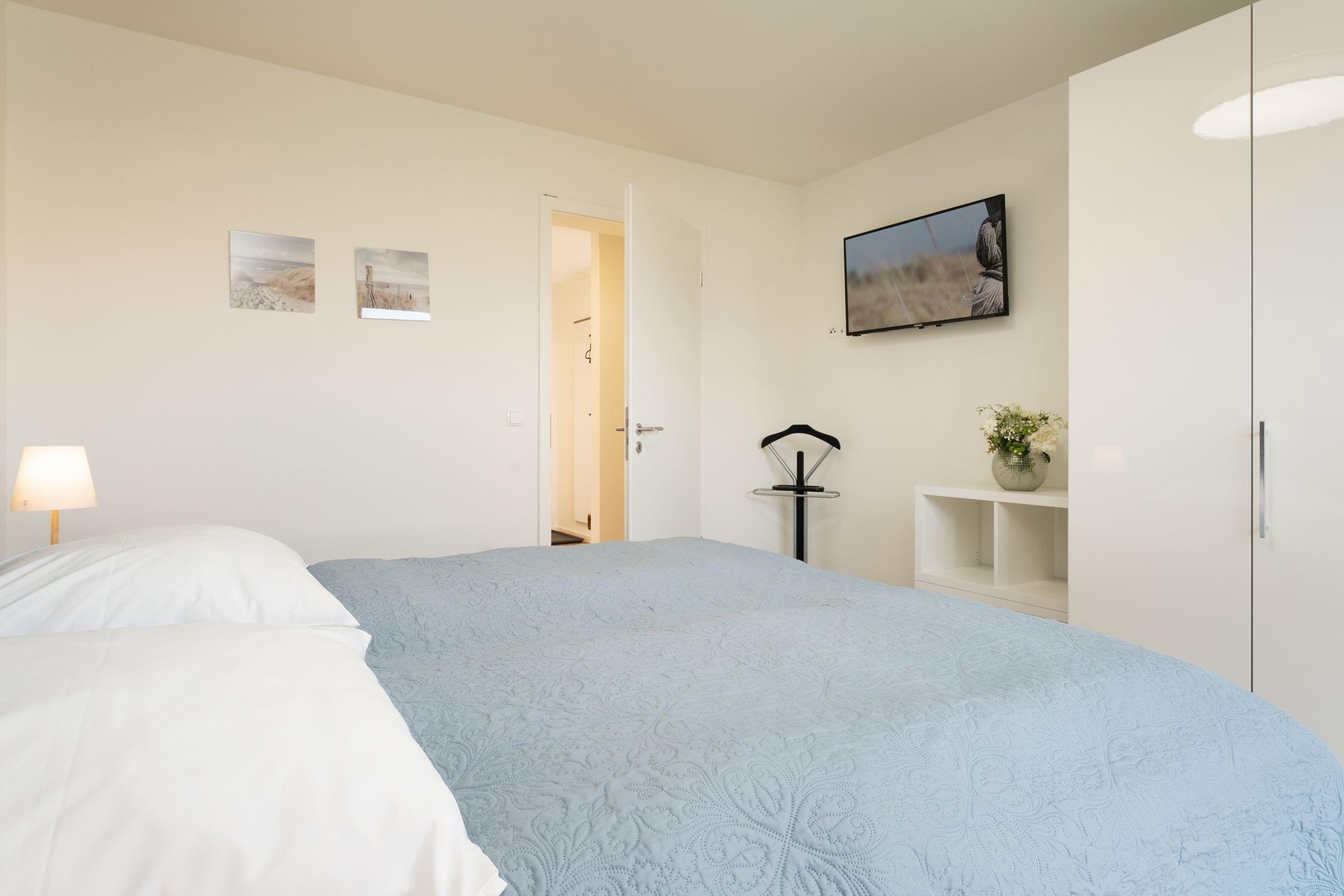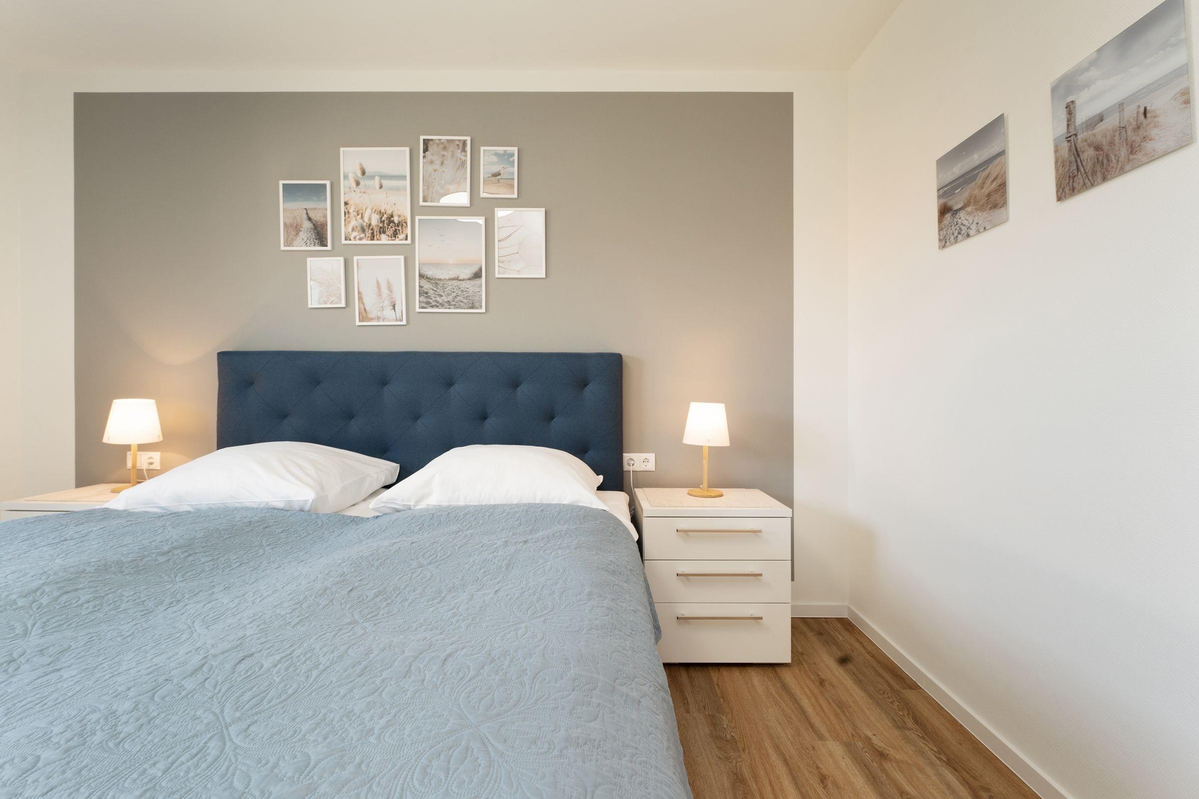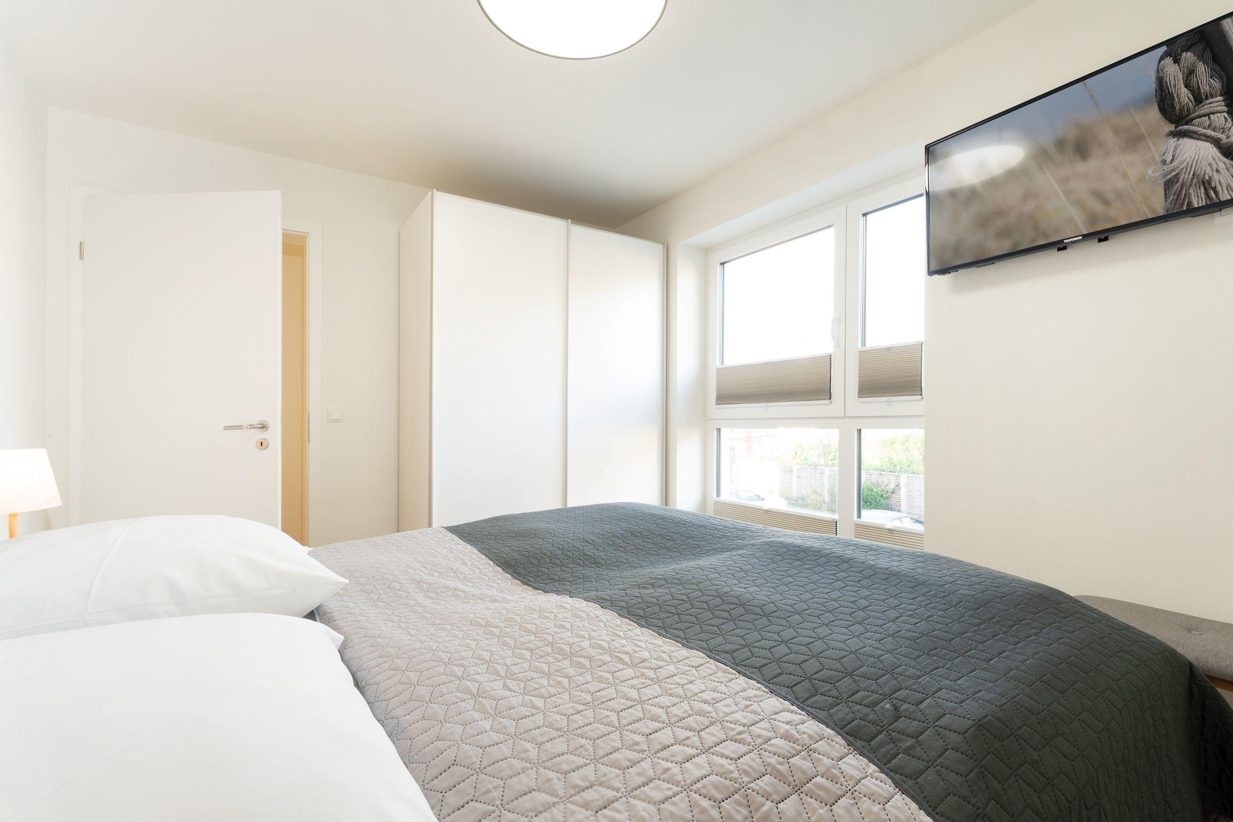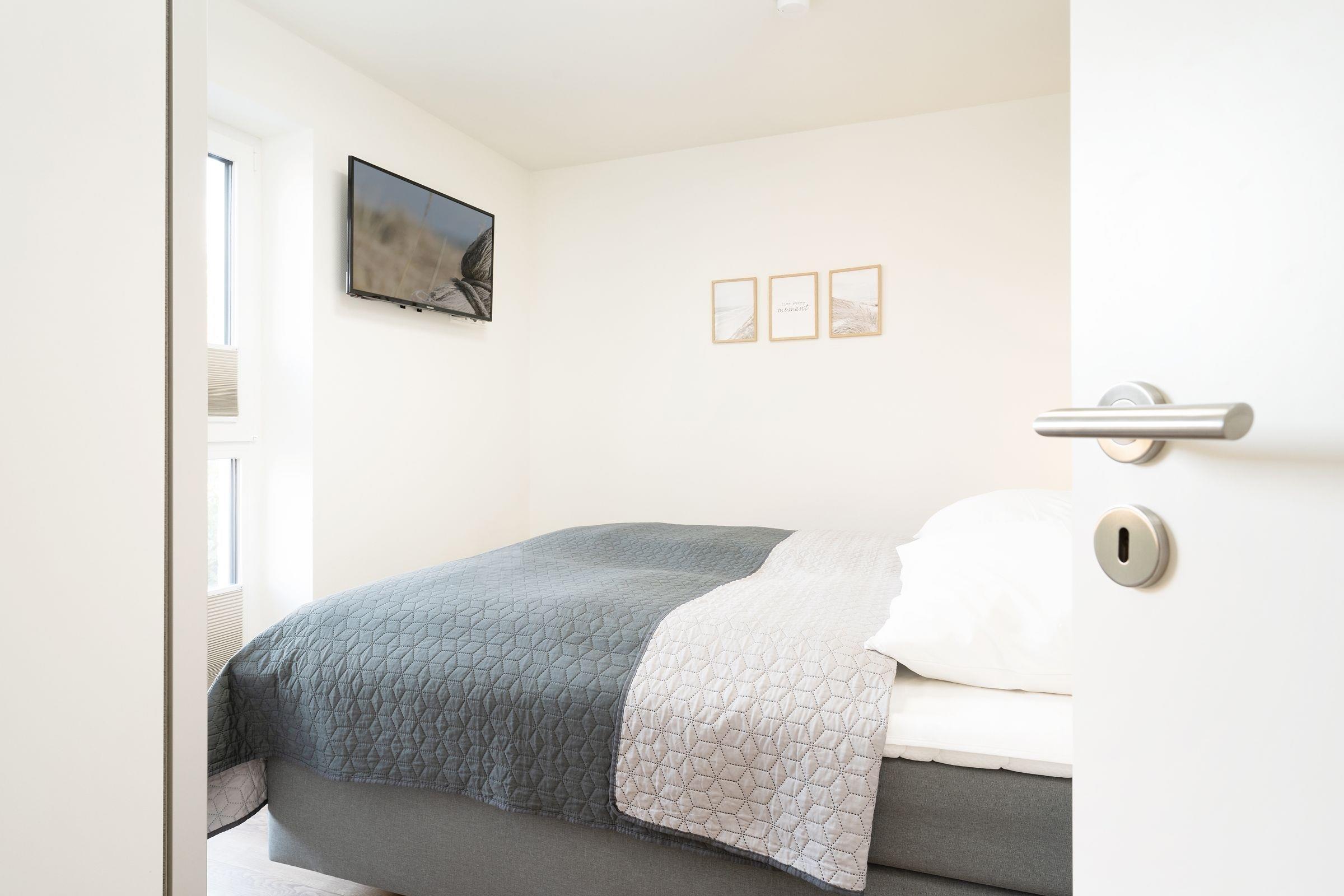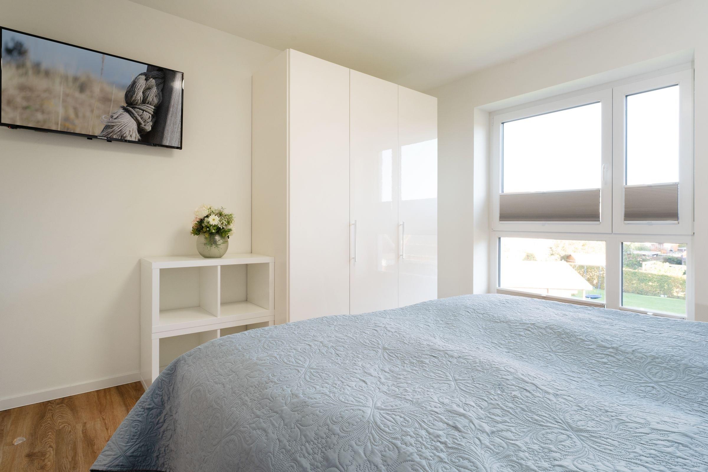 Schlafzimmer 1: 1 Boxspring-Doppelbett (180x200 cm, durchgehender Topper), Kleiderschrank, TV, Verdunkelung: Plissees, Platz für Babybett vorhanden