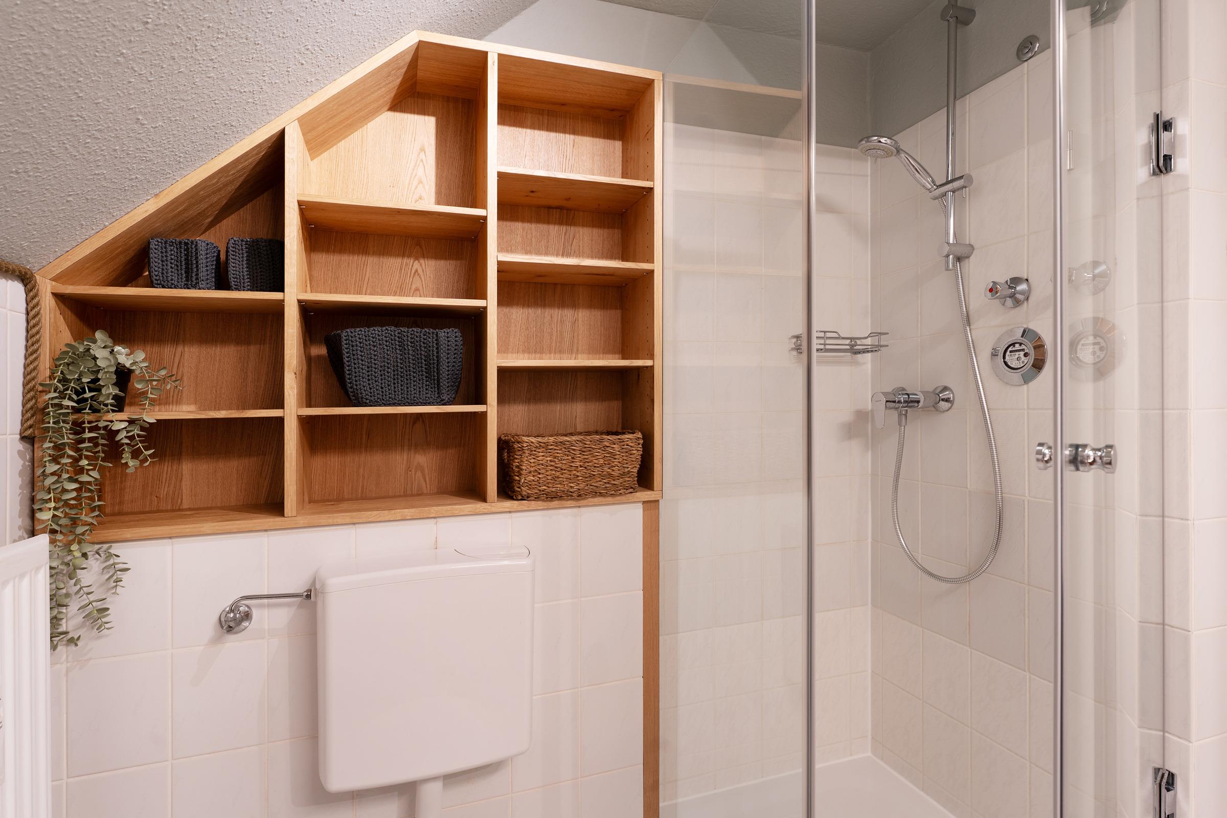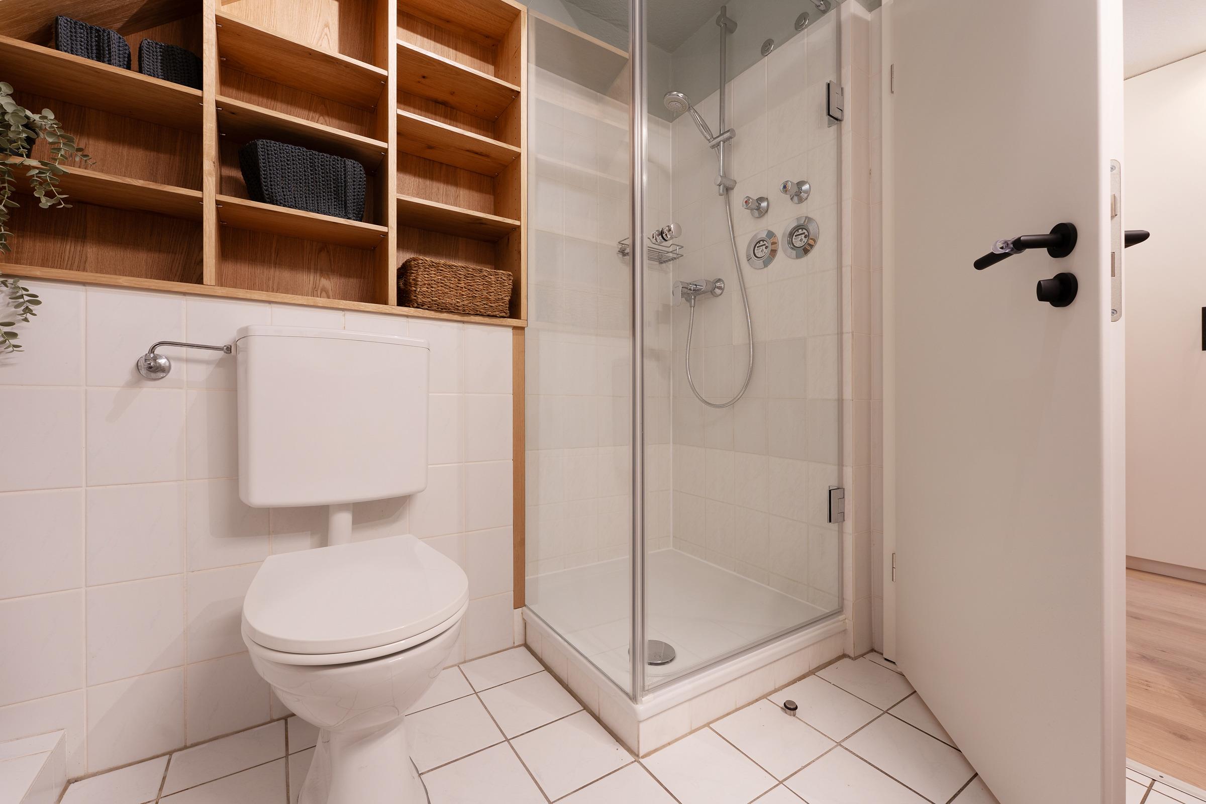 Das Badezimmer ist mit einer Dusche, WC und Waschbecken ausgestattet.
