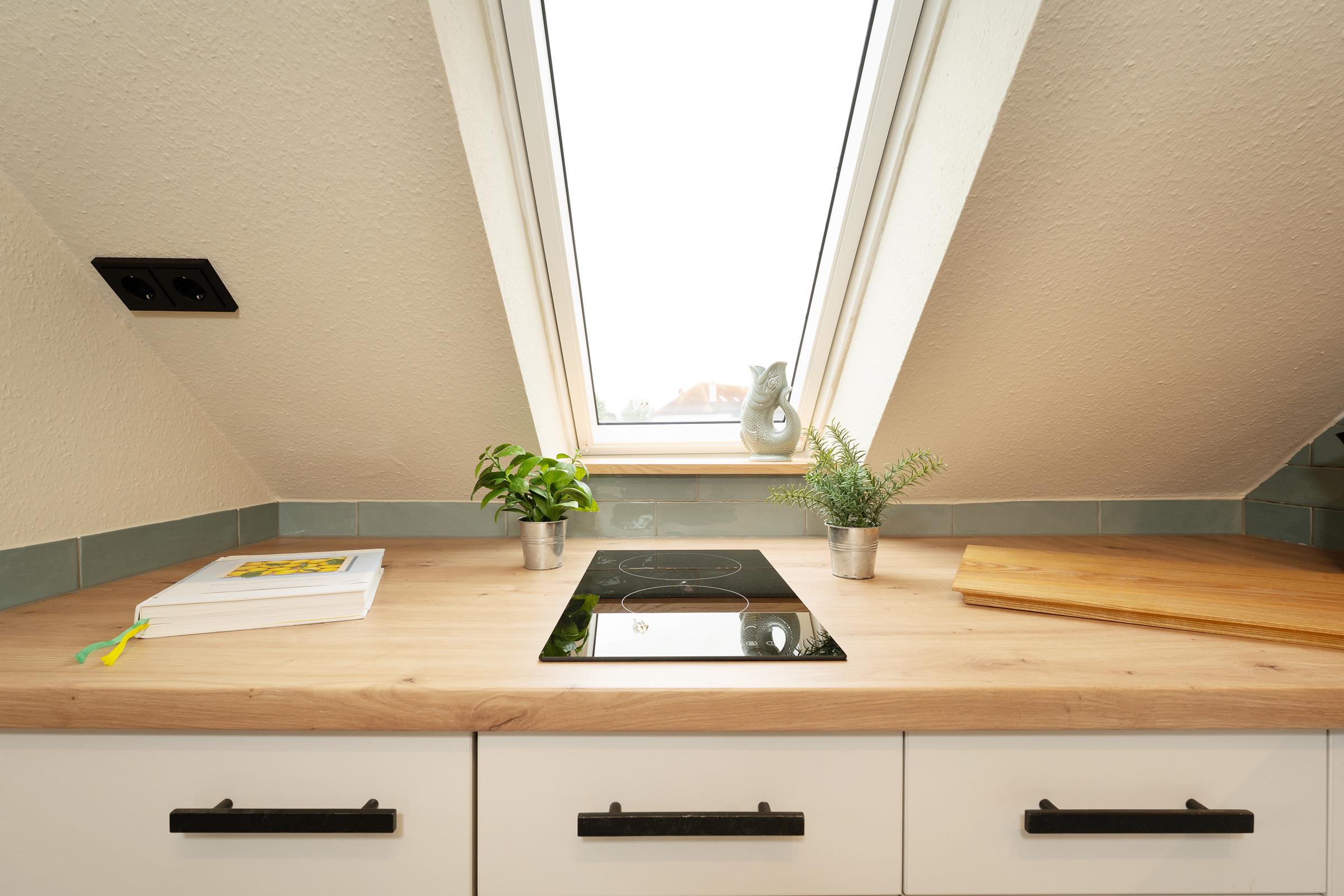 Die offene Küche ist modern ausgestattet mit Cerankochfeld, Mikrowelle, Kühlschrank mit Gefrierfach, Kaffeemaschine, Toaster und Spülmaschine. Der Essbereich bietet Platz für gesellige Mahlzeiten.