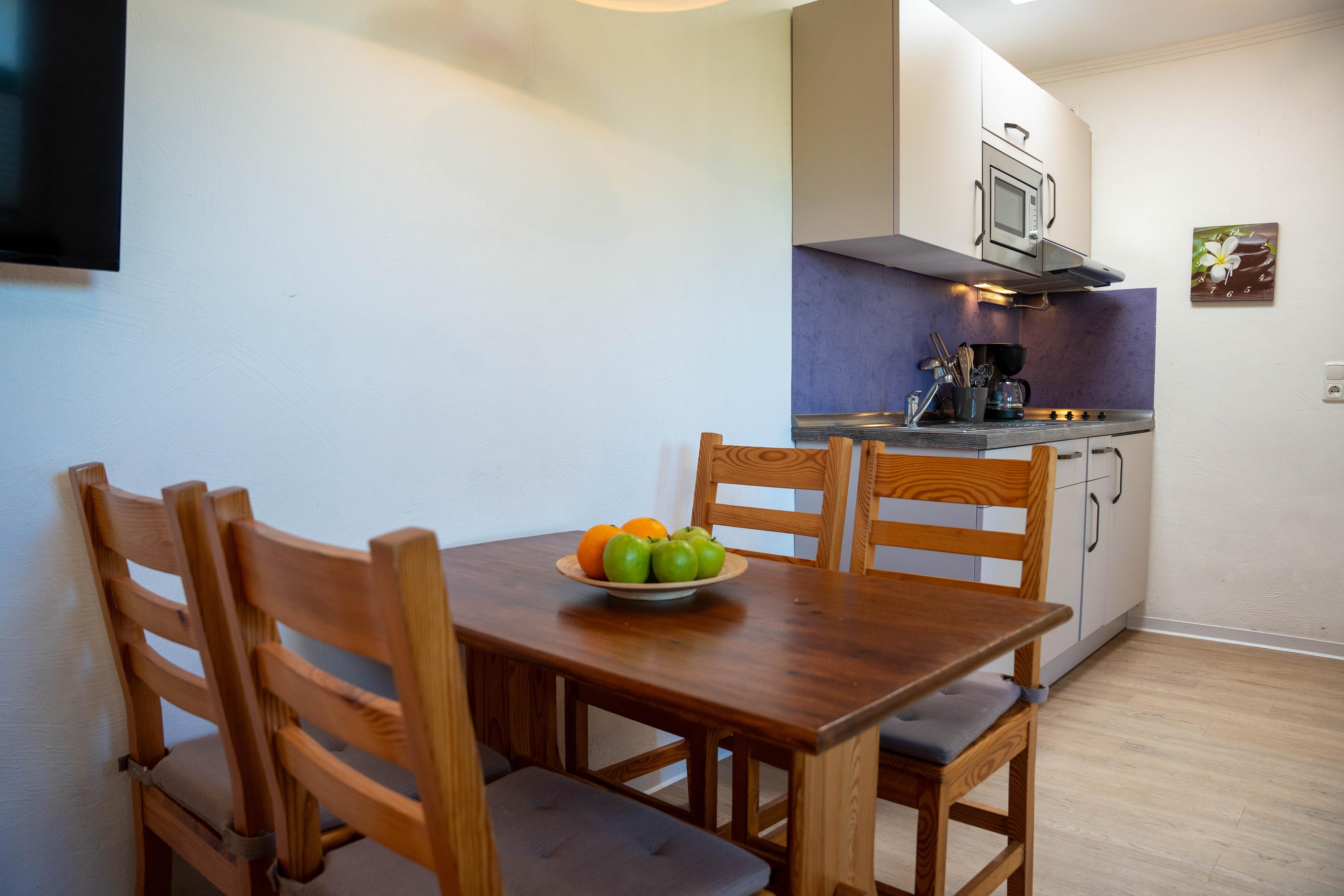 Der Bungalow verfügt über ein Schlafzimmer mit einem Doppelbett (180 x 190 cm) sowie einen separaten Schlafraum mit einem Etagenbett (90 x 190 cm). Die offene Küchenzeile ist mit einem Geschirrspüler ausgestattet. Im Wohnbereich können Sie auf der Couch entspannen. .Die Einrichtung ist funktional, und es gibt eine Sitzecke für bis zu vier Personen, perfekt für gemeinsame Mahlzeiten oder entspannte Abende. Im Außenbereich gibt es eine kleine Terrasse, wo sie entspannen können.