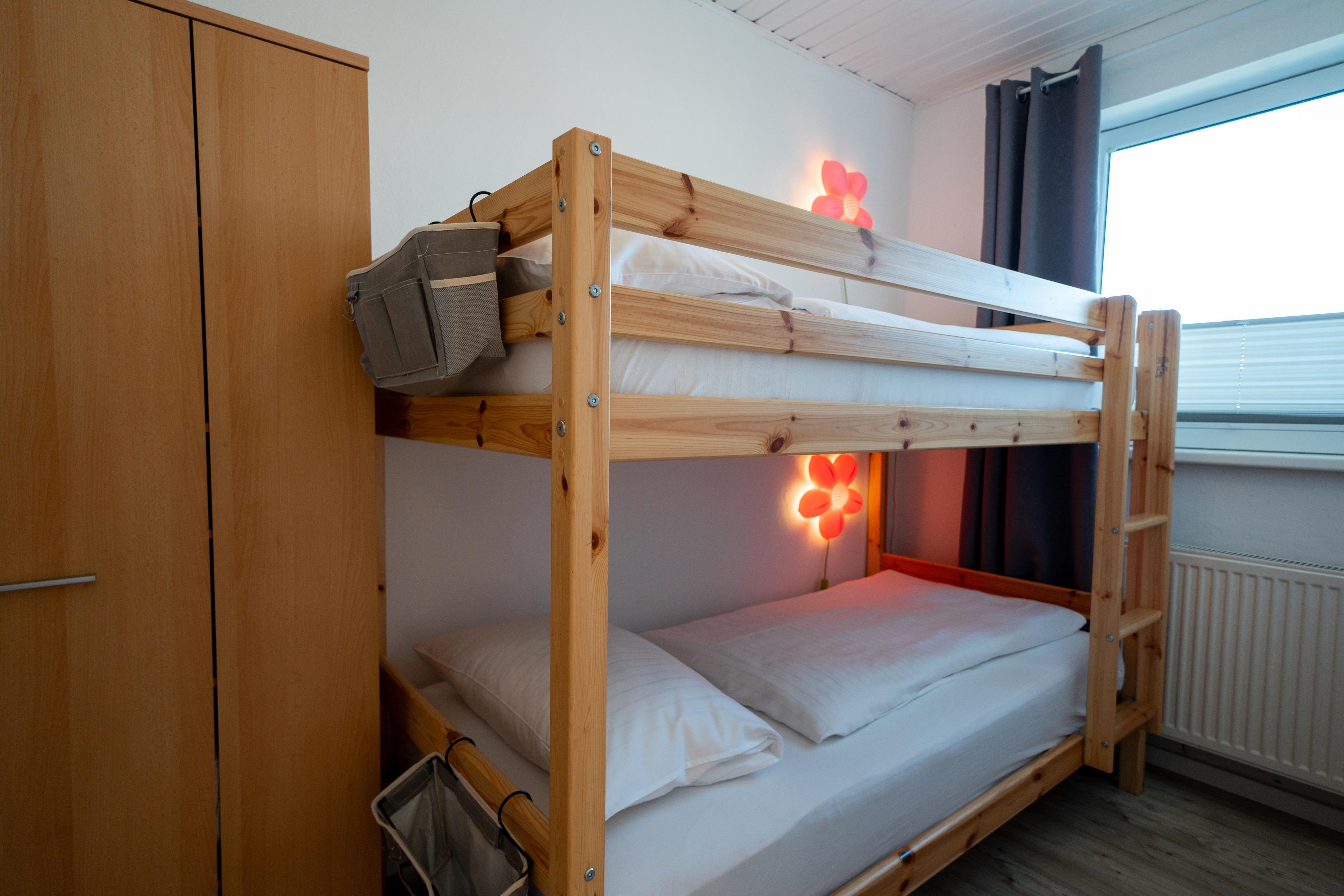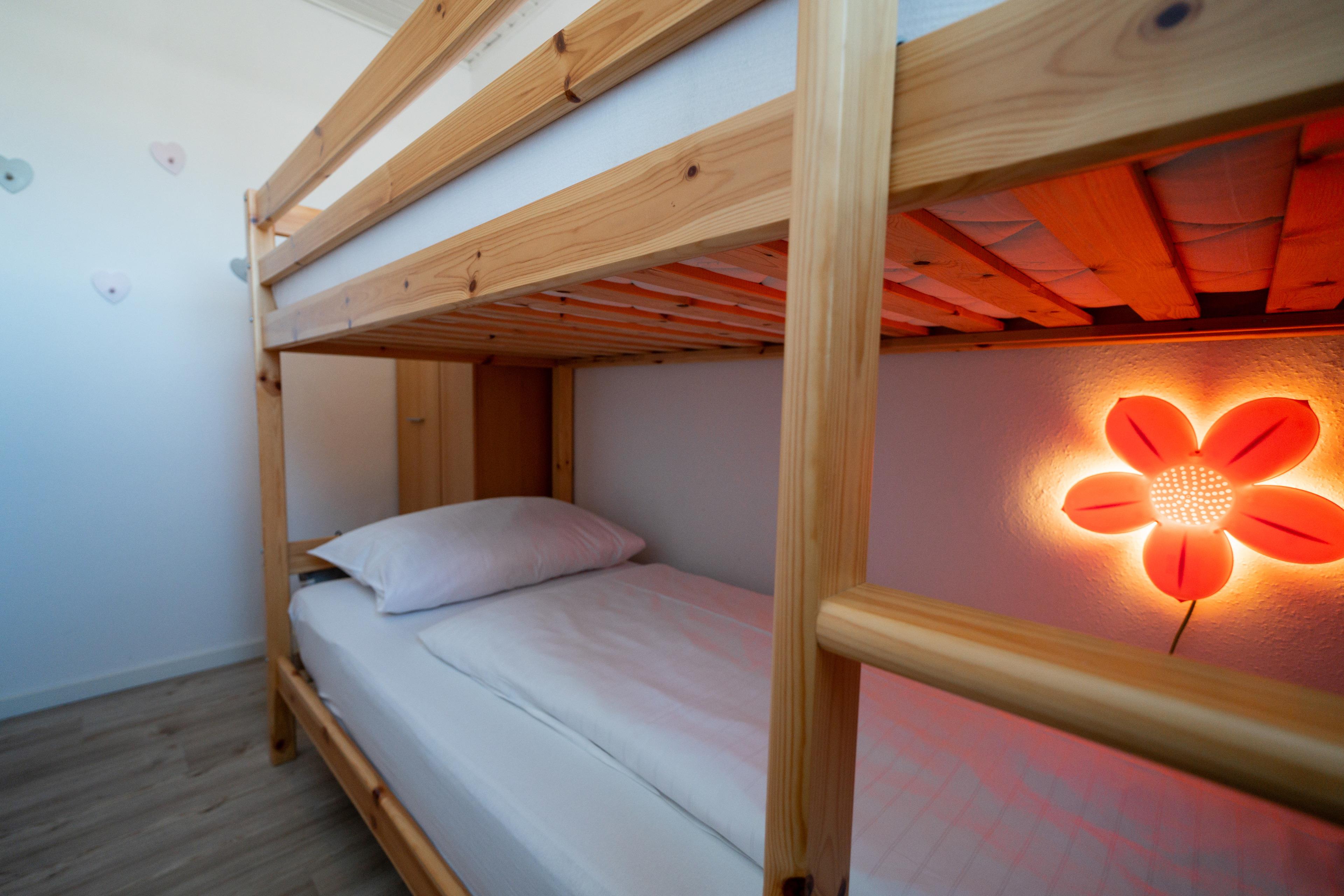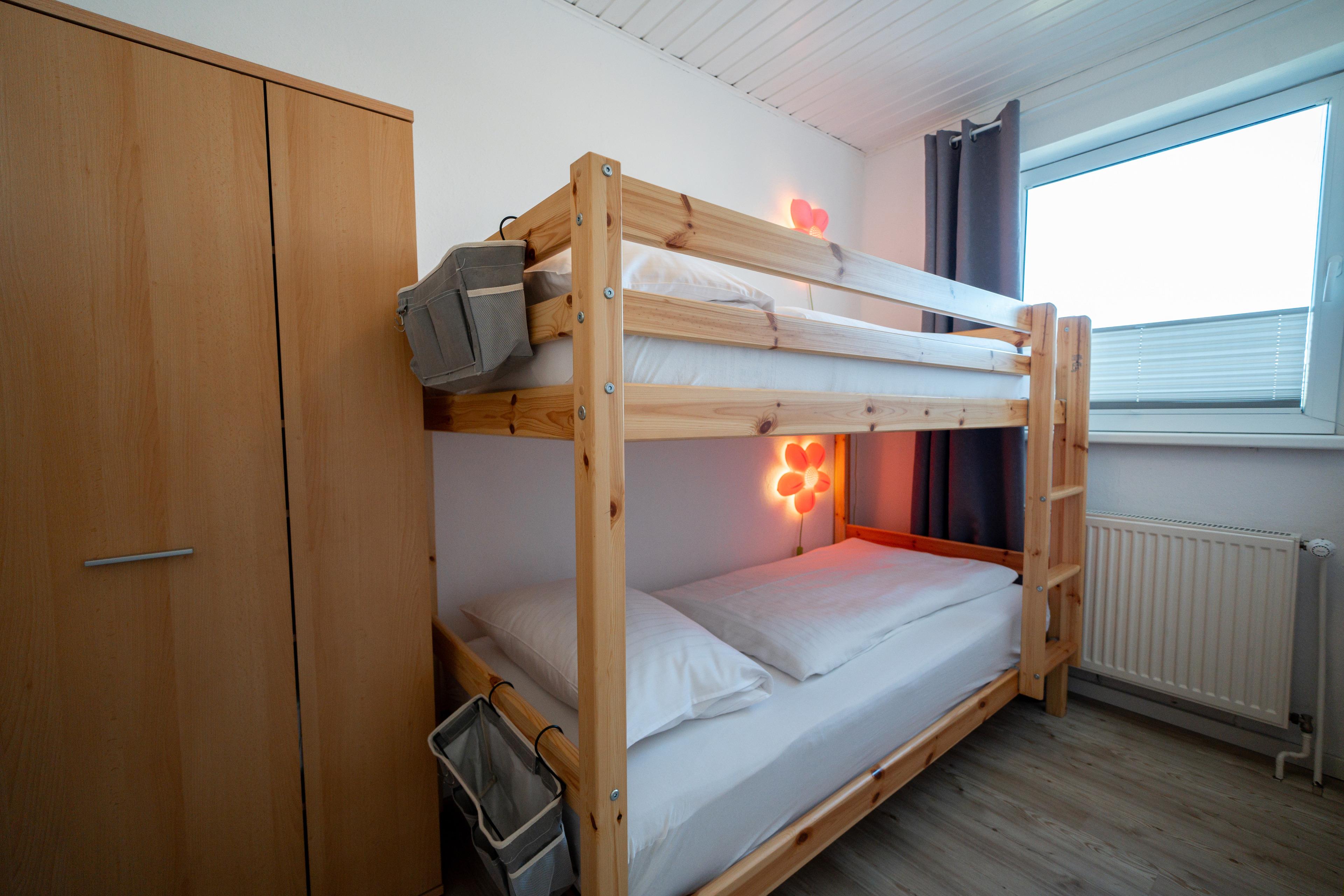 Den Mittelpunkt der Wohnung bildet der offene Wohn-/Ess- und Kochbereich. Hier trifft sich die Familie auf der großen gemütlichen Couch mit Flachbild-TV oder am Esstisch zum gemeinsamen Spielen. Loggen Sie sich über den kostenlosen WLAN-Anschluss ein, um auch im Urlaub erreichbar zu bleiben. In der gut ausgestatteten Küche können Sie Ihre Lieben mit selbst zubereiteten Köstlichkeiten versorgen. Zu der Wohnung gehört eine kleine eingezäunte Terrasse. Im Hauptschlafzimmer mit bequemem Doppelbett (2x 90x200 cm) können Sie sich nach einem ereignisreichen Urlaubstag erholen und Kraft für den neuen Tag tanken. Das 2. Schlafzimmer beinhaltet 1 Etagenbett ( 90 x 200 ) , mit Kleiderschrank. Das hell geflieste Duschbad komplettiert die Ausstattung dieser schönen Ferienwohnung.