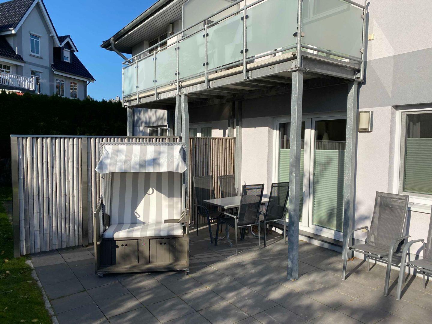 Diese Parterrewohnung für insgesamt bis zu vier Personen befindet sich in einer schönen Doppelhaushälfte mit zwei Wohneinheiten. Die bestuhlte Terrasse mit Gartennutzung lädt zum Verweilen ein. Wohnzimmer mit Schlafsofa (1 x 180x200 cm) und offener Küche, die mit modernsten Elektrogeräten ausgestattet ist. Ein Schlafzimmer mit Doppelbett (2 x 90x200 cm) und das moderne Tageslichtduschbad lassen keine Wünsche übrig. BluRay-Player, HiFi mit Ipod Docking und Verdunklungsvorhänge ergänzen die Komfortausstattung dieser strandnahen Wohnung. Waschmaschine und Trockner stehen dem Gast zur Verfügung. Fahrradunterstellplatz im Gartenhaus auf dem Grundstück. Ein Strandkorb schützt Sie auf der Terrasse vor der Sonne und lässt Sie gemütlich sitzen. Ein PKW-Stellplatz mit kostenpflichtiger Wallbox steht Ihnen direkt vor dem Haus zur Verfügung.
