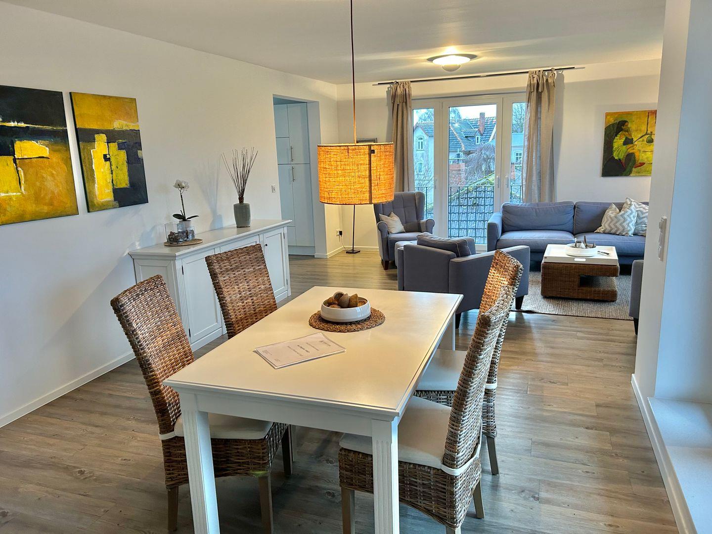 Erleben Sie Ihren Urlaub in einer exklusiven Penthousewohnung – strandnah, zentral und ruhig am Kurpark gelegen! Genießen Sie zwei helle Schlafzimmer mit Verdunkelungsvorhängen (alle Betten haben die Abmessung 90x200 cm), ein modernes Badezimmer, mit Waschbecken, Badewanne und Dusche sowie ein separates WC. Das großzügige, lichtdurchflutete Wohn-/Esszimmer mit offener Küche und modernster Ausstattung lädt zum Wohlfühlen ein. Fußbodenheizung in allen Räumen sorgt für Komfort zu jeder Jahreszeit.
