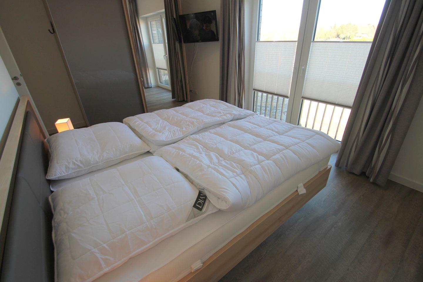 Tolle Lage, fast direkt am Strand. Moderne Ferienwohnung auf gehobenem Niveau für bis zu vier Personen, barrierefrei im 1. OG gelegen und nur zirka 100 Meter vom Strand entfernt. Das Ortszentrum liegt nur etwa 500 mtr. entfernt. Die Wohnung verfügt über ein Schlafzimmer mit Doppelbett und TV und ein Schlafzimmer mit zwei Einzelbetten. Das Wohnzimmer ist mit einer Couchgarnitur, Flachbild-TV, gemütlichem Esstisch und einer offenen Einbauküche mit Ceranfeld, Backofen und Geschirrspüler eingerichtet. Der möblierte Süd-Balkon mit Strandkorb schließt sich hier an. Diese Wohnung verfügt zudem über ein modernes Duschbad und eine Diele. Der Waschtrockner steht Ihnen kostenfrei zur Verfügung. Der eigene Pkw-Außenstellplatz, der Fahrstuhl und ein Fahrradschuppen runden den Komfort dieser Nichtraucher-Ferienwohnung ab. Genießen Sie die Gemütlichkeit und allen Annehmlichkeiten, den diese Ferienwohnung bietet. Hier finden Sie Niveau mit Balkon mit Deichblick .