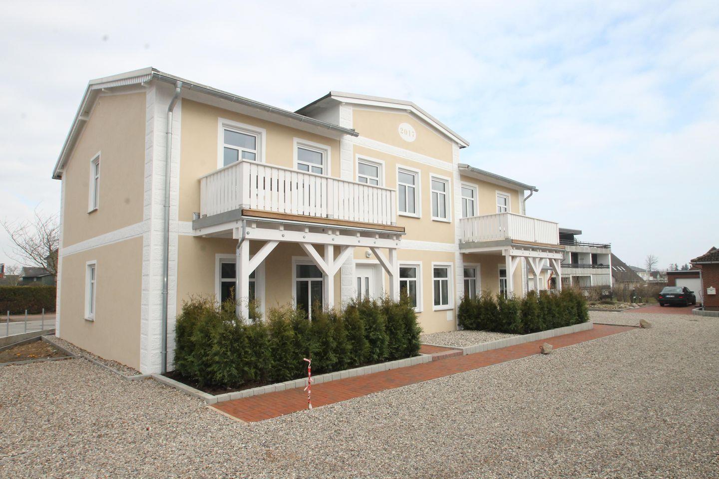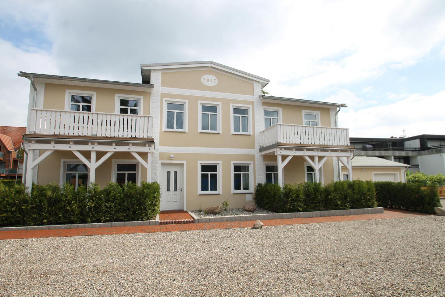 Haus im Stil der Bäderarchitektur. Ferienwohnung im Erdgeschoss mit Terrasse. Über den Eingangsflur gelangen Sie in den Wohnbereich mit offener Küche. Zur Wohnung gehören zwei separate Schlafzimmer - einmal mit Doppelbett (2 x 90x200 cm) und einmal mit zwei Einzelbetten (90x200 cm). Ein separates Tageslichtduschbad und ein Abstellraum ergänzen diese im Landhausstil eingerichtete Wohnung. PKW-Stellplatz auf dem Grundstück. Im Nebengebäude haben die Hausgäste die Möglichkeit die Waschmaschine und den Trockner gegen Gebühr zu nutzen. Ein lieber Hund ist herzlich willkommen.