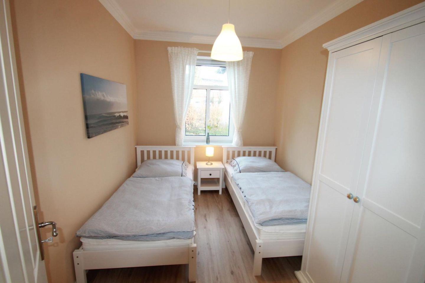 Genießen Sie Ihren Urlaub in unserer liebevoll im Landhausstil eingerichteten Ferienwohnung im Erdgeschoss eines Hauses im Stil der Bäderarchitektur. Die Wohnung bietet auf 65 m² Platz für bis zu 4 Personen und verfügt über 3 Zimmer, darunter zwei separate Schlafzimmer – eines mit Doppelbett (2 x 90x200 cm) und eines mit zwei Einzelbetten (90x200 cm).