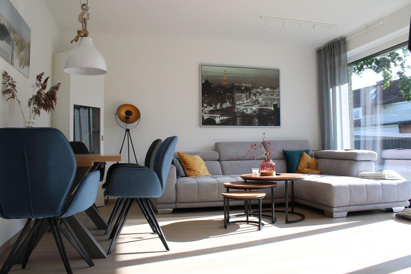 Moderne, geschmackvolle Ferienwohnung mit Elektrokamin und großer Terrasse, 2 Schlafzimmer und 130 m zum Strand