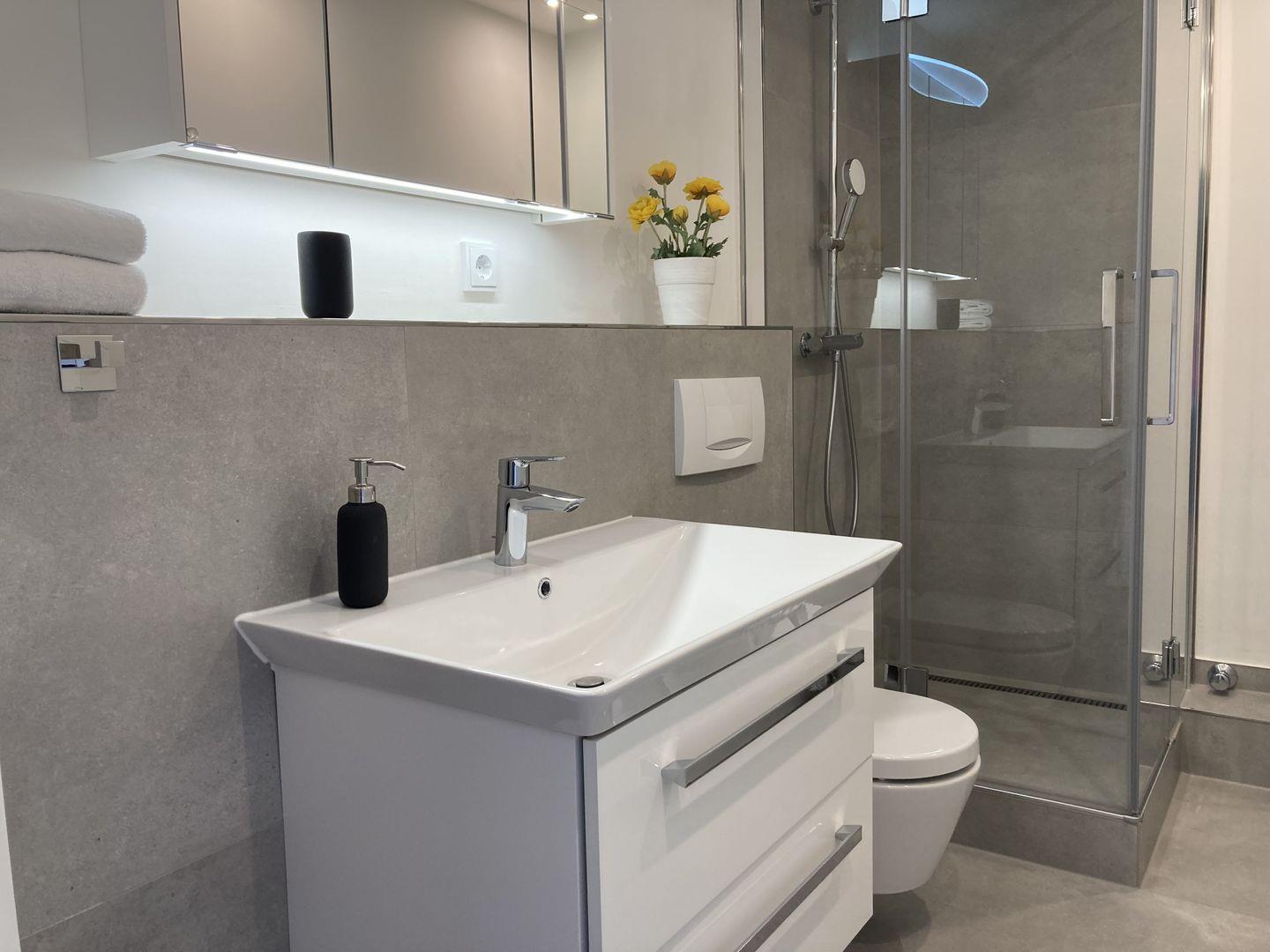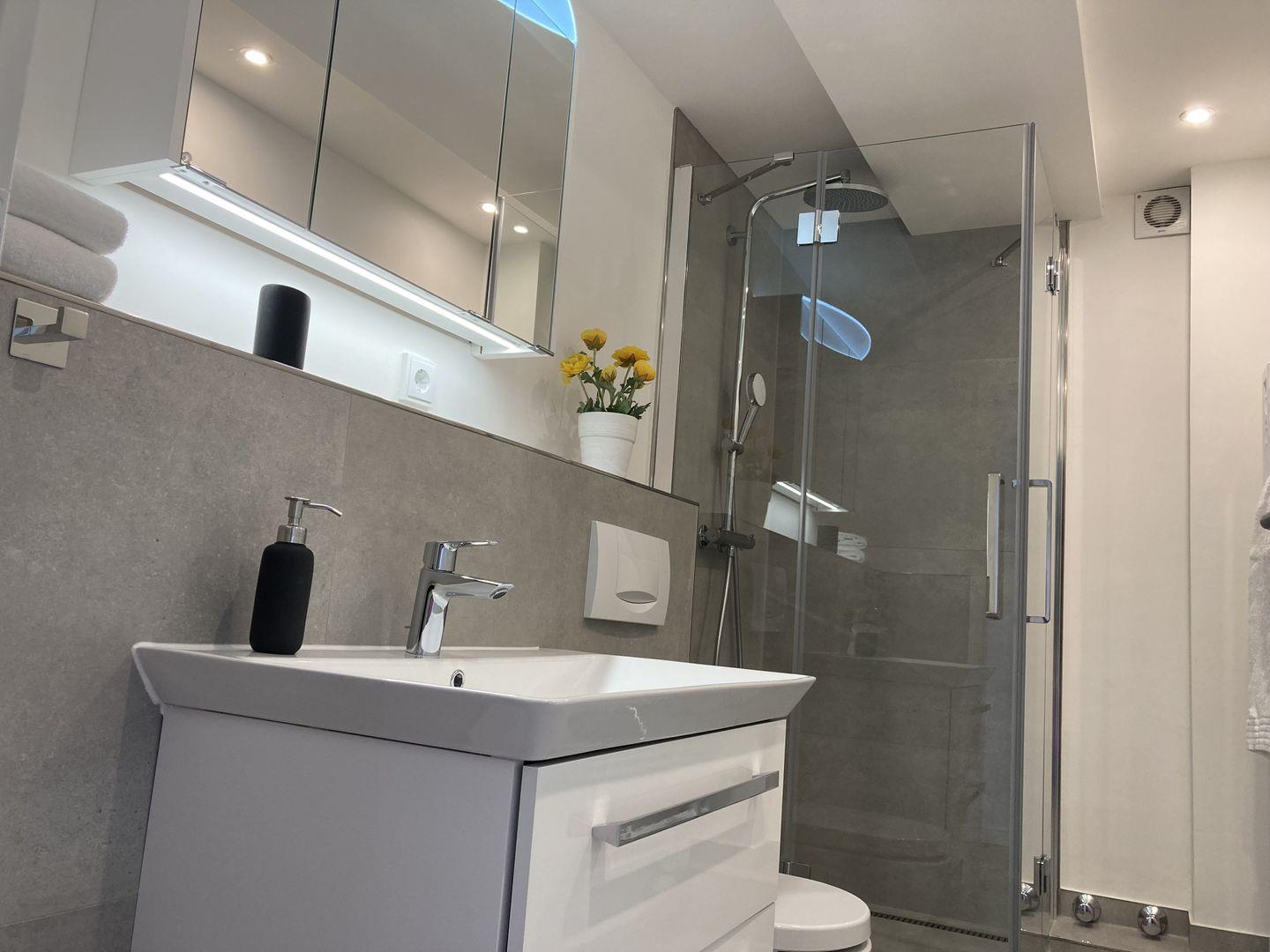 - tageslichthelles Badezimmer mit Dusche, WC und Föhn