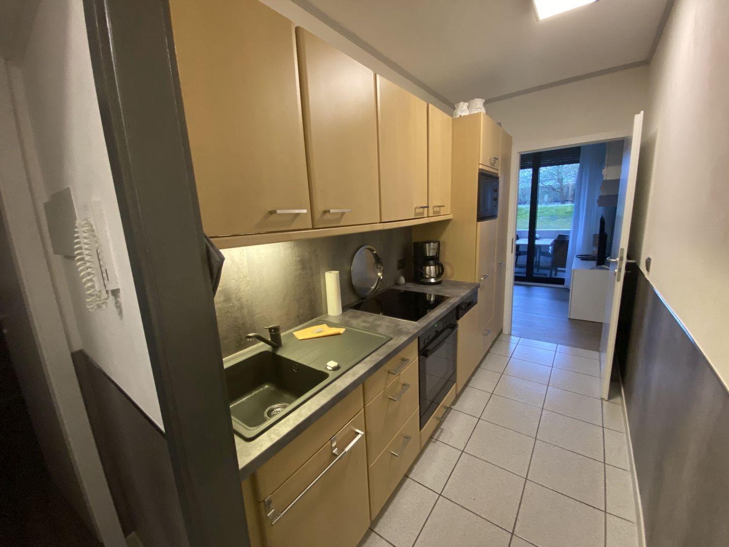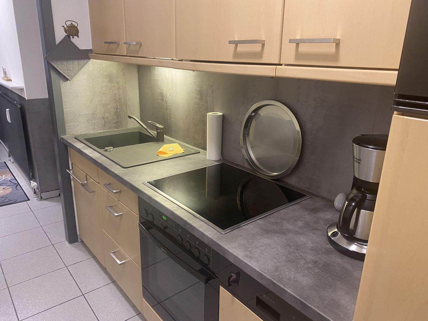 - voll ausgestattete Küche im Durchgang zum Wohnzimmer mit Geschirrspüler, Backofen, Kühlschrank mit Gefrierfach
