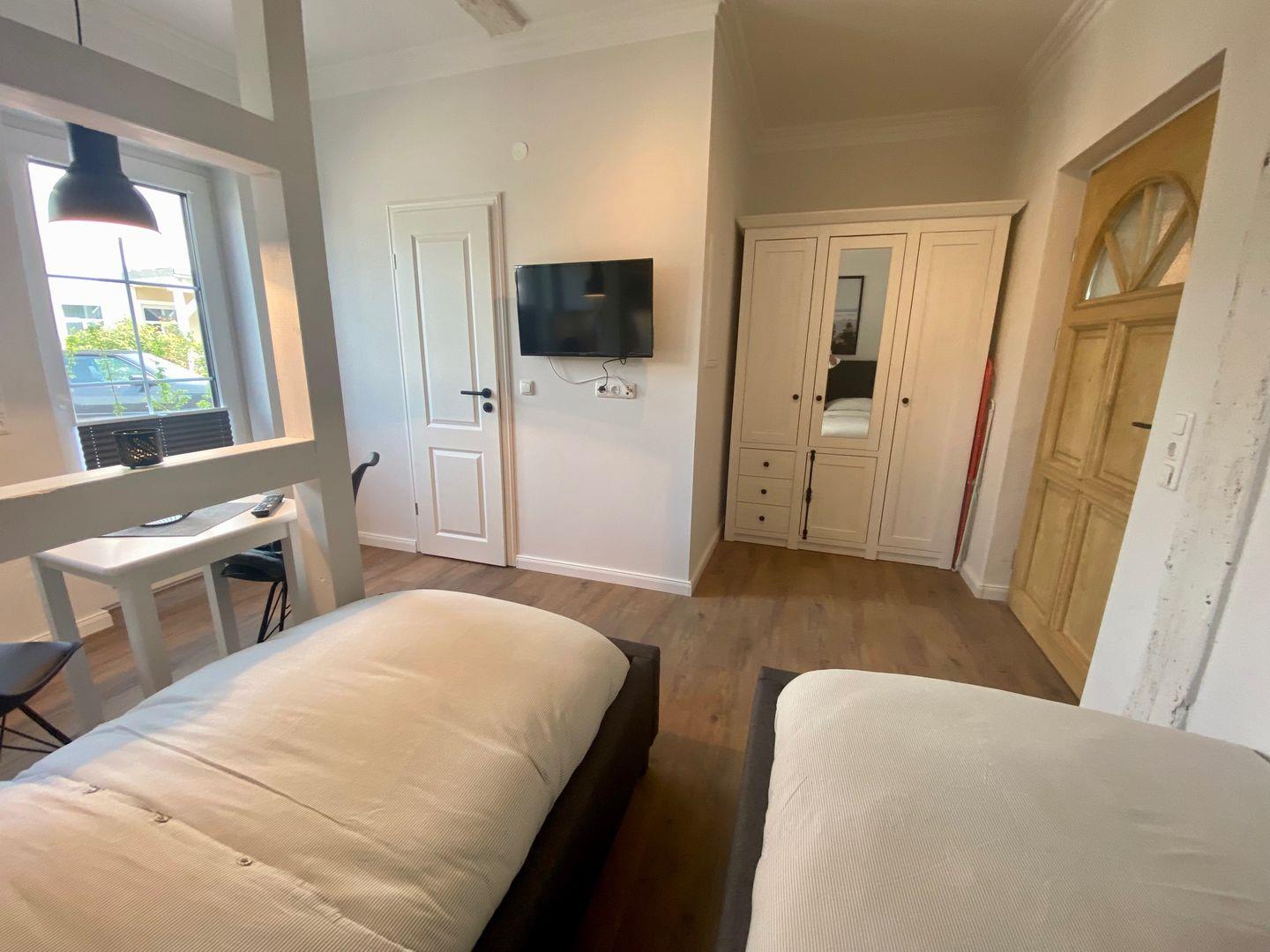 Diese ehemalige Remise wurde behutsam renoviert. Die lässig-modern gehaltenen Innenräume wurden liebevoll im urbanen Landhausstil gestaltet. Bei der Einrichtung wurde großer Wert auf Komfort gelegt. Farben und Materialien sind harmonisch aufeinander abgestimmt. Im Objekt gibt es insgesamt 5 Appartements. Das Herzstück bildet ein Saal mit großem Esstisch für 12 Personen. Daher eignet sich dieses Objekt auch sehr gut für einen Urlaub mit mehreren kleinen Familien, die auch mal gerne zusammen sitzen möchten. Das Appartement Möwennest empfängt Sie mit einem offenen Wohn / Schlaf- und Küchenbereich und hält ein modernes Bad für Sie bereit. Es erwarten Sie 2 Einzelbetten (je 90x200 cm) ein Kleiderschrank und TV. Genießen Sie die Ruhe und den charmanten Hofcharakter auf Ihrer eigenen, möblierten Terrasse. Der WLAN-Anschluss ist inklusive.