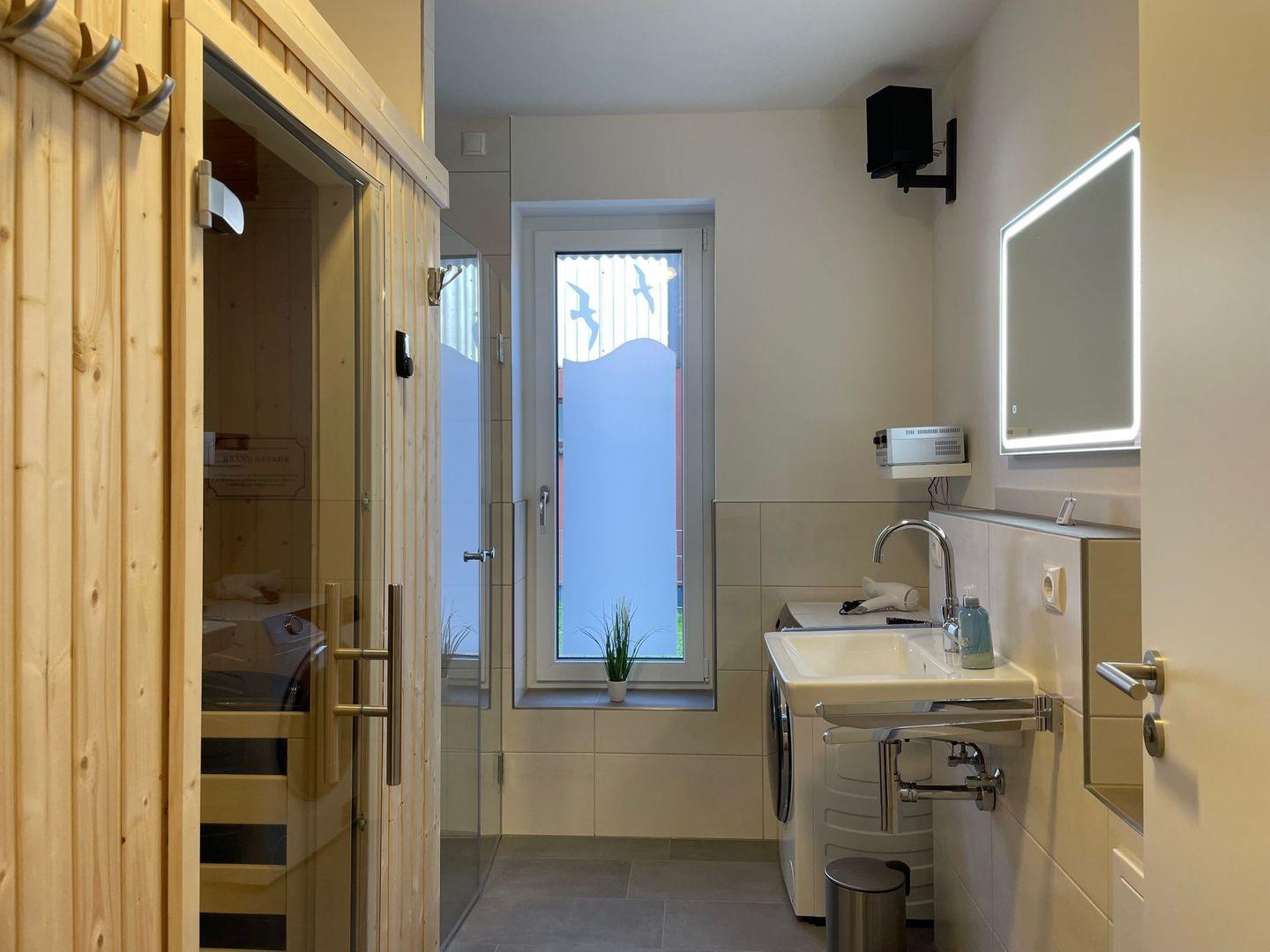 - ein geräumiges Bad mit Fenster, finnischer Sauna bodentiefer Dusche mit Bonanza - Tür