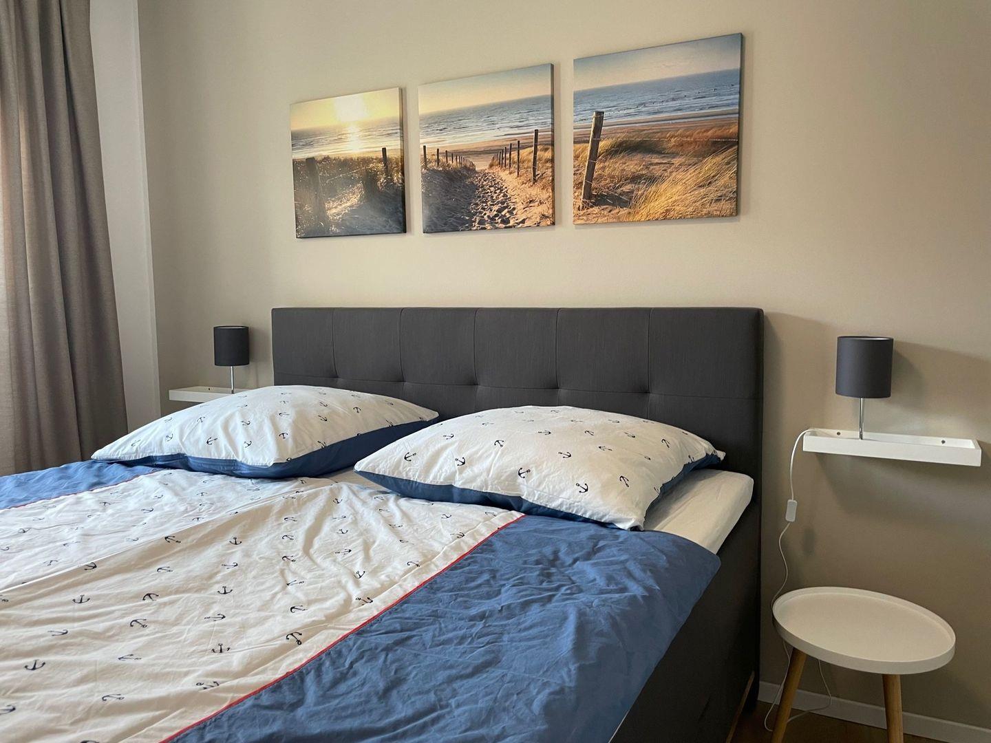 - zwei Schlafzimmer mit je einem hochwertigen Boxspringbett (2 Einzelmatratzen 90 x 180 cm mit durchgängigem Matratzenschoner 180x200 cm), Kleiderschrank und TV