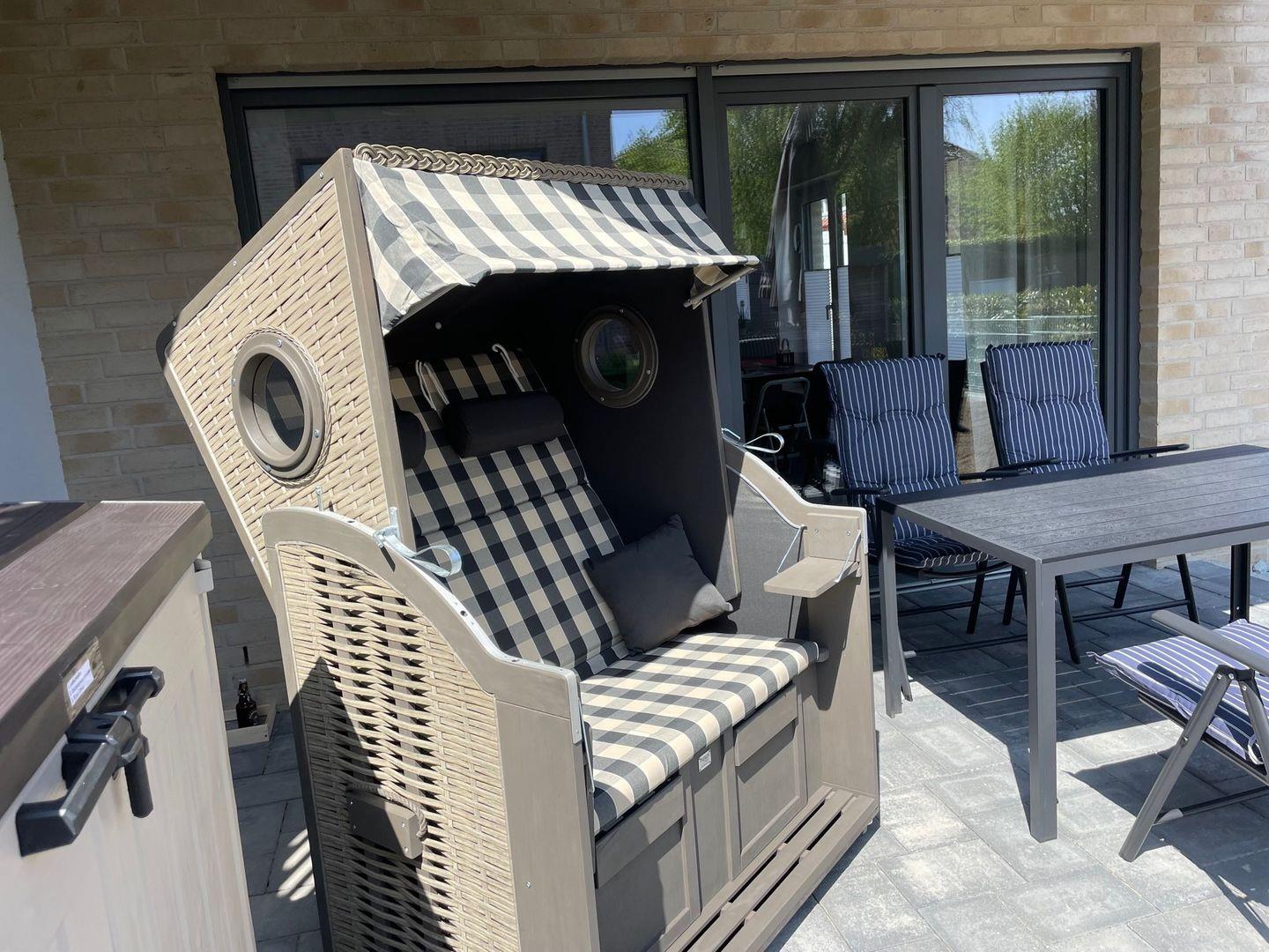 - geschützte ruhig gelegene nicht einsehbare überdachte möblierte Terrasse mit Strandkorb