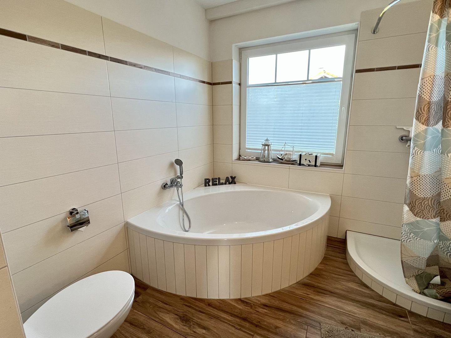 - helles Badezimmer mit Badewanne, Dusche, WC und Waschmaschine