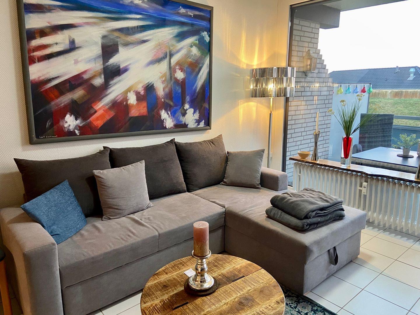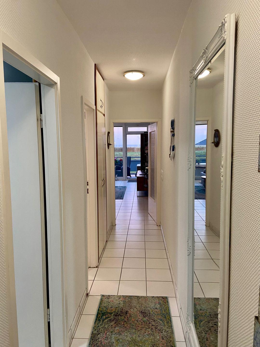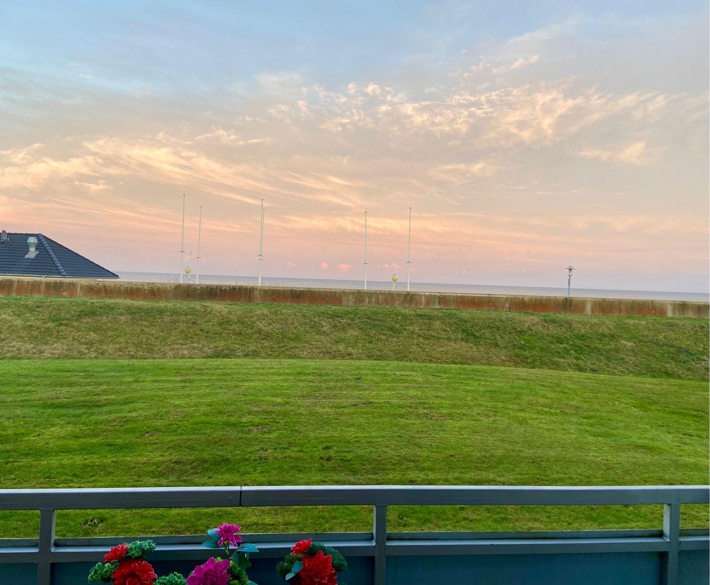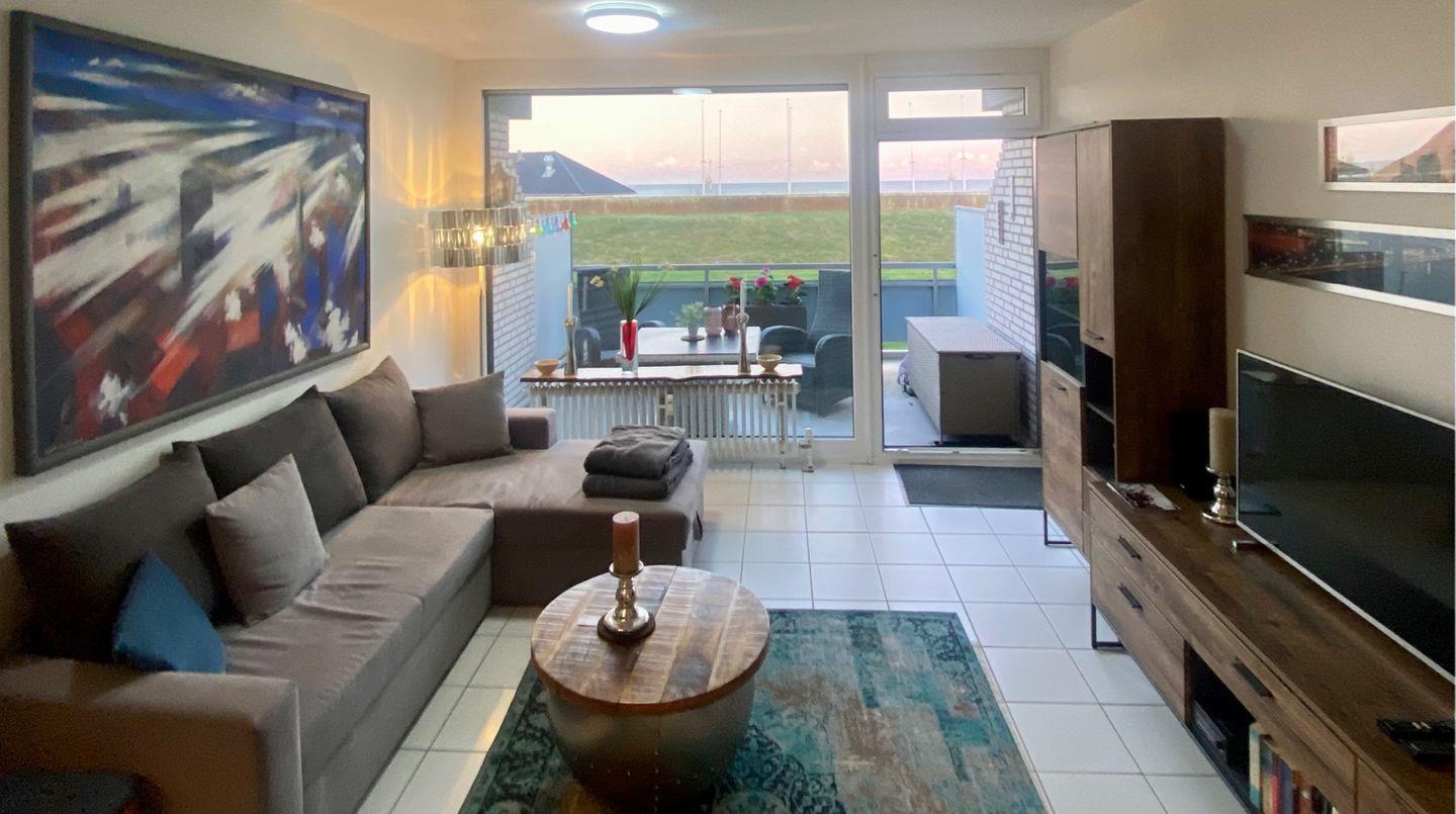 Bezaubernde 2 Zimmer Ferienwohnung mit Meerblick in der ersten Reihe, geschützt vom Deich, wenige Meter vom feinen Sandstrand und der Strandpromenade entfernt.