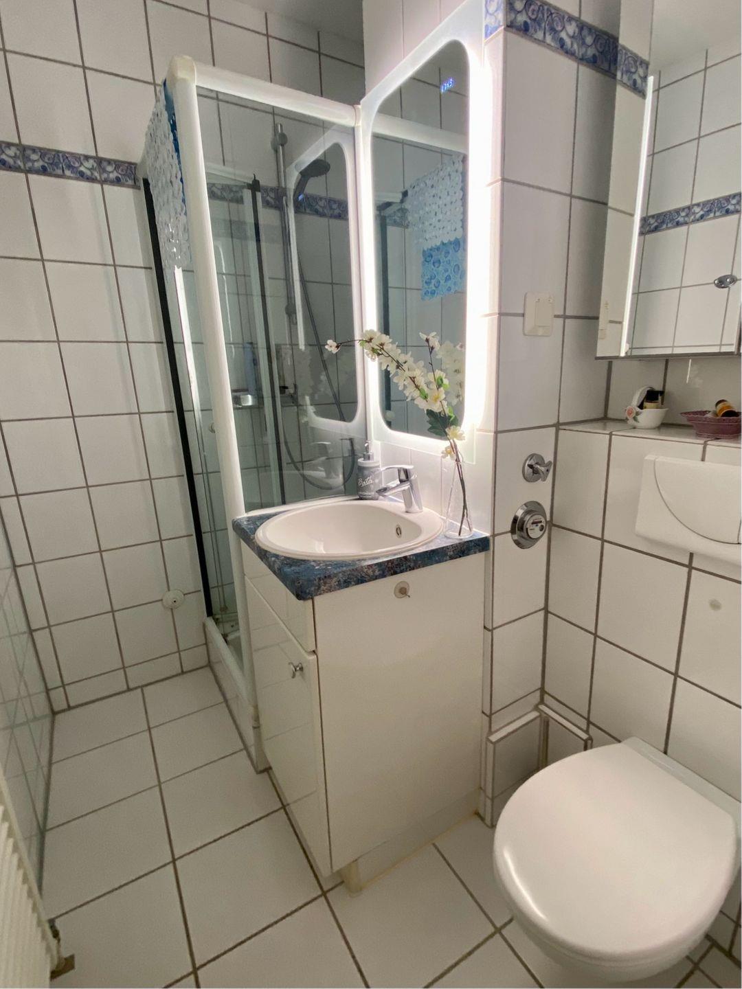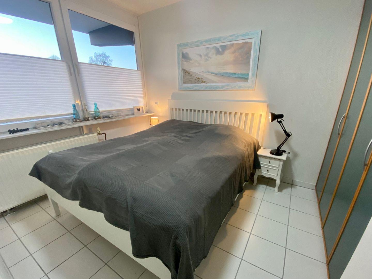 Das separate Schlafzimmer ist mit einem Doppelbett (2 x 80x200 cm) einem 3-teiligem, großen Kleiderschrank und Außenrollo ausgestattet. Im weißen Duschbad ist ein Föhn vorhanden sowie ein Spiegelschrank mit Ablagen. In der gesamten Wohnung haben Sie die Möglichkeit die elektrischen Außenrollos zu nutzen.