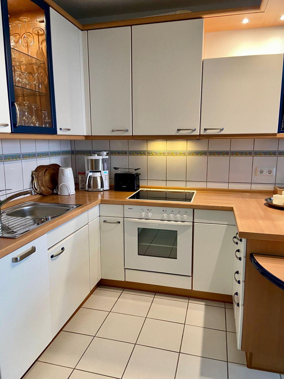 Die lichtdurchflutete Wohnung ist weiß gefliest. Im hellen Wohnraum mit großem Panoramafenster zu Balkon und Meer finden Sie ein Schlafsofa, einen Flachbild-TV und eine kleine Stereoanlage. Die offene Küche ist gut ausgestattet mit Kühl-Gefrierkombi, Spülmaschine, Cerankochfeld und Backofen, Kaffeemaschine, Wasserkocher, Toaster und halb-rundem Esstisch an dem 3 Gäste gemütliche Stunden verbringen können.