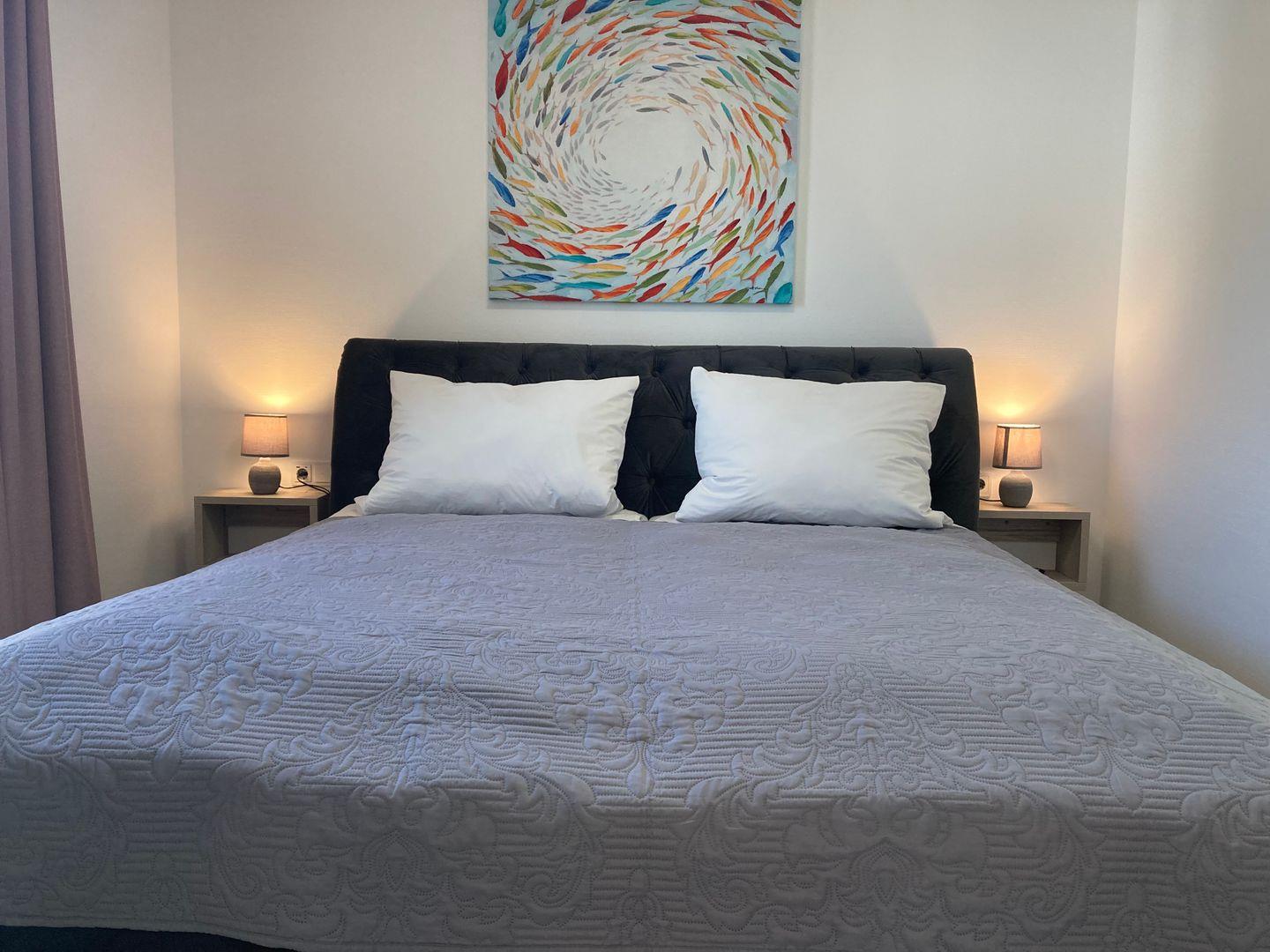 - Schlafzimmer mit hochwertigem Doppelbett, Kleiderschrank und TV,