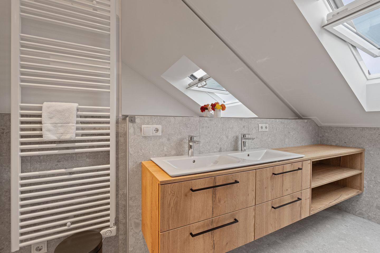 Das Badezimmer ist ein echtes Highlight: ausgestattet mit zwei modernen Waschbecken und einer geräumigen, ebenerdigen Dusche, die Wellnessmomente verspricht. Diese anspruchsvolle Ausstattung schafft eine Atmosphäre, die zum Entspannen und Wohlfühlen einlädt.