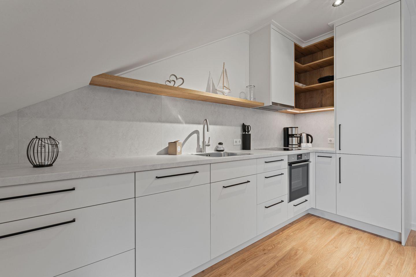 Beim Betreten empfängt Sie ein einladender Flur, der in das helle Wohnzimmer übergeht und einen offenen Übergang zur modernen Küche schafft. Die Küche ist vollständig ausgestattet und durchdacht gestaltet, ideal für gemeinsame Kochabende und gemütliches Beisammensein.