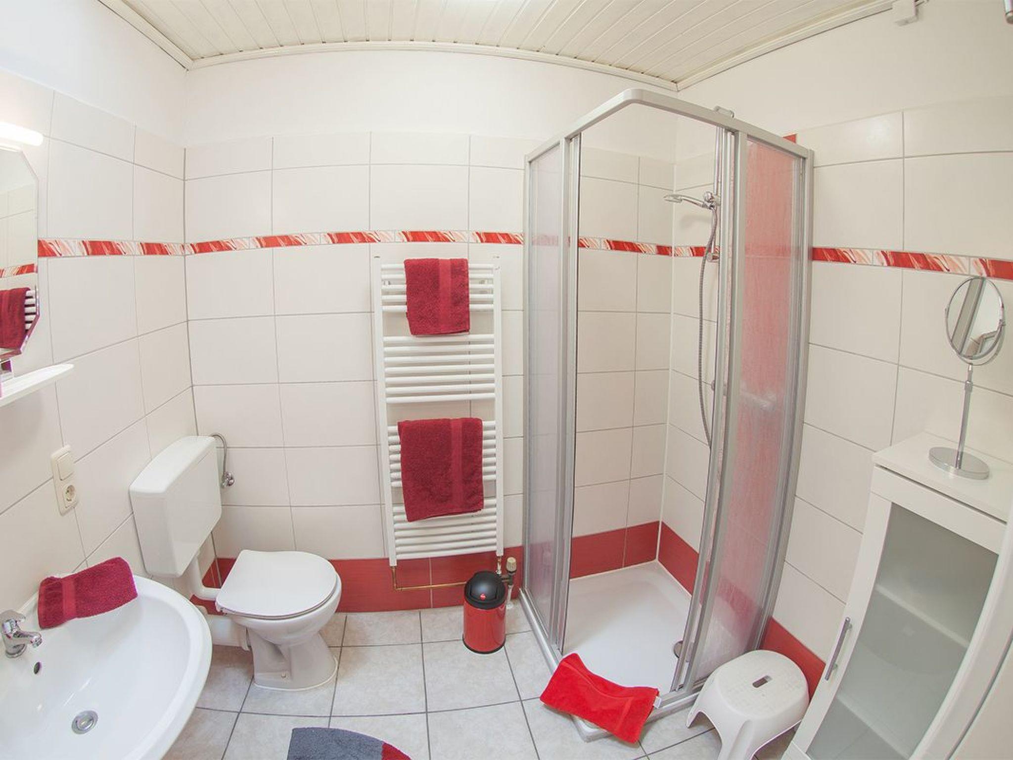 Im Obergeschoss befinden sich zwei Schlafräume und ein Bad mit Dusche und Fenster.