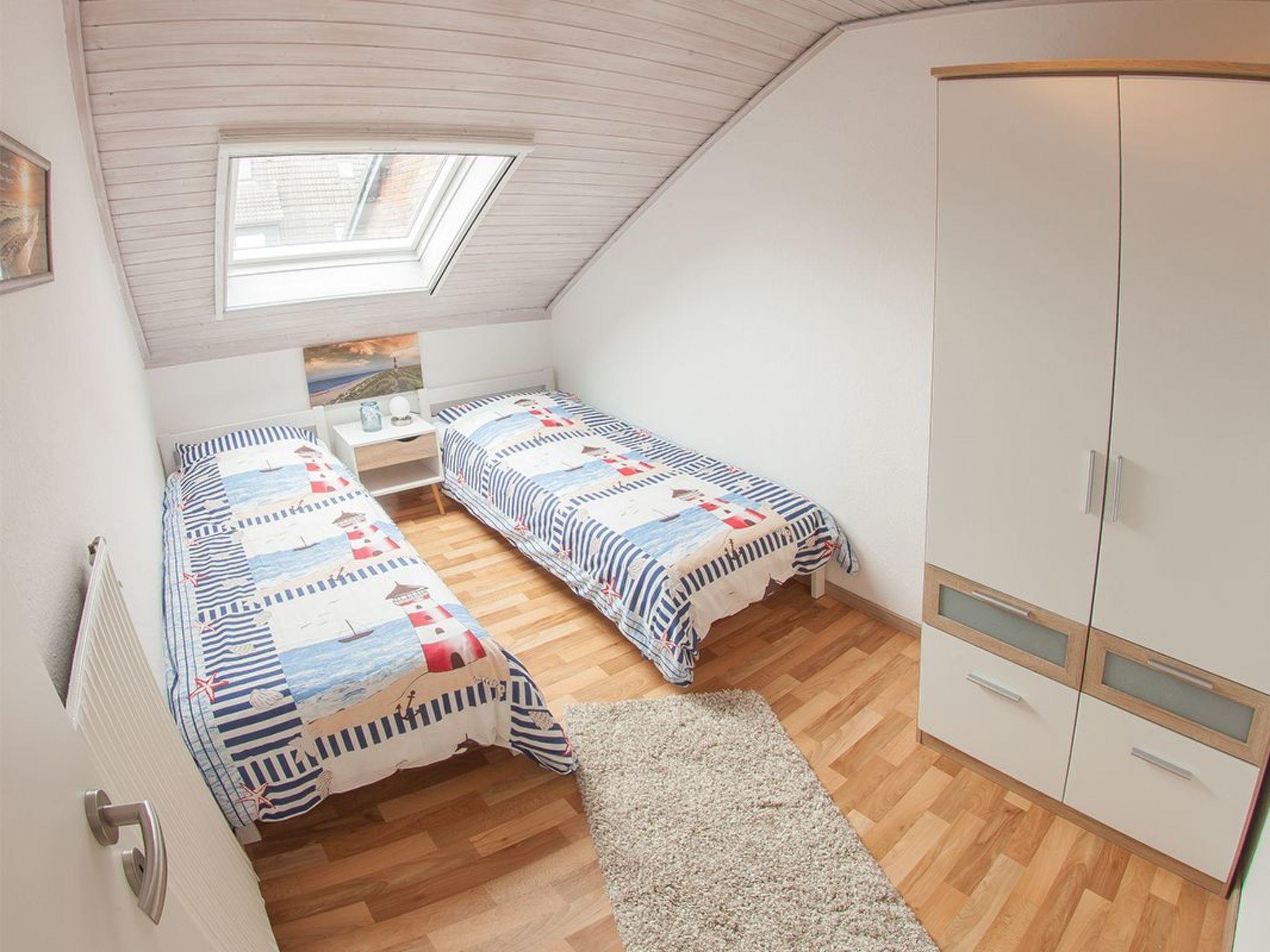 Ein Schlafzimmer verfügt über ein Doppelbett von 1,80 x 2,00 m und das andere Schlafzimmer über zwei Einzelbetten von 1,00 x 2,00 m. Beide Schlafräume sind mit Fliegengitter und Rolladen ausgestattet Auf der gleichen Etage befinden sich eine Waschmaschine und ein Wäschetrockner. Die Benutzung der Geräte sind