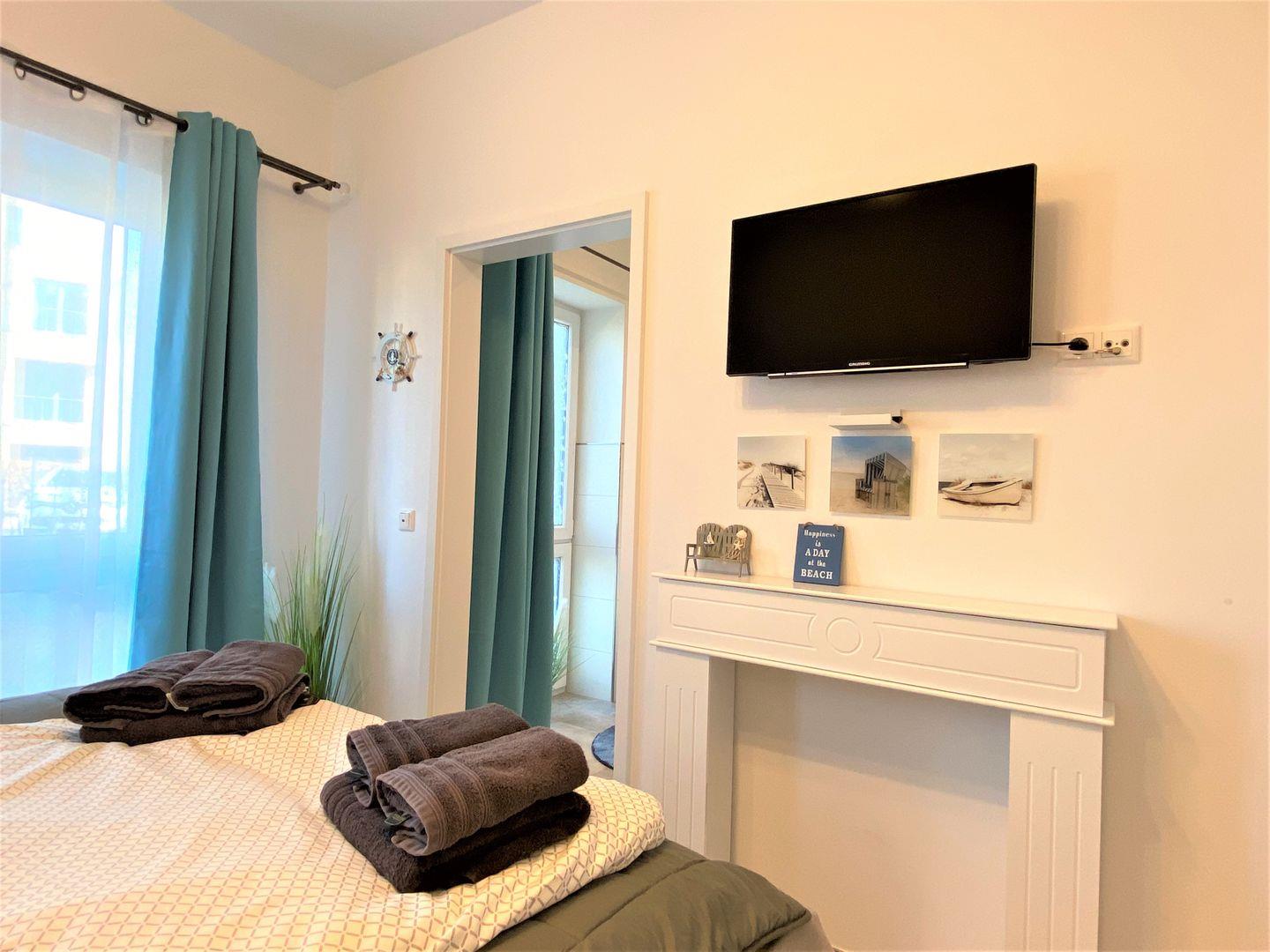 Schlafzimmer: hochwertiges Boxspringbett (Maße: 180 x 200 cm- durchgängige Matratze), Kleiderschrank, Smart-TV.