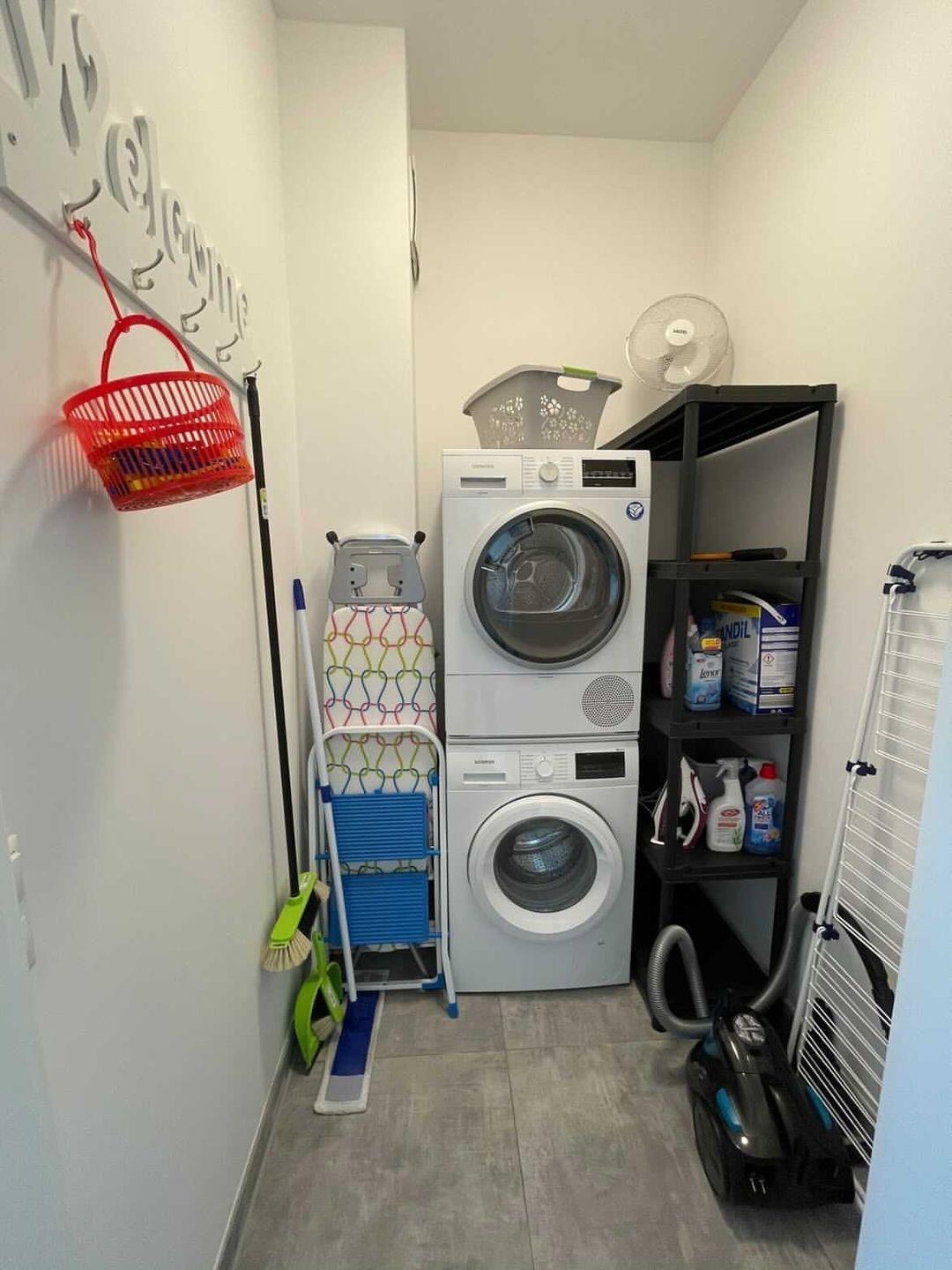 Abstellraum: Siemens Waschmaschine und Siemens Wa¨schetrockner, Rowenta Staubsauger, Leifheit Wa¨scheturm, Severin Bu¨geleisen, Bu¨gelbrett und diverse Putzutensilien