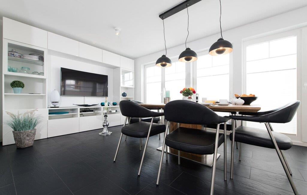 Lichtdurchflutet gestaltet sich der Wohn- /Essbereich des Ferienhauses. Durch die bodentiefe Fensterfront fällt der Blick auf die anliegende