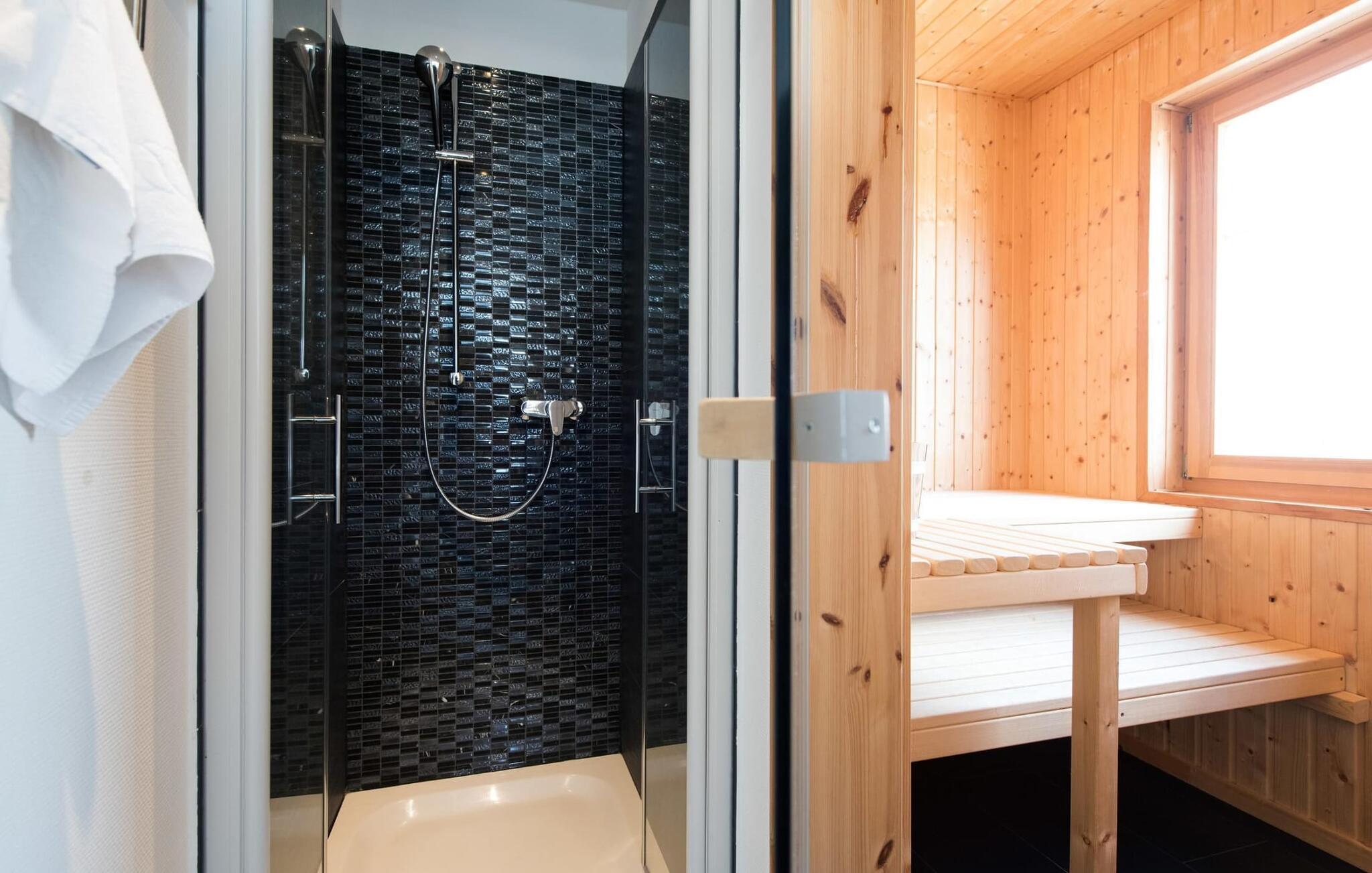 Für das wohltuende Spa-Programm steht auf dieser Ebene außerdem die hauseigene große, finnische Sauna bereit. Für die nötige Abkühlung sorgt die anliegende Dusche.